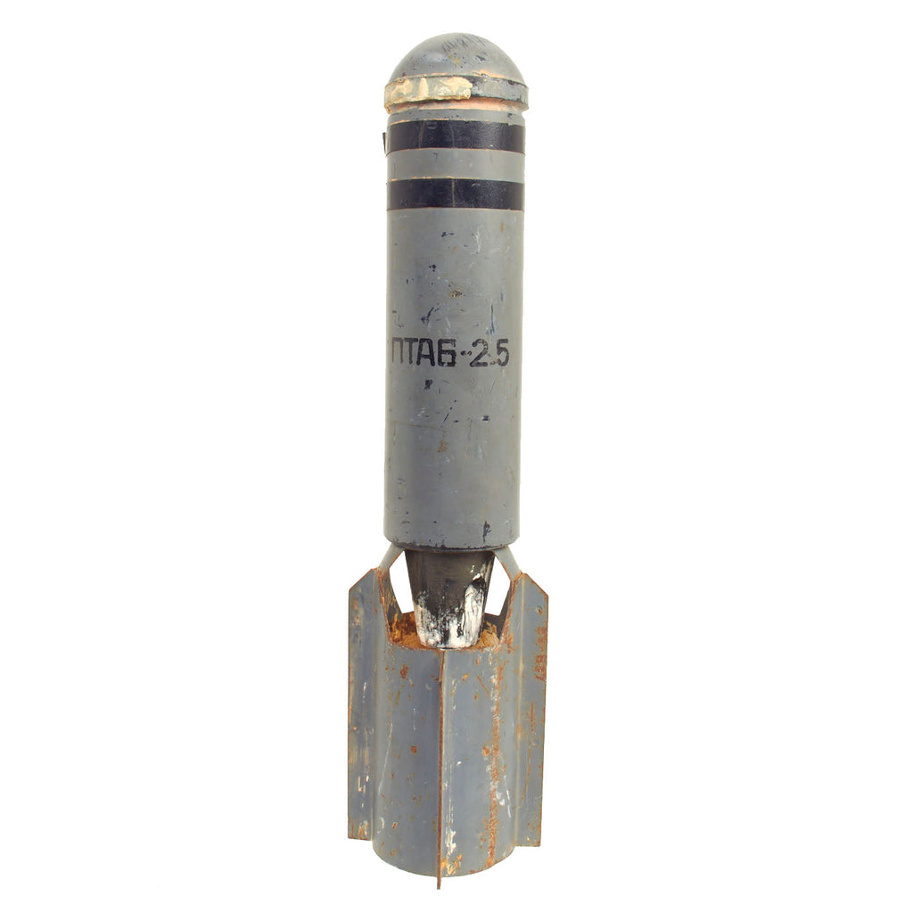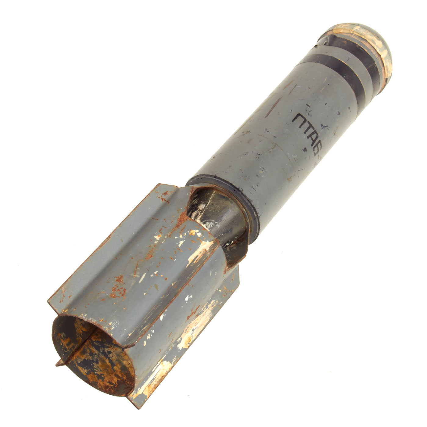 Original Item: Only One Available. PTAB (Russian ПТАБ, short for Противотанковая Авиабомба, "Antitank Aviation Bomb") was a Soviet World War II design of a shaped charge bomb. The bomb was designed within a case of 2.5 kg bomb with real weight of 1.5 kg and 0.62 kg of explosives. The Il-2 ground attack aircraft was capable of carrying 280 PTAB bombs immediately on the bomb-bay folds, or 4x48 in four cassettes. The PTAB 2.5 was capable of penetrating 60 to 70 millimeter tank armor, at the time sufficient for the top-armor of even heavy tanks.