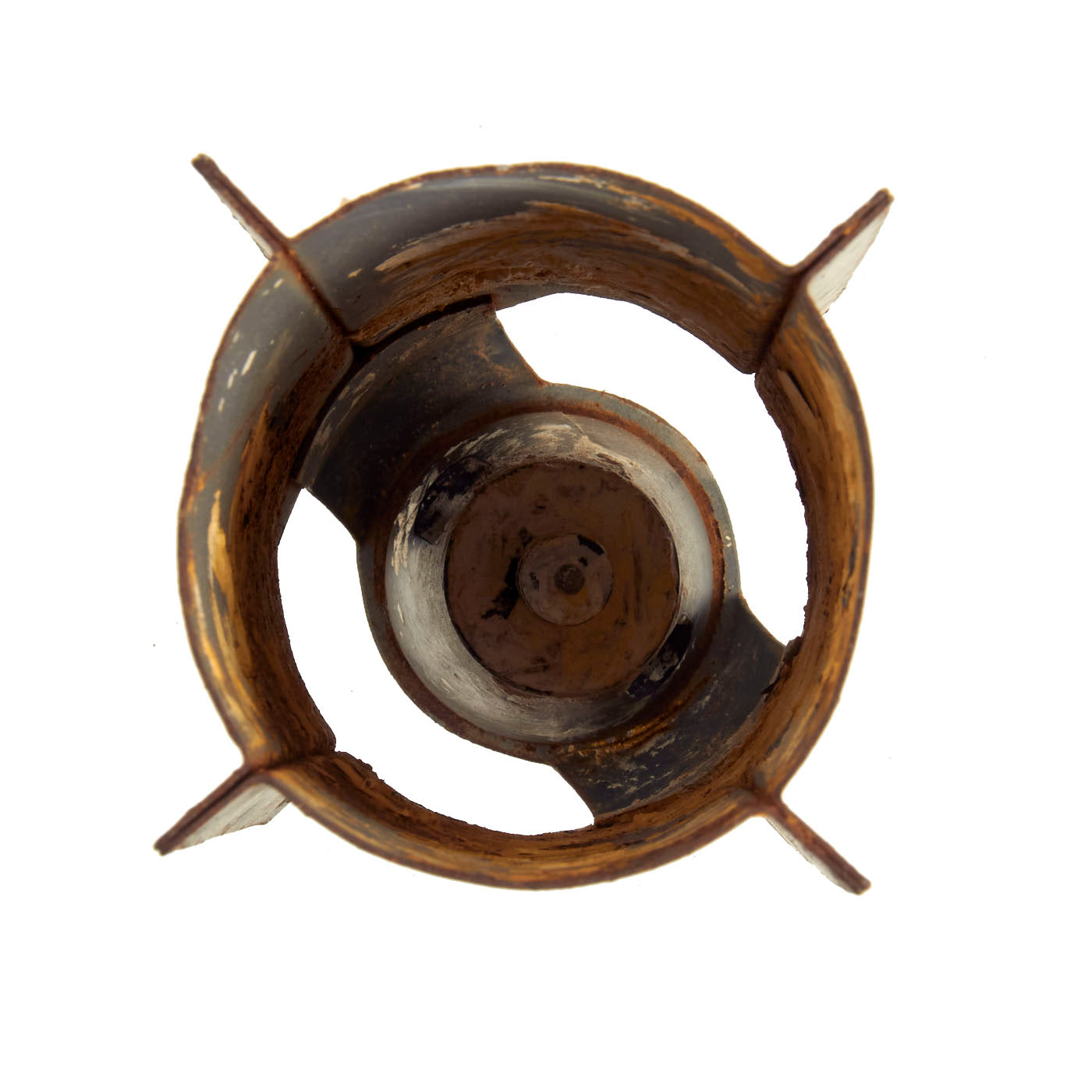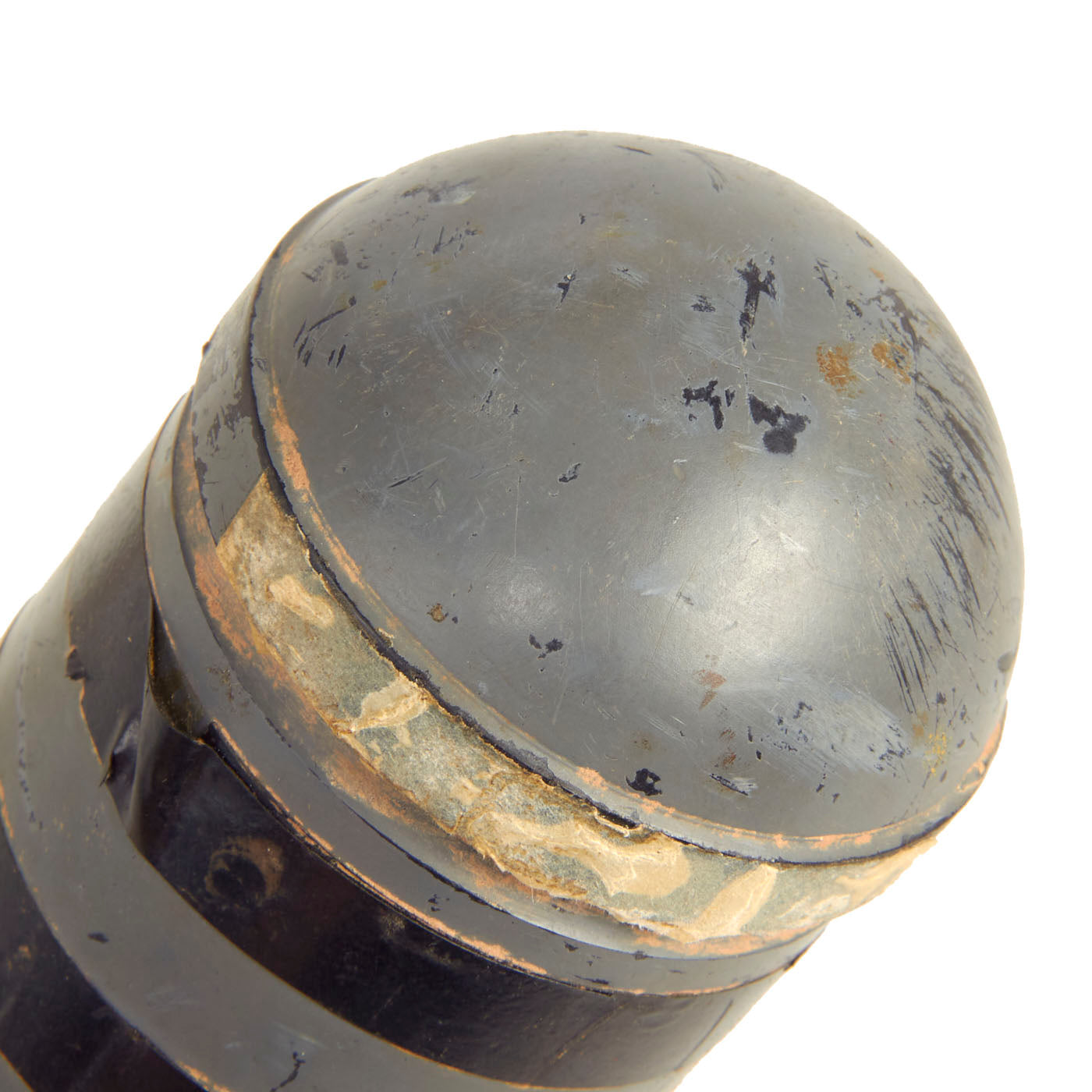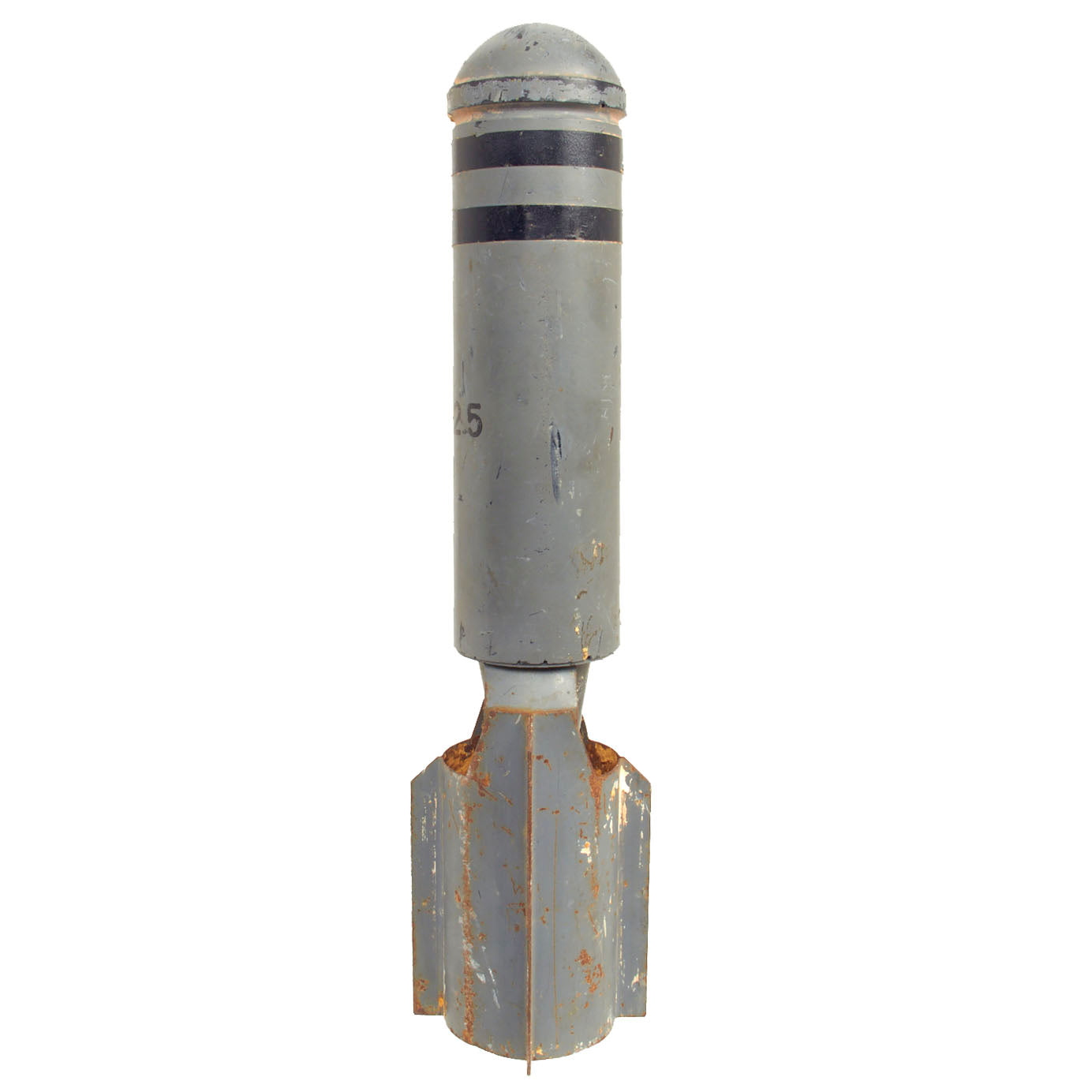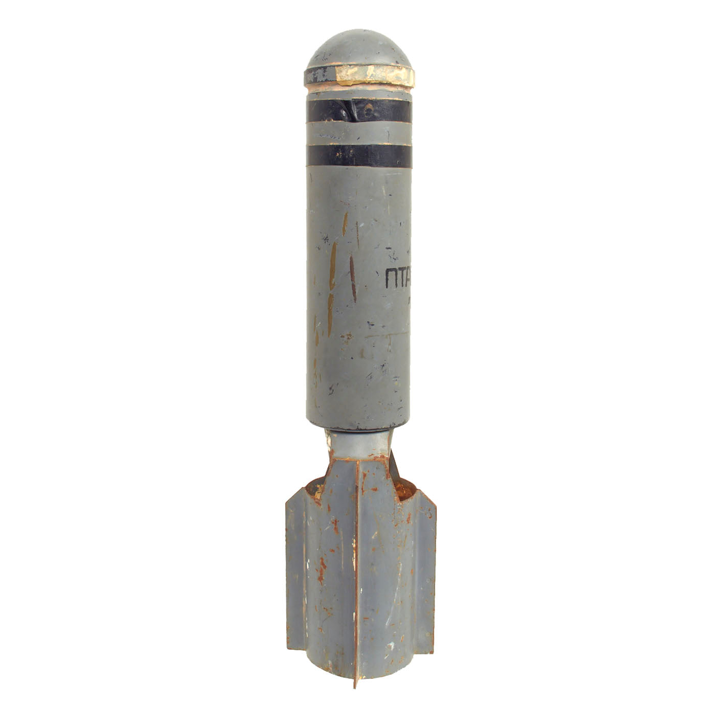 This example stands at 14” and retains almost off of the original paint and the ПТАБ - 2.5 designator painted in black on the front. The tail fins appear without damage and there are no dents or damage to the main body. The tail fin and cone assembly are still able to be removed to inspect the inside.