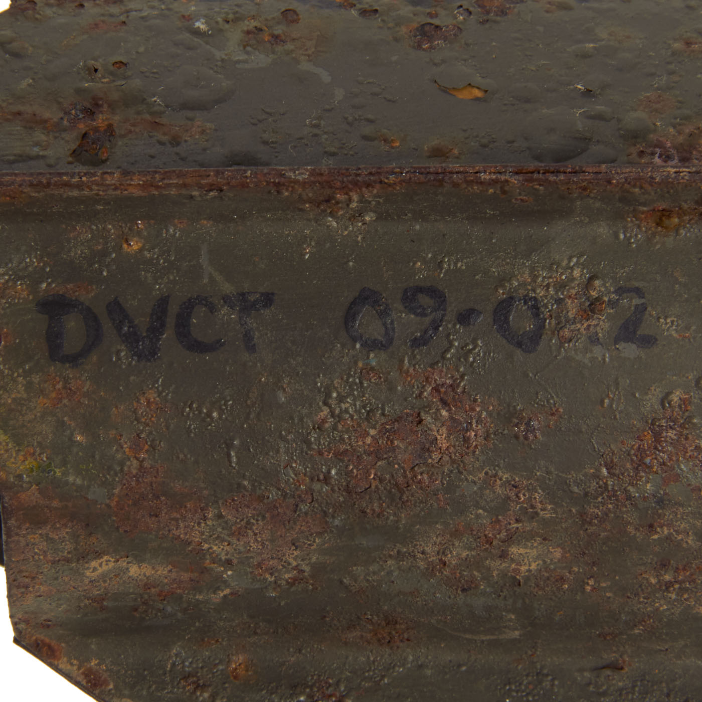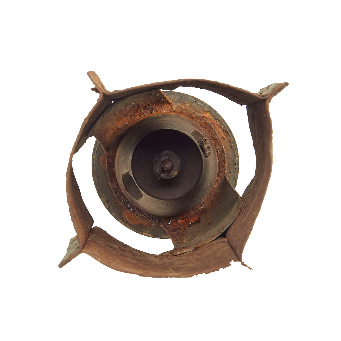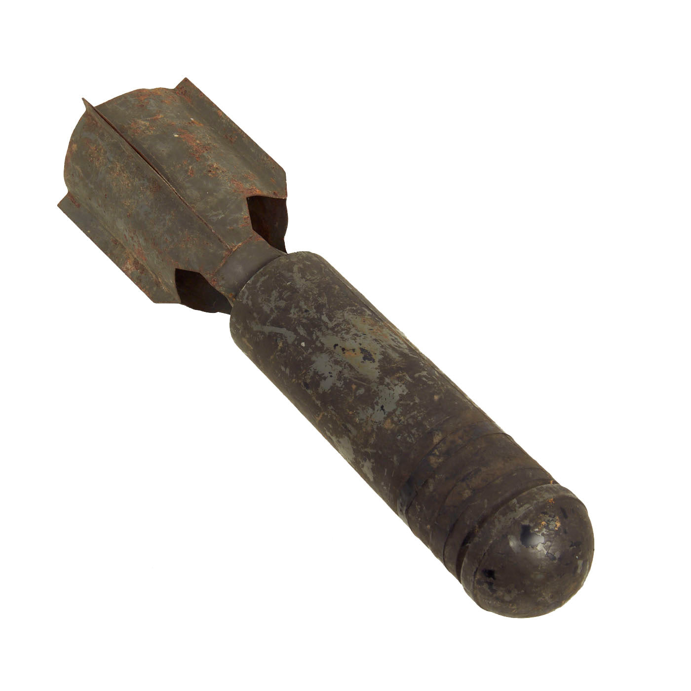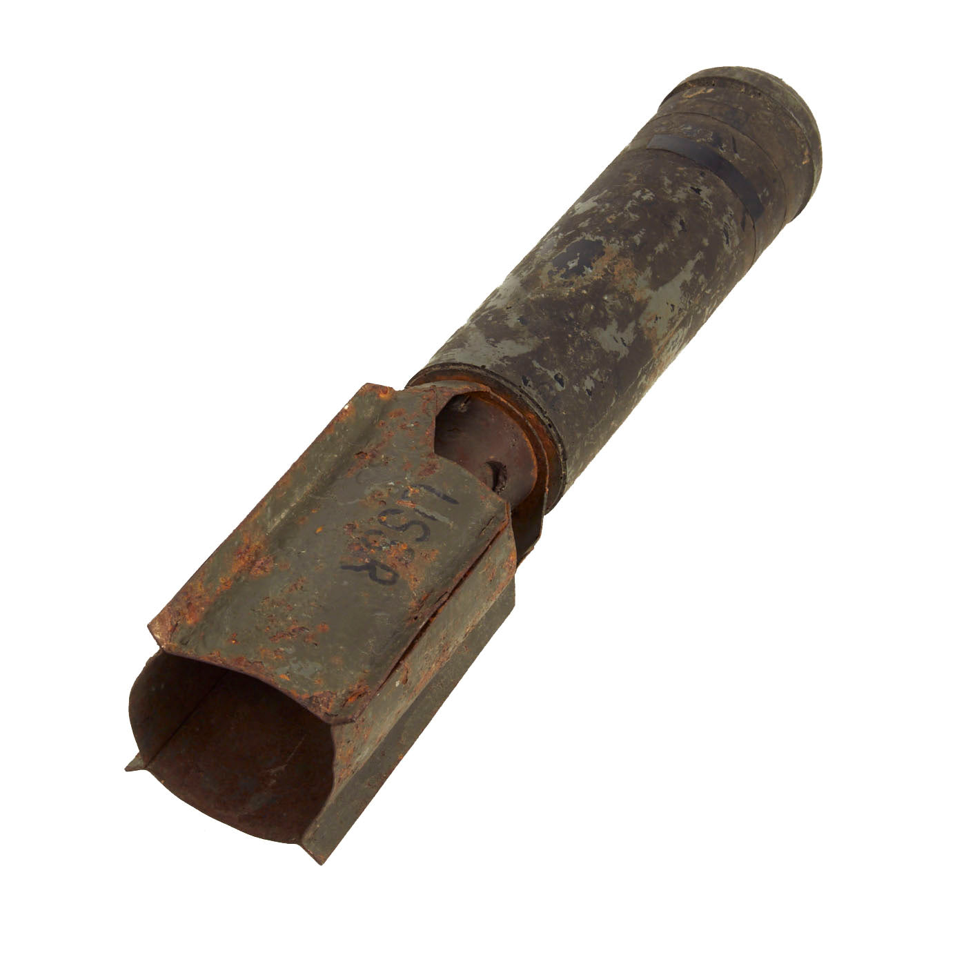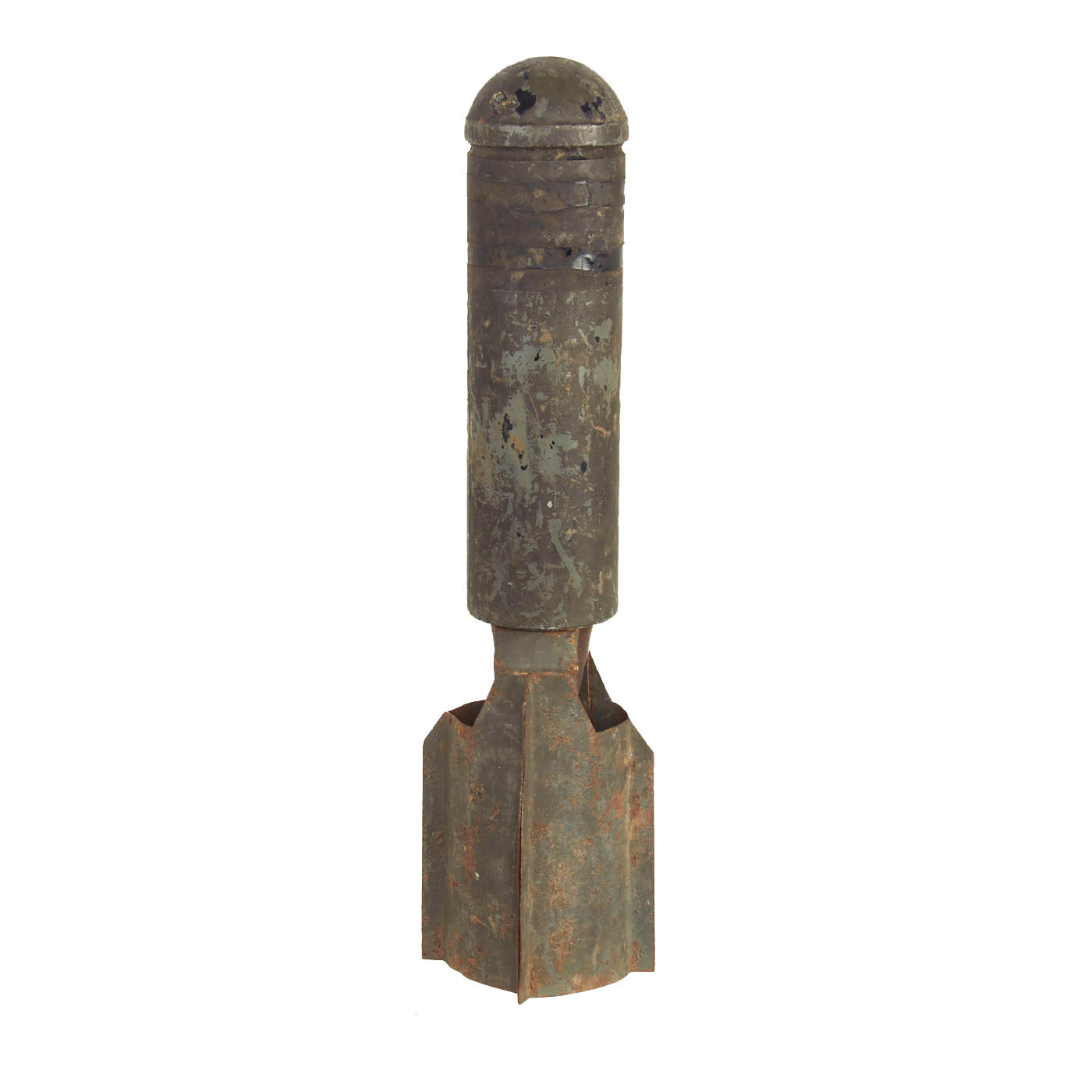 This example stands at 14” and retains almost off of the original paint without the designator painted on the front. The tail fins appear without damage and there are no dents or damage to the main body. The tail fin and cone assembly are still able to be removed to inspect the inside.