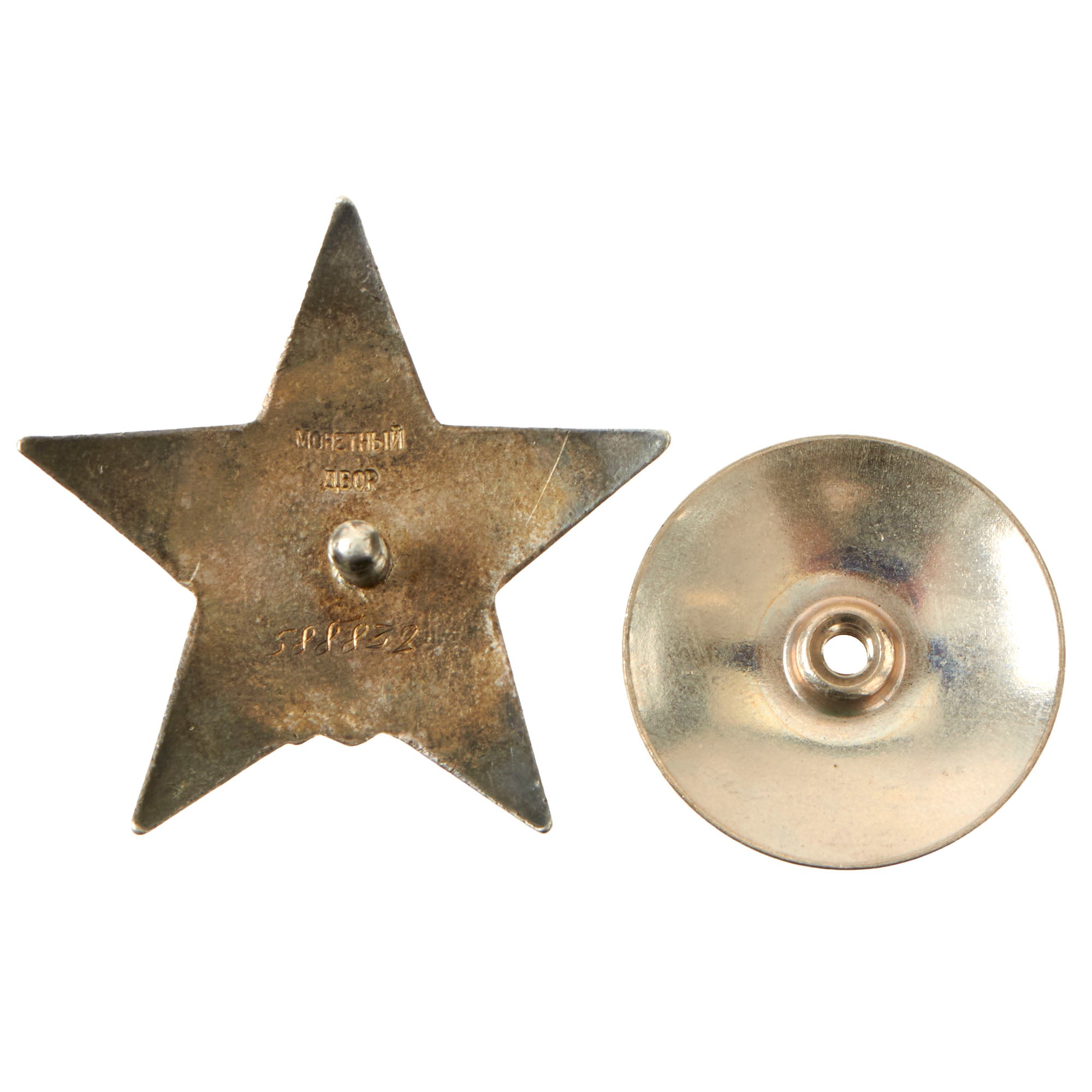 The Order of the Red Star is a red enameled 47mm to 50mm wide (depending on the variant) silver five pointed star. In the center of the obverse, an oxidized silver shield bearing the image of an erect soldier wearing an overcoat and carrying a rifle, along the shield's entire circumference, a narrow band bearing the Communist motto in relief, "Workers of the world, unite!", the band below the soldier bore the relief inscription "CCCP". Below the shield, the hammer and sickle are also of oxidized silver. The otherwise plain reverse bore the maker's mark and the award serial number. The Order was attached to clothing by a threaded stud and screw attachment.