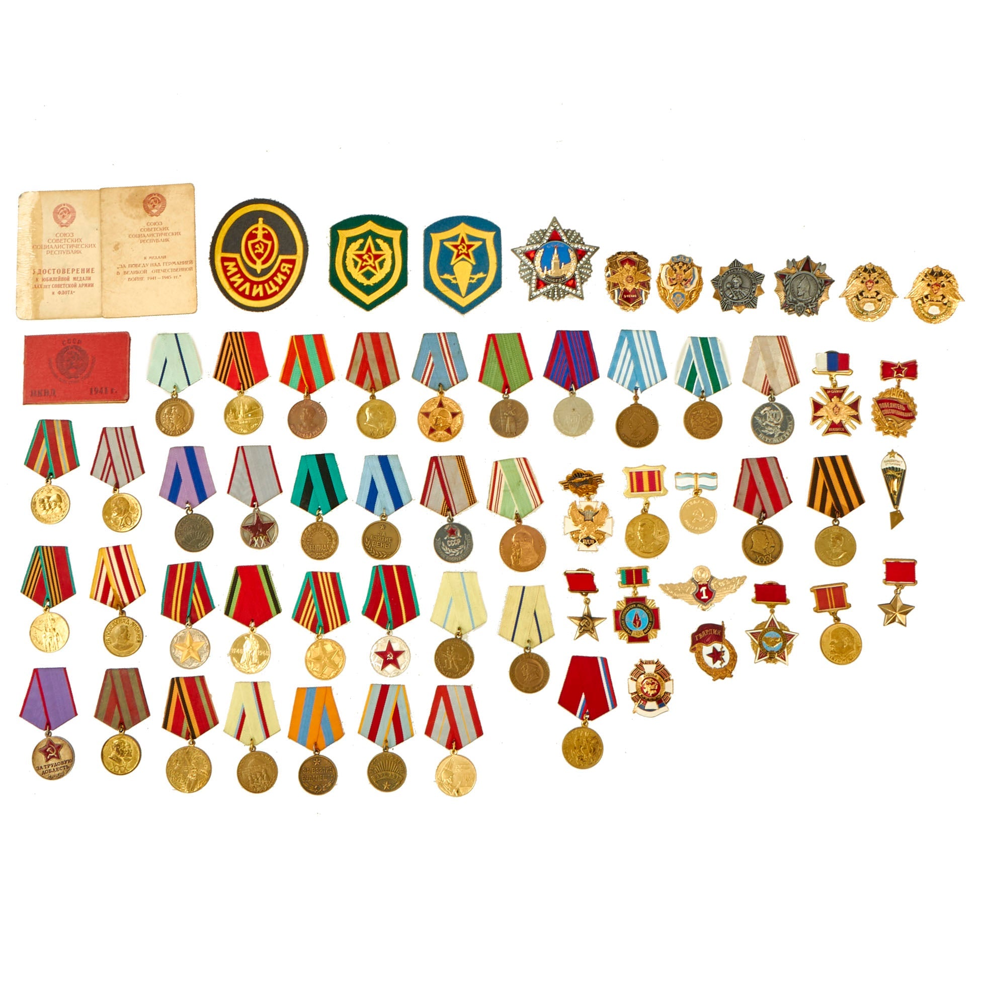 Original Items: Only One Lot of 63 Available. Awards and decorations of the Soviet Union are decorations from the former Soviet Union that recognized achievements and personal accomplishments, both military and civilian. Some of the awards, decorations, and orders were discontinued after the dissolution of the Soviet Union, while others are still issued by the Russian Federation as of 2021. Many of the awards were simply reworked in the Russian Federation, such as the transition of Hero of the Soviet Union to Hero of the Russian Federation, and Hero of Socialist Labor to Hero of Labor of the Russian Federation. A wide range of Soviet awards and decorations cover the extensive and diverse period of history from 1917 to 1991.