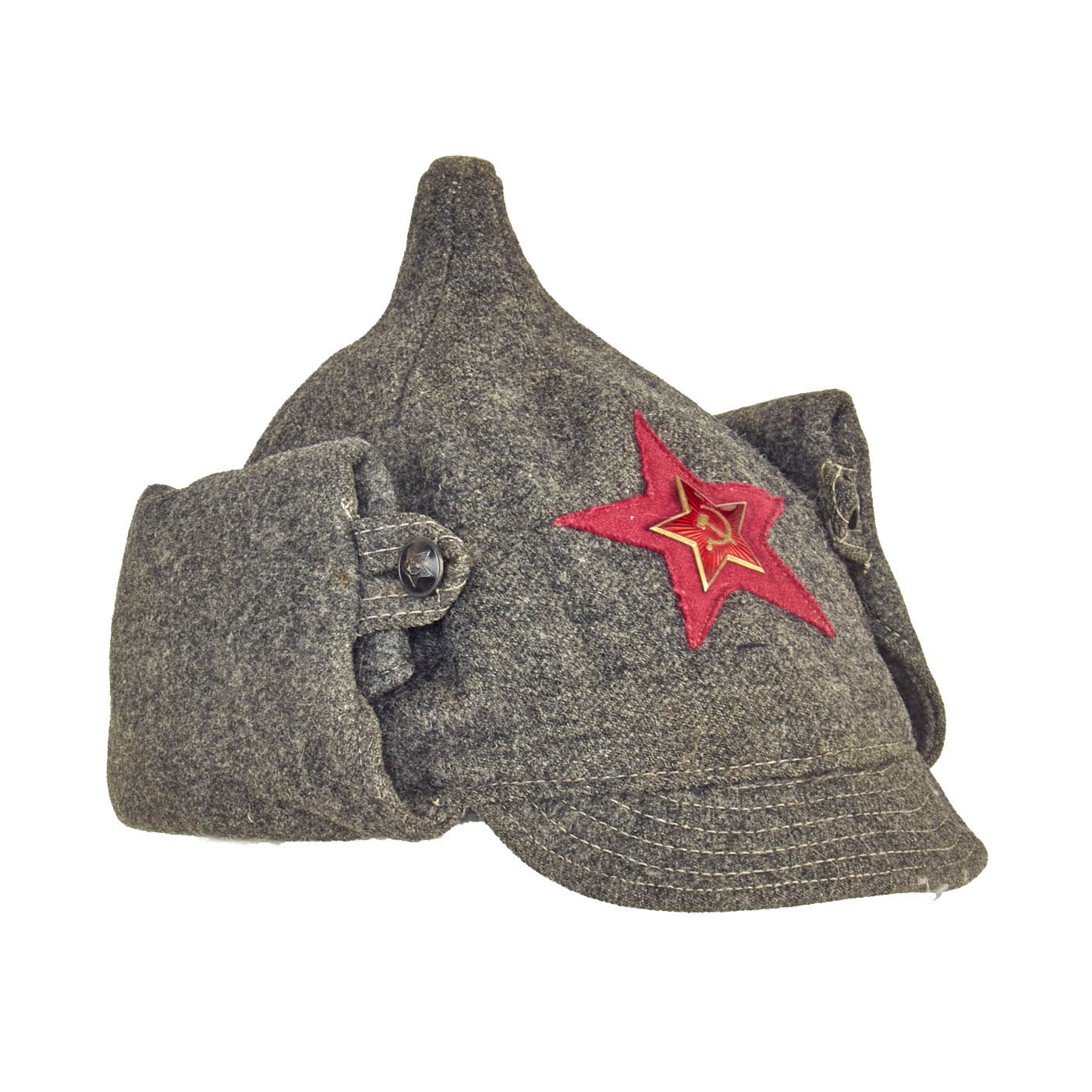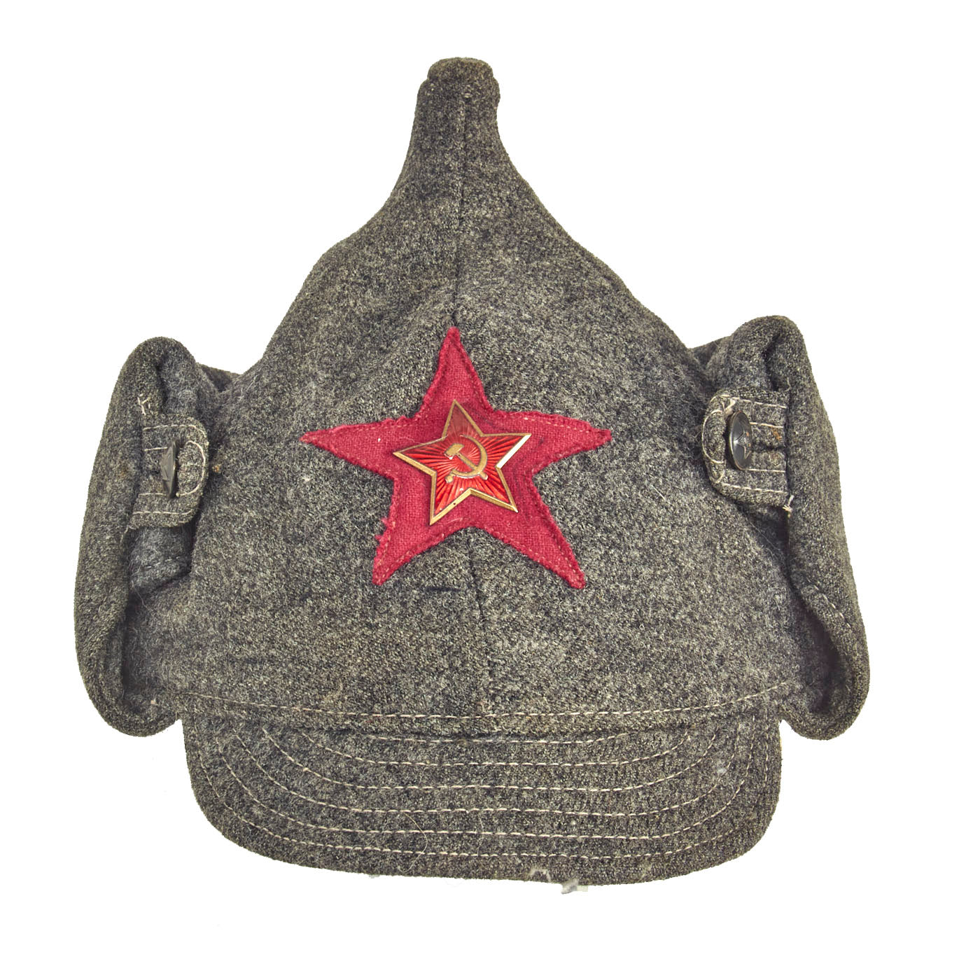 Original Item: Only One Available. A budenovka (Russian: будёновка, tr. budyonovka) is a distinctive type of hat, an archetypal part of the Communist military uniforms of the Russian Civil War (1917-1922) and later conflicts. Its official name was the "broadcloth helmet" (шлем суконный). Named after Red cavalry commander Semyon Budyonny, it was also known as the "frunzenka" after the Commissar Mikhail Frunze. It is a soft, woolen hat that covers the ears and neck. The cap features a peak and folded ear flaps that can be buttoned under the chin.
