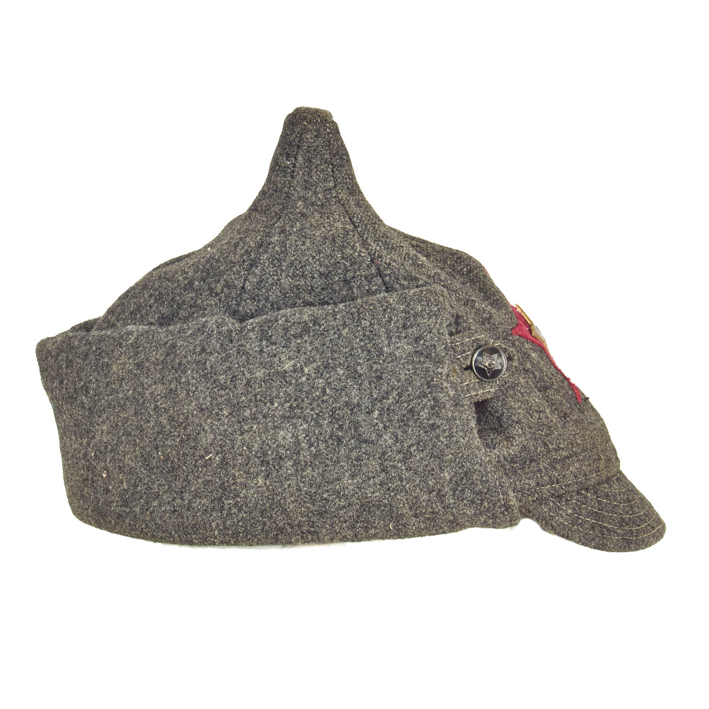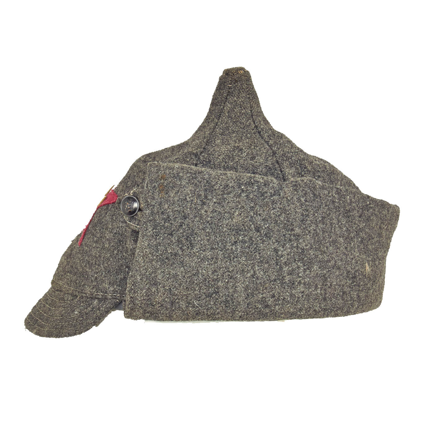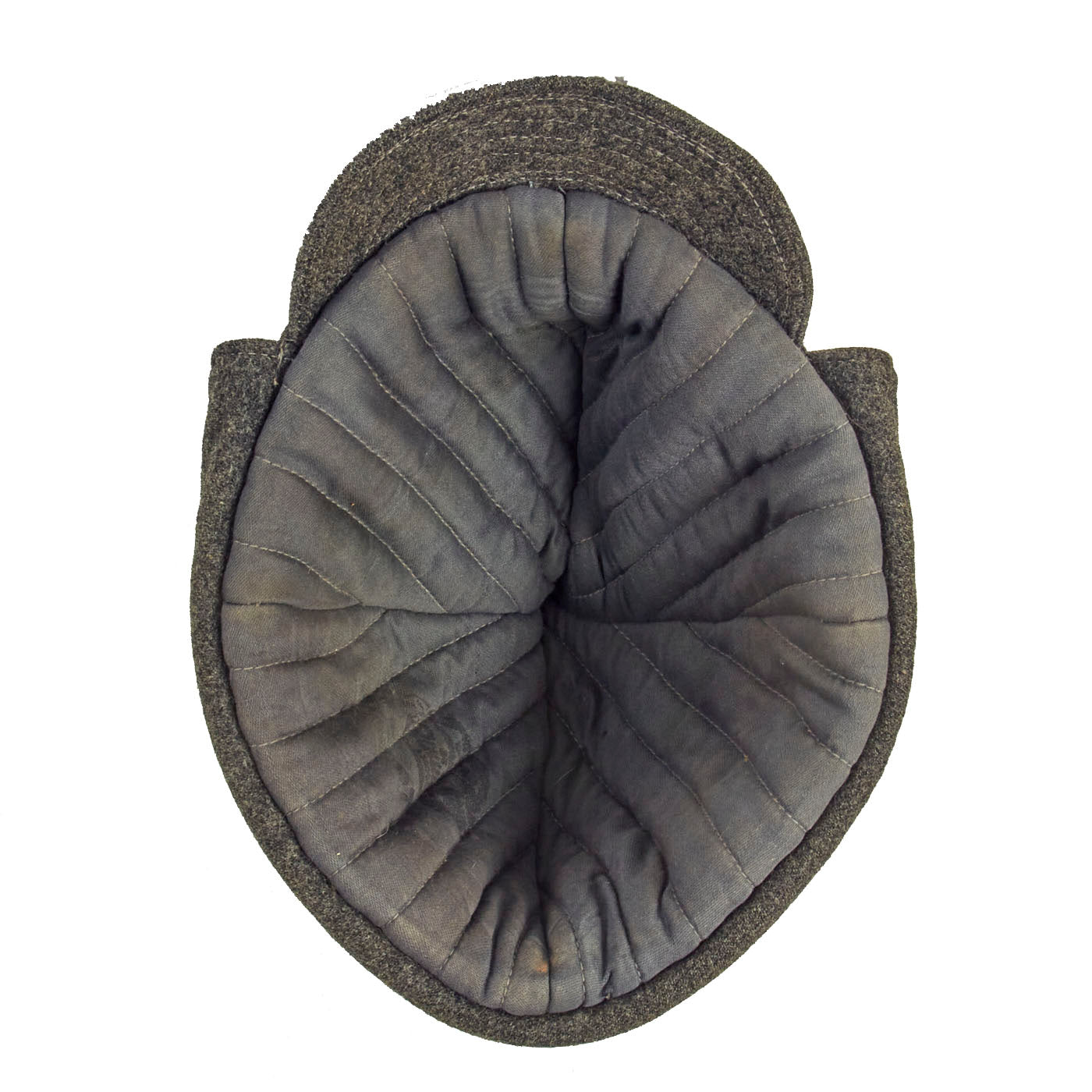 This is a very nice example of a WWII Issue Model 36 Budenovka Winter Cap, which is in very nice gently used condition. The exterior is made from dark gray wool, and it has a small fabric visor on the front. It has a red colored star sewn on the front, which once had a Soviet Red Star pinned, but was unfortunately lost to time. The interior is dark gray cloth, most likely cotton, with padding and insulation. There is an arsenal mark on the back but it has faded and can no longer be read by us, hopefully you’ll have better luck!