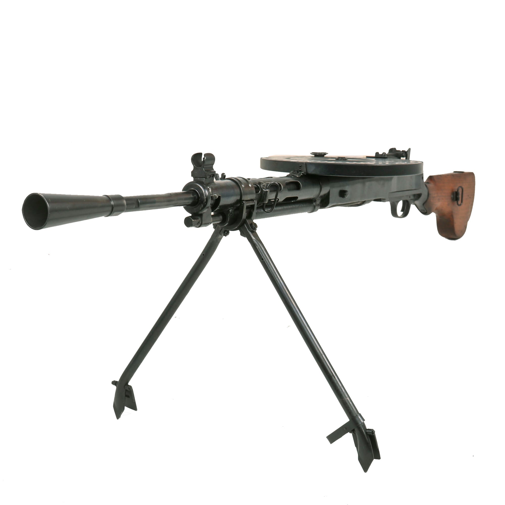 Original Item: Only One Available. Just purchased from a private collection, this is a fantastic Soviet WWII 7.62 x 54R Degtyaryov DP 28 Inert Display Light Machine Gun, built from all original parts on an original BATF compliant non-firing display receiver, making this a 100% legal display Sub-Machine gun. This receiver was created by using portions of the original torch cut receiver, including the barrel bushing, combined with some new made steel portions. It has properly had a 25% section of the total length completely replaced entirely with solid steel bar stock. Meaning a 1/4 length section of the display receiver is solid steel, making this totally legal to own without a license of any kind. Every part on this display gun is original WWII manufacture other than 25% of the receiver replaced by solid steel (as required by BATF). The barrel has also been deactivated.