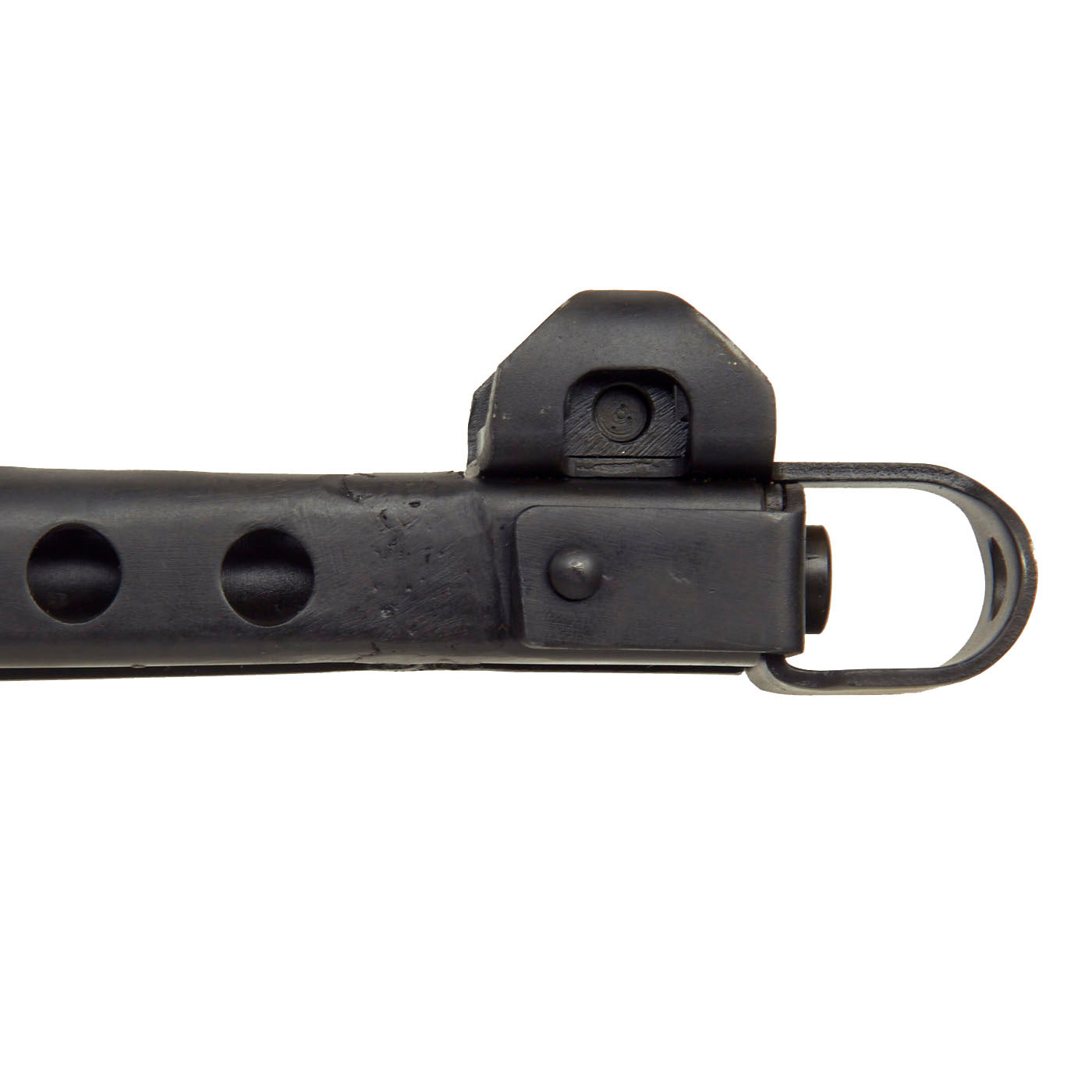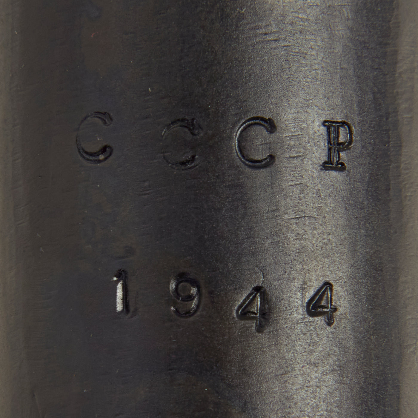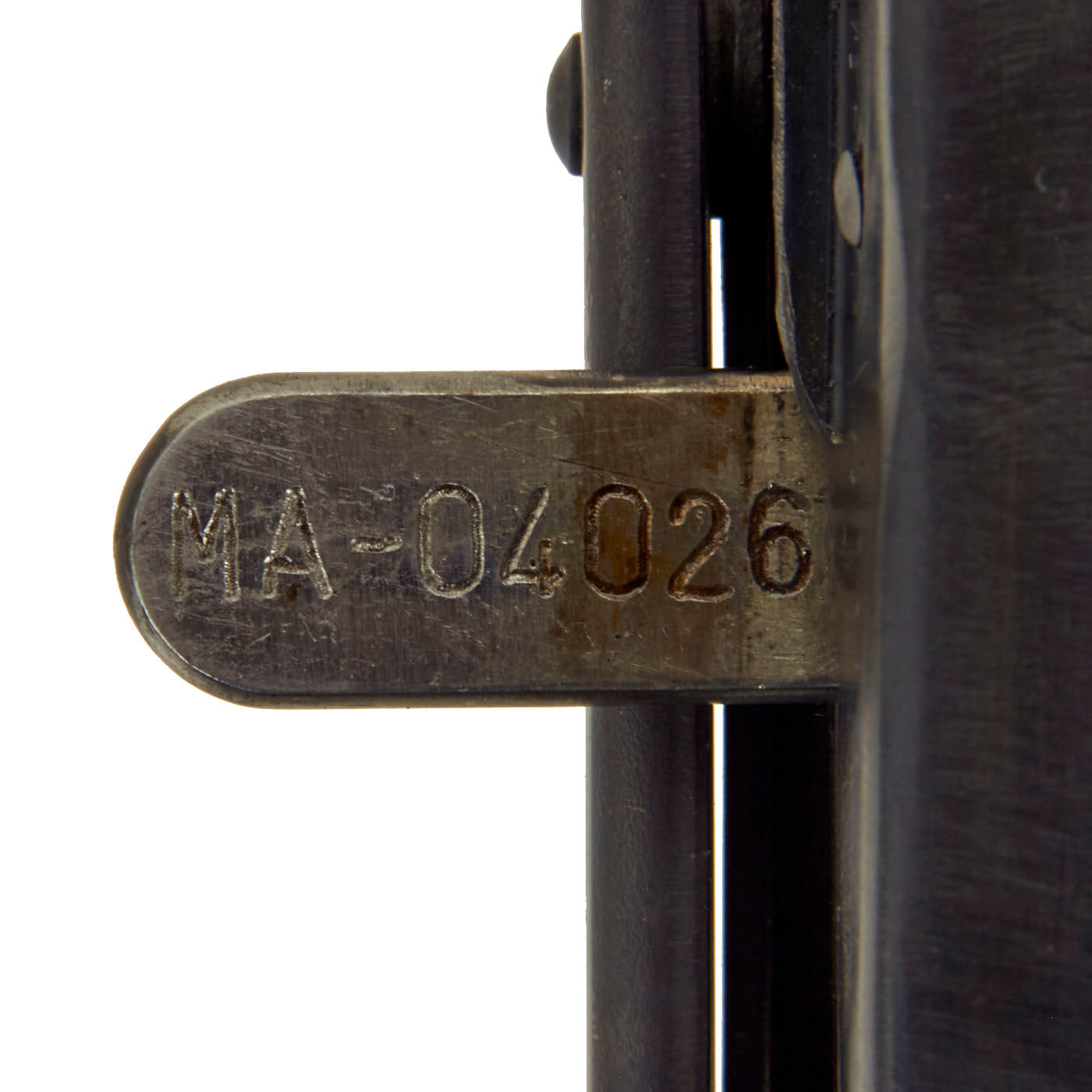 This example was made from original issue parts, and constructed per BATF-specifications as a non-functional display gun. It has no moving internal parts, and 30% of the receiver have been replaced by solid bar stock as required. The trigger still pulls, and the stock is still able to be moved into the open and closed positions. The receiver is stamped with the correct CCCP marking just above the date 1944. It is also marked with serial number MA-04026 in on the bottom of the cocking handle. There are sometimes marks on other parts, but these were removed during the rebuilding process. The barrel has also been deactivated.