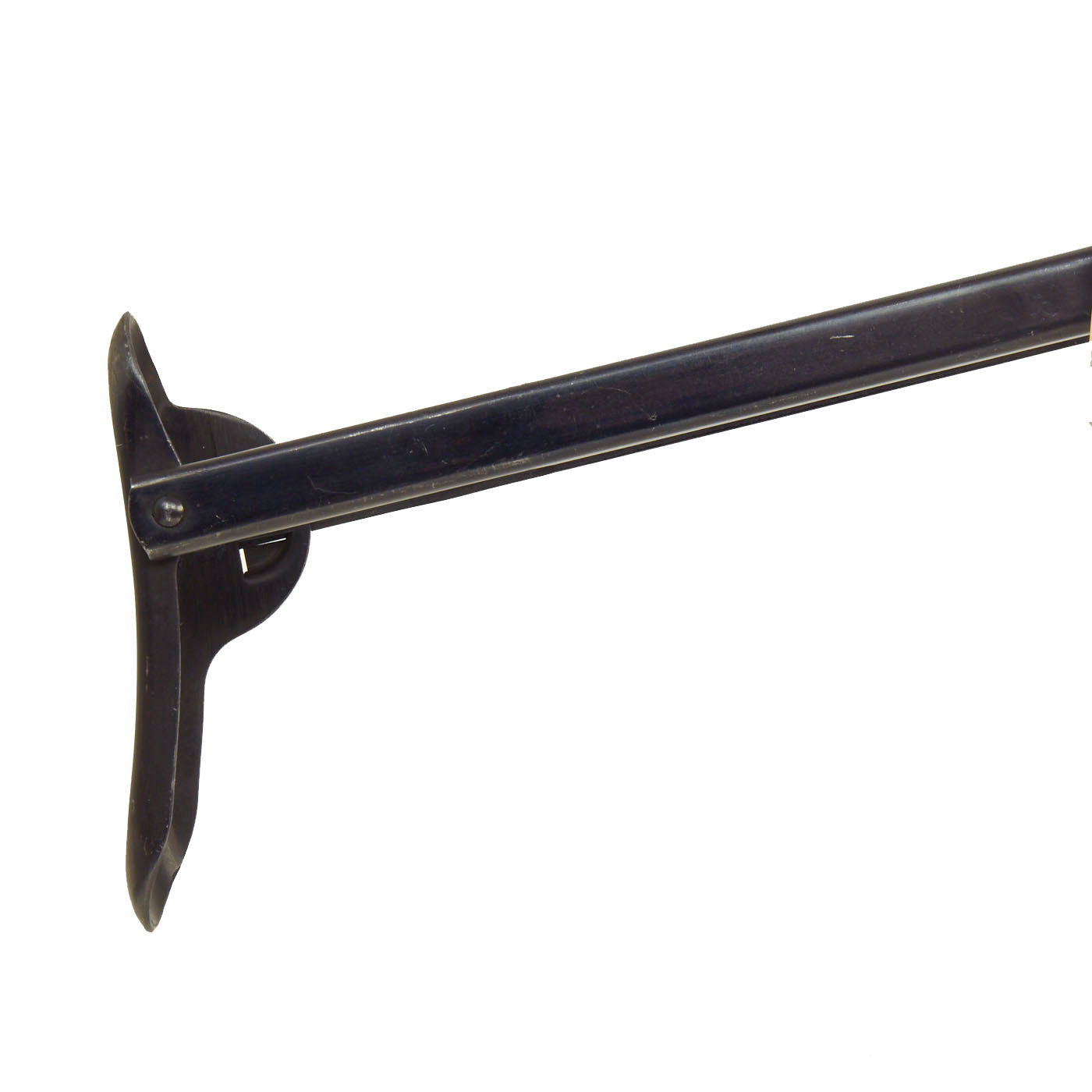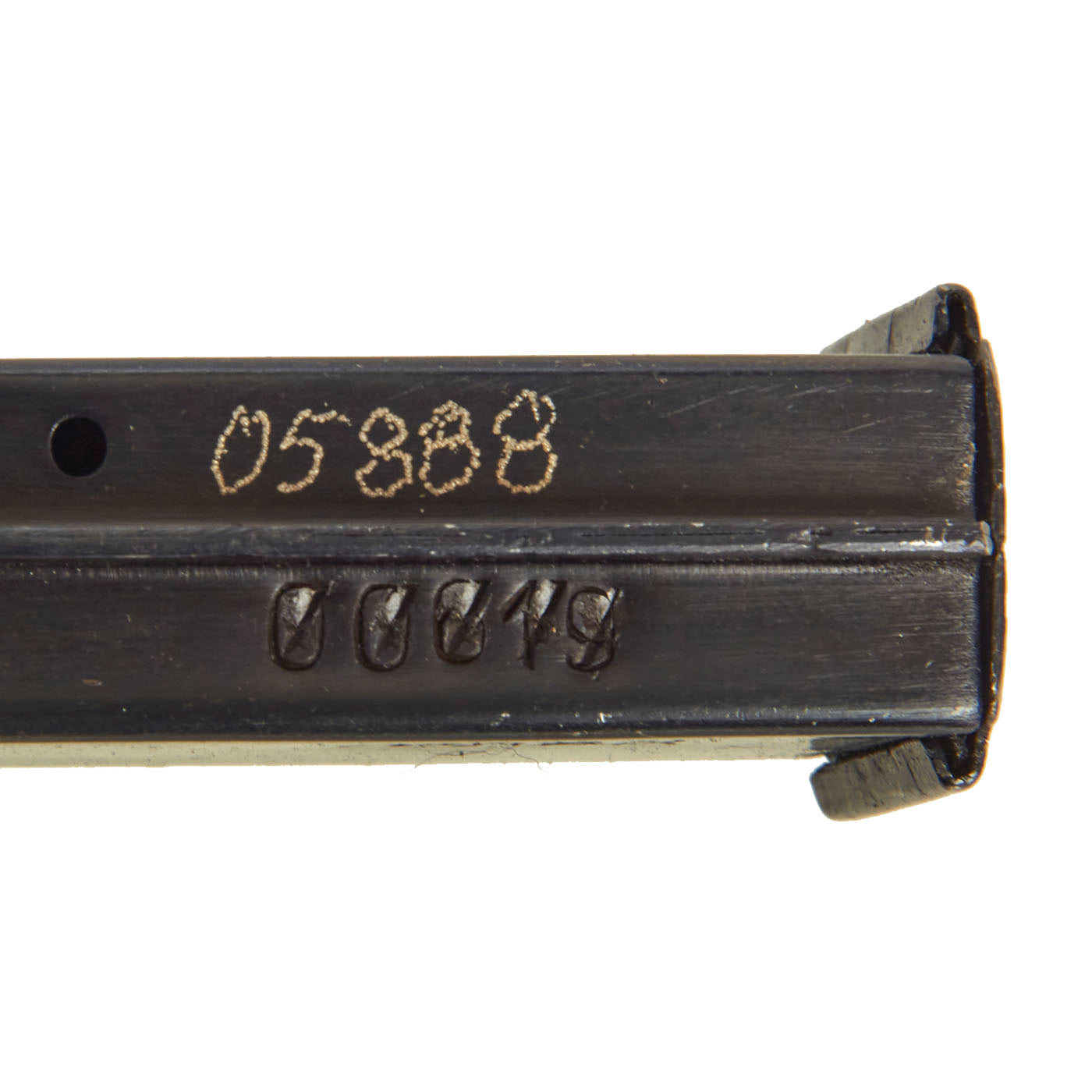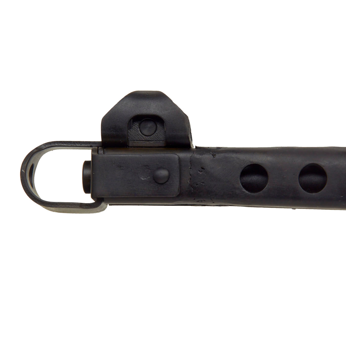This example was made from original issue parts, and constructed per BATF-specifications as a non-functional display gun. It has no moving internal parts, and 30% of the receiver have been replaced by solid bar stock as required. The trigger still pulls, and the stock is still able to be moved into the open and closed positions. The receiver is stamped with the correct CCCP marking just above the date 1944. It is also marked with serial number MA-04026 in on the bottom of the cocking handle. There are sometimes marks on other parts, but these were removed during the rebuilding process. The barrel has also been deactivated.