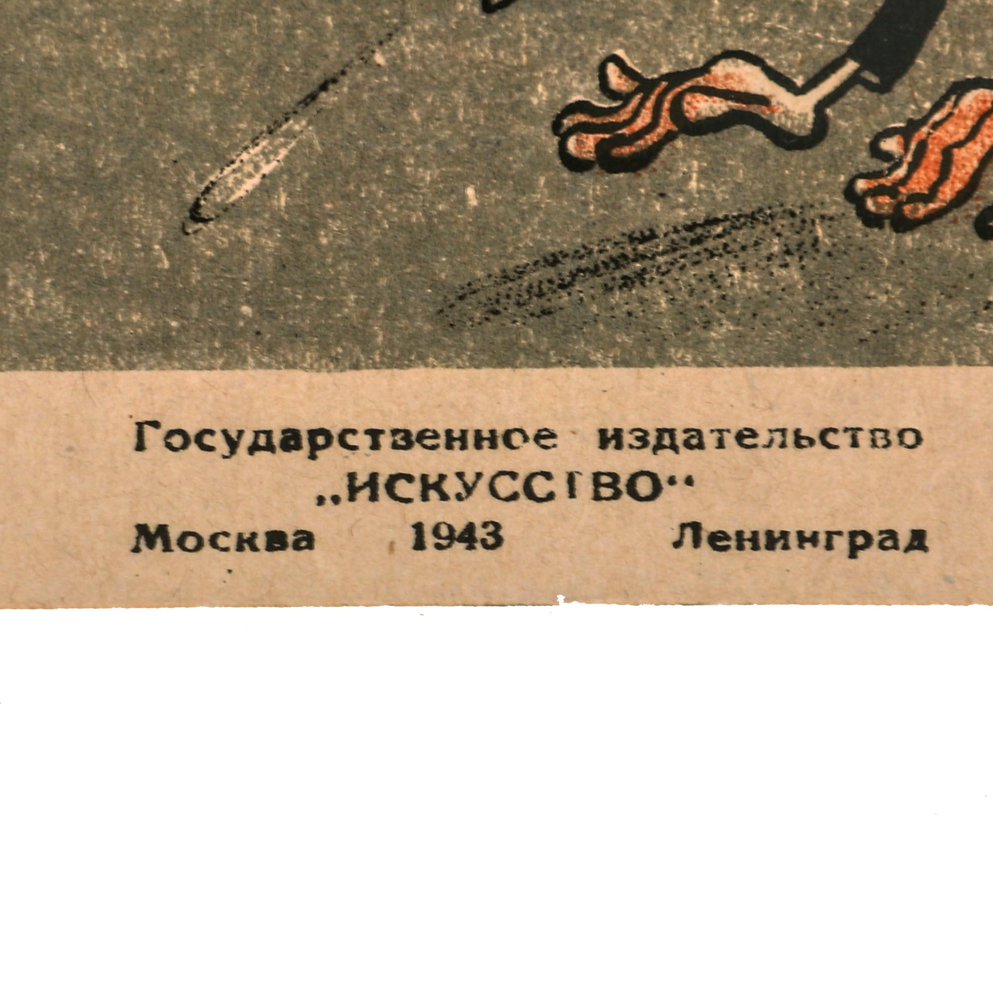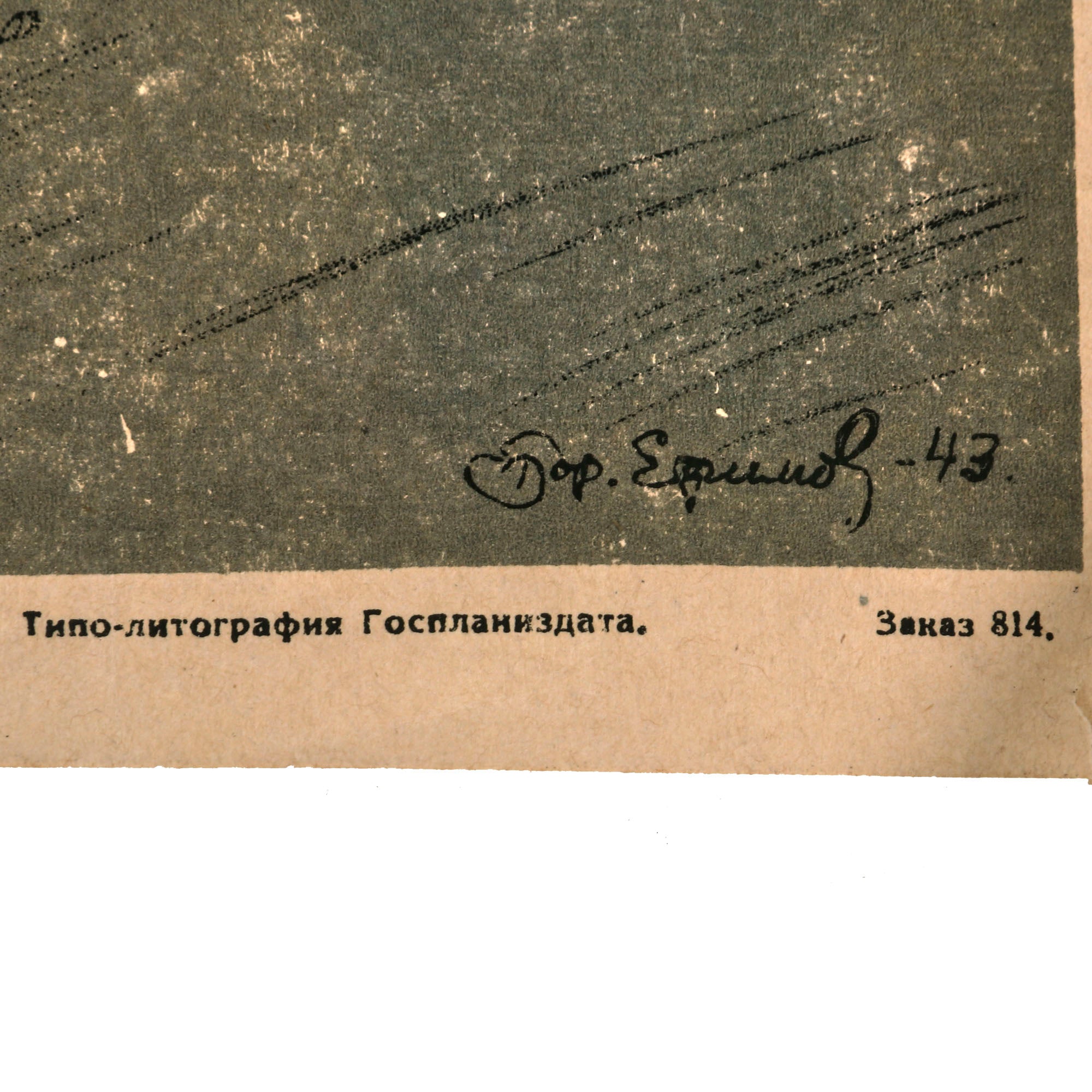 The poster measures 8⅜ x 11⅛”, and was designed by Boris Efimov, a well known artist who drew some of the most iconic Soviet posters of the war. The poster is in great shape overall without any serious damage, just some small tears along the edges. The poster is dated 1943 in the corner.