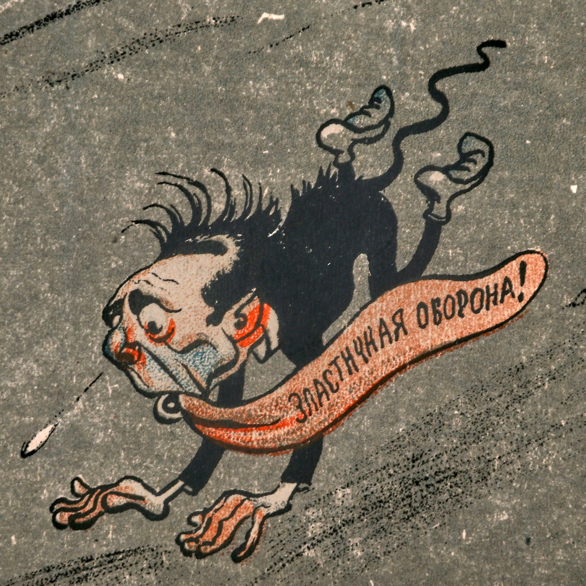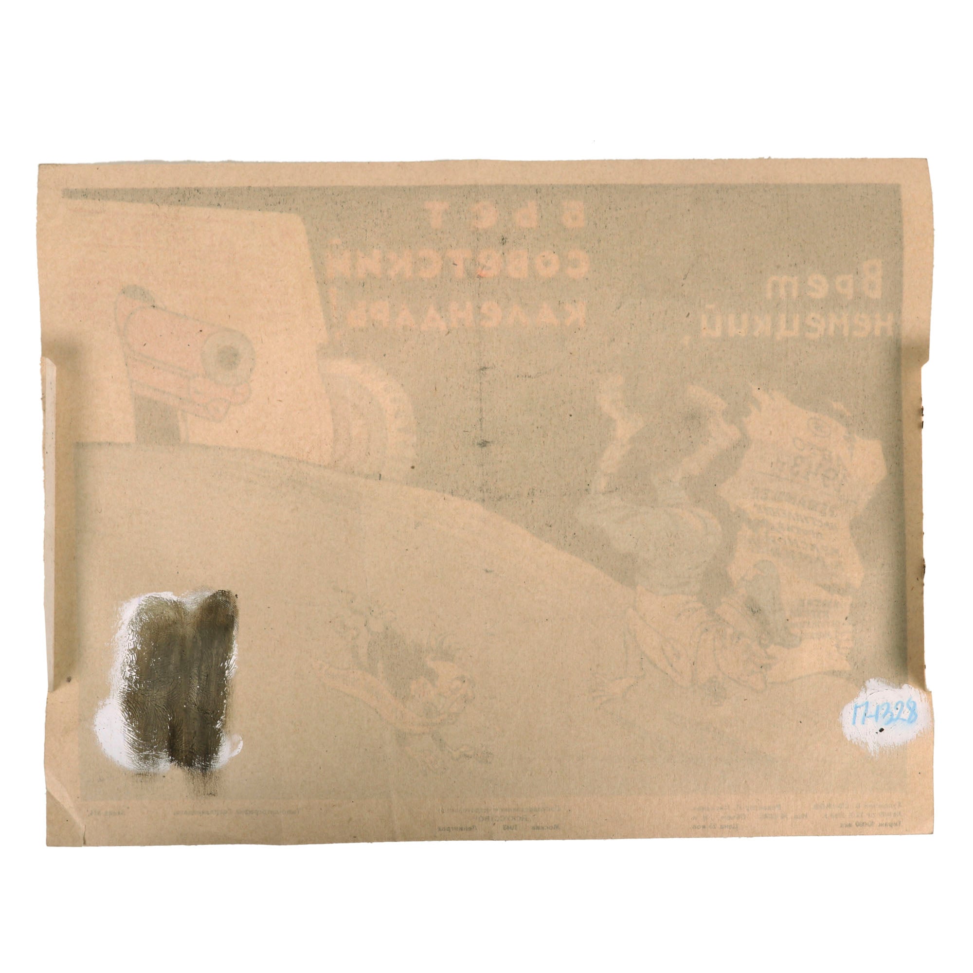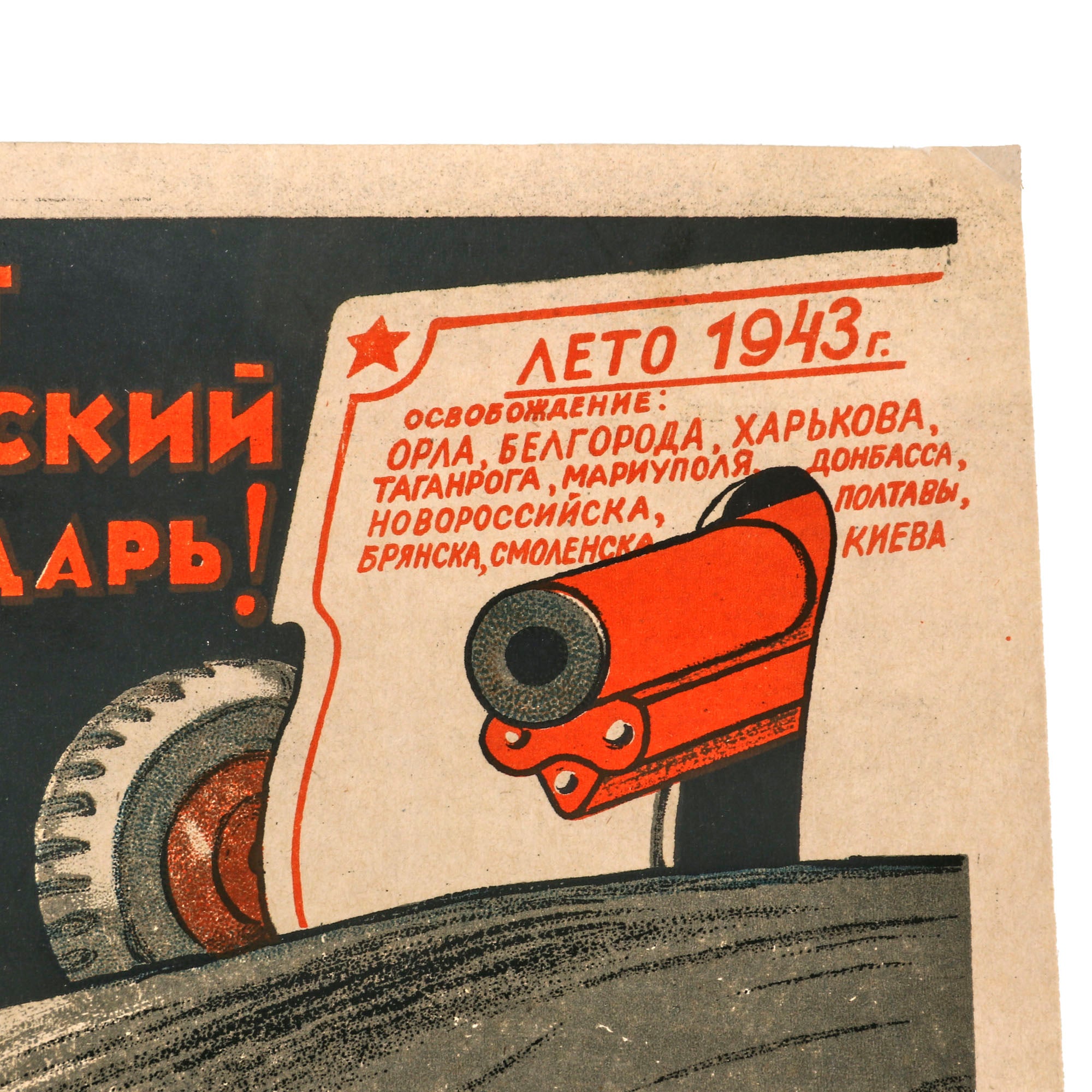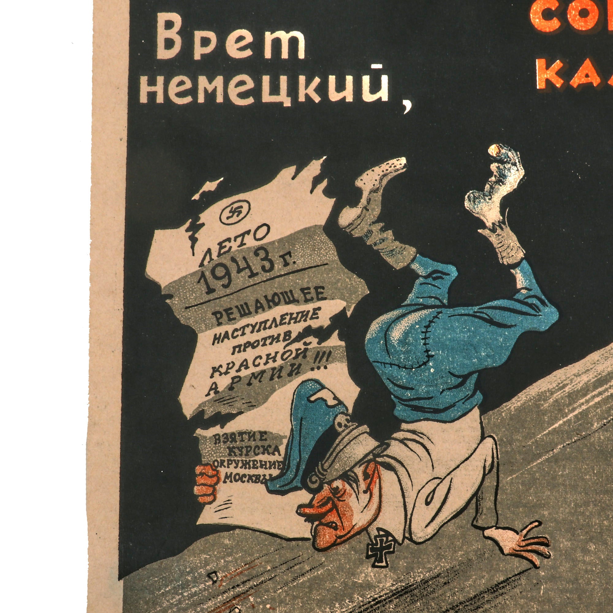 Original Item. Only One Available. This is a great Soviet propaganda poster from the “Great Patriotic War”, World War II. It depicts AH running & holding his 1943 plan for the “Decisive Offensive against the Red Army” which has obviously not worked. He runs alongside another man whose tongue is labeled “Elastic Defense”. They are being chased by a large Soviet artillery piece with the true plan for 1943, the release of Orel, Belgorod, Kharkov, and other Soviet cities soon to be unhanded from the Germans.