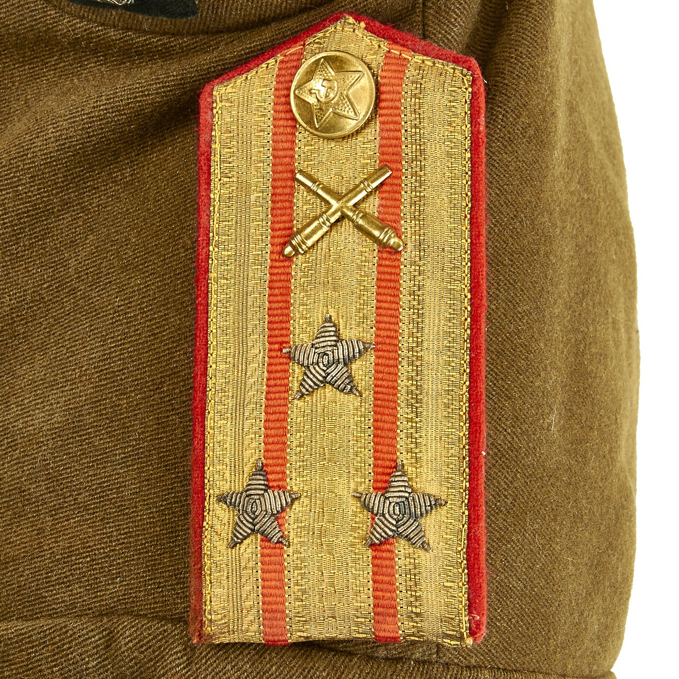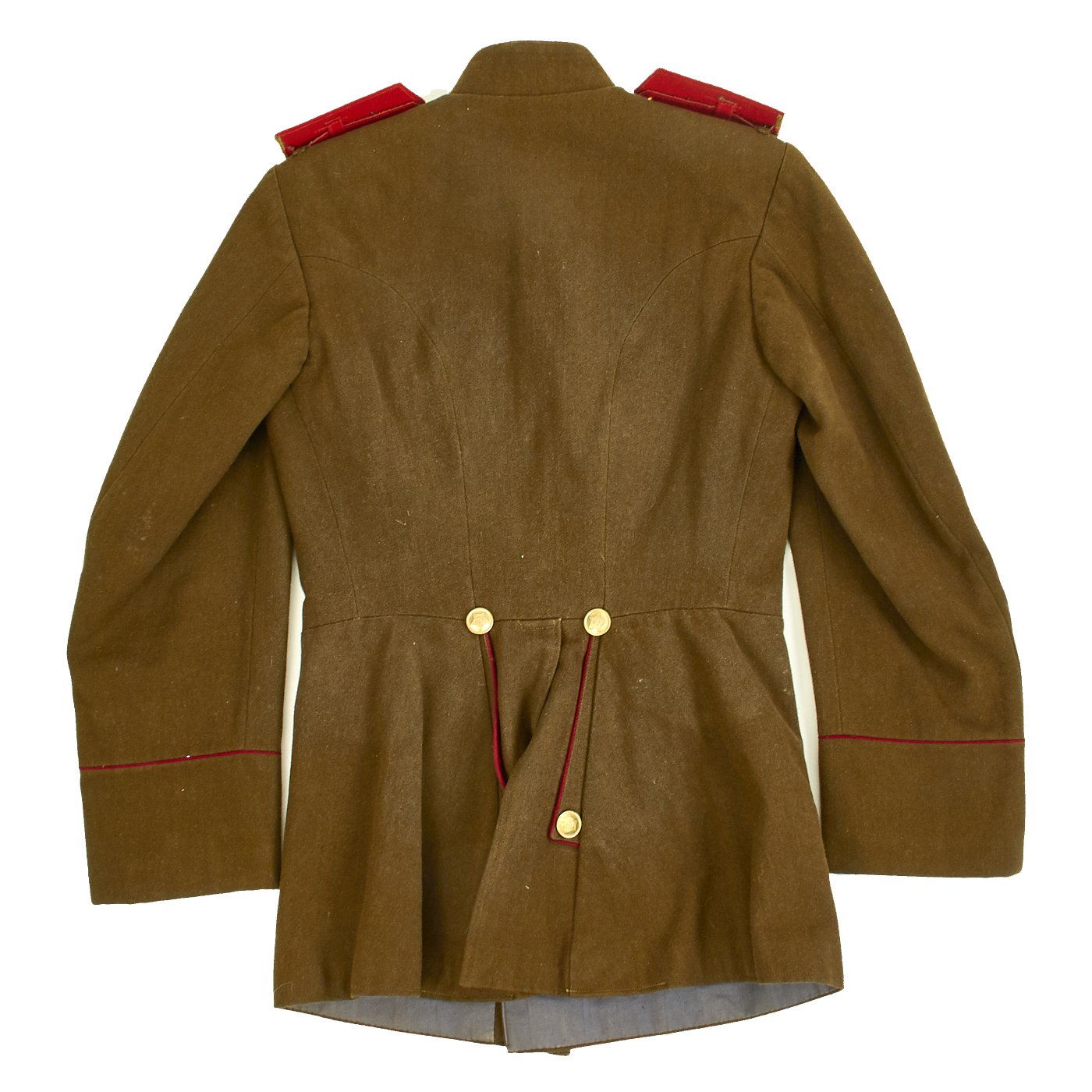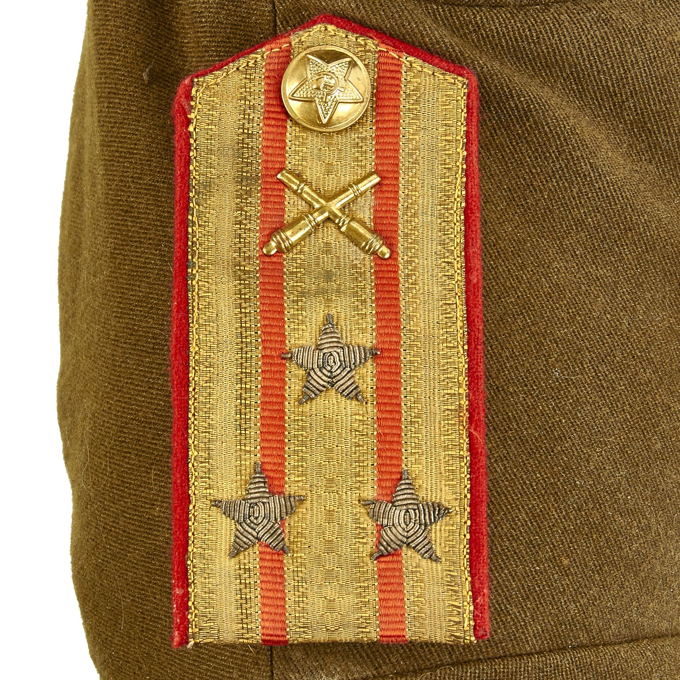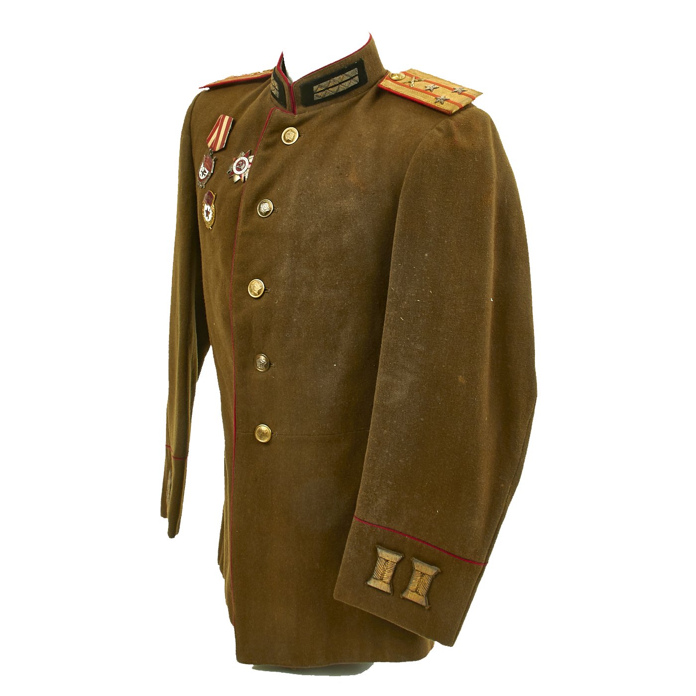 Original Item: Only One Available. This is a World War Two Russian Soviet artillery uniform field jacket for the rank of Colonel. The jacket is constructed of thick wool with internal cotton lining. It features red wool piping, 5 button front, and single vented back. The brass buttons feature a hammer and sickle inside a pebbled star. The tunic has correct Colonel rank epaulets with crossed cannon pins for artillery. Collar features gilt bullion embroidered rank tabs with black velvet bases. Uniform has Soviet Russia USSR WWII Enameled Silver Order of the Red Banner Medal with maker markings and numbered 449744 on the reverse. Also attached is an enameled Soviet Army Order of Great Patriotic War (WW2) 2nd Class badge with with maker markings and numbered 2126850 on the reverse. Finally attached to the front on the uniform is an enamel Soviet Russian Red Army Guard Gvardiya Badge. Overall condition is excellent.
