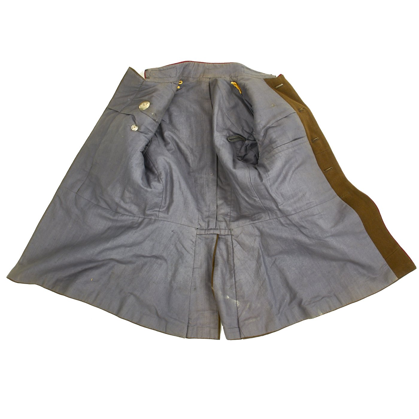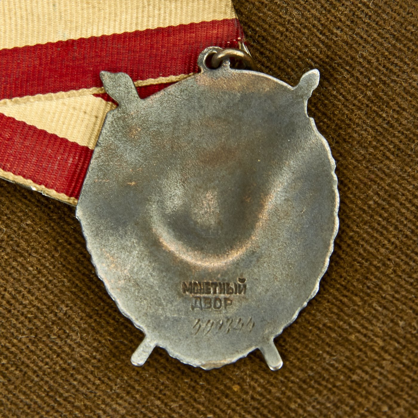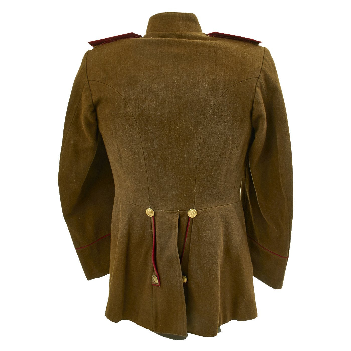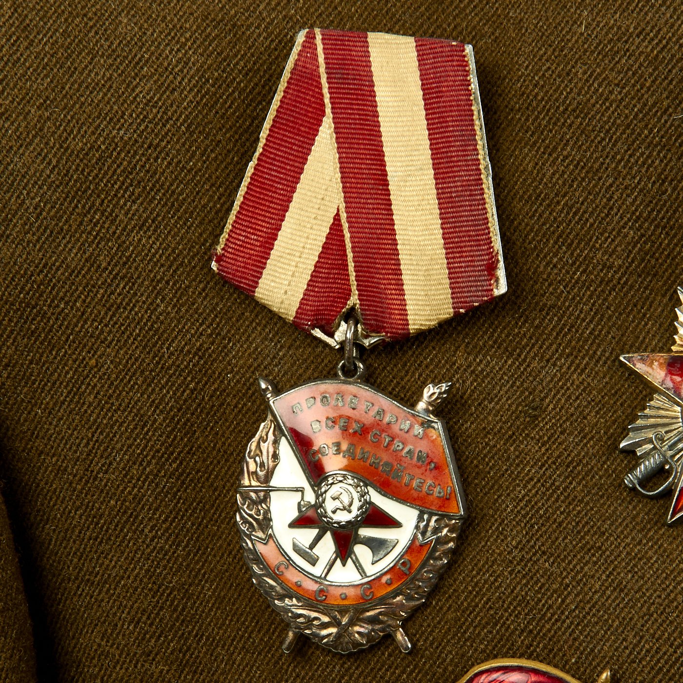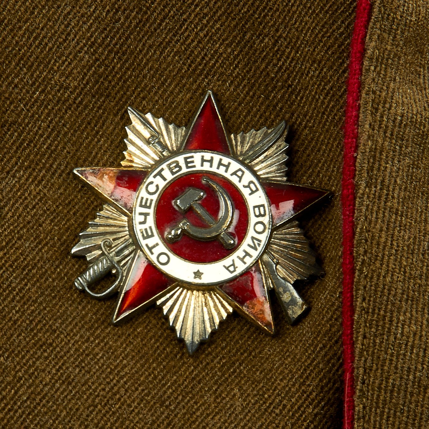 Original Item: Only One Available. This is a World War Two Russian Soviet artillery uniform field jacket for the rank of Colonel. The jacket is constructed of thick wool with internal cotton lining. It features red wool piping, 5 button front, and single vented back. The brass buttons feature a hammer and sickle inside a pebbled star. The tunic has correct Colonel rank epaulets with crossed cannon pins for artillery. Collar features gilt bullion embroidered rank tabs with black velvet bases. Uniform has Soviet Russia USSR WWII Enameled Silver Order of the Red Banner Medal with maker markings and numbered 449744 on the reverse. Also attached is an enameled Soviet Army Order of Great Patriotic War (WW2) 2nd Class badge with with maker markings and numbered 2126850 on the reverse. Finally attached to the front on the uniform is an enamel Soviet Russian Red Army Guard Gvardiya Badge. Overall condition is excellent.