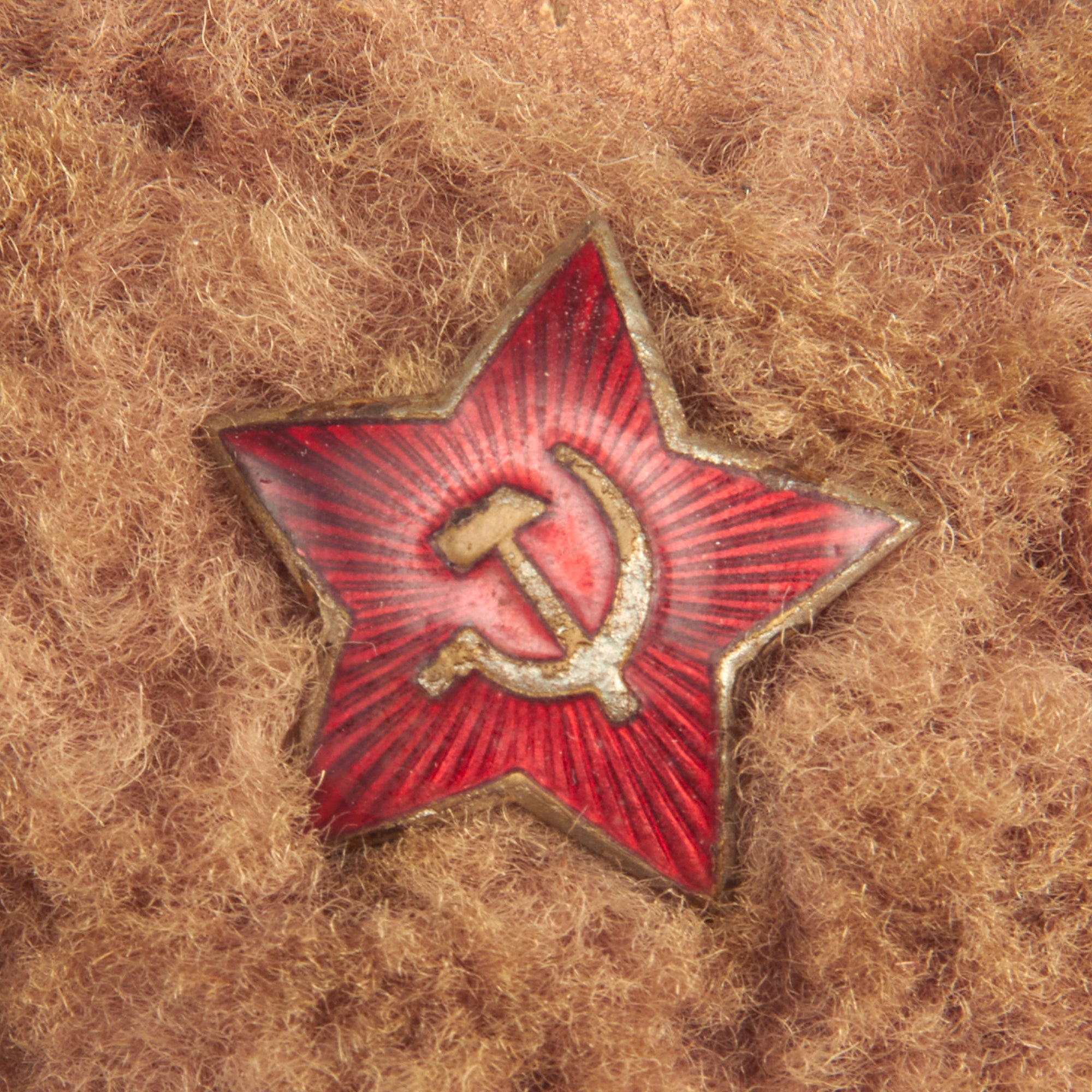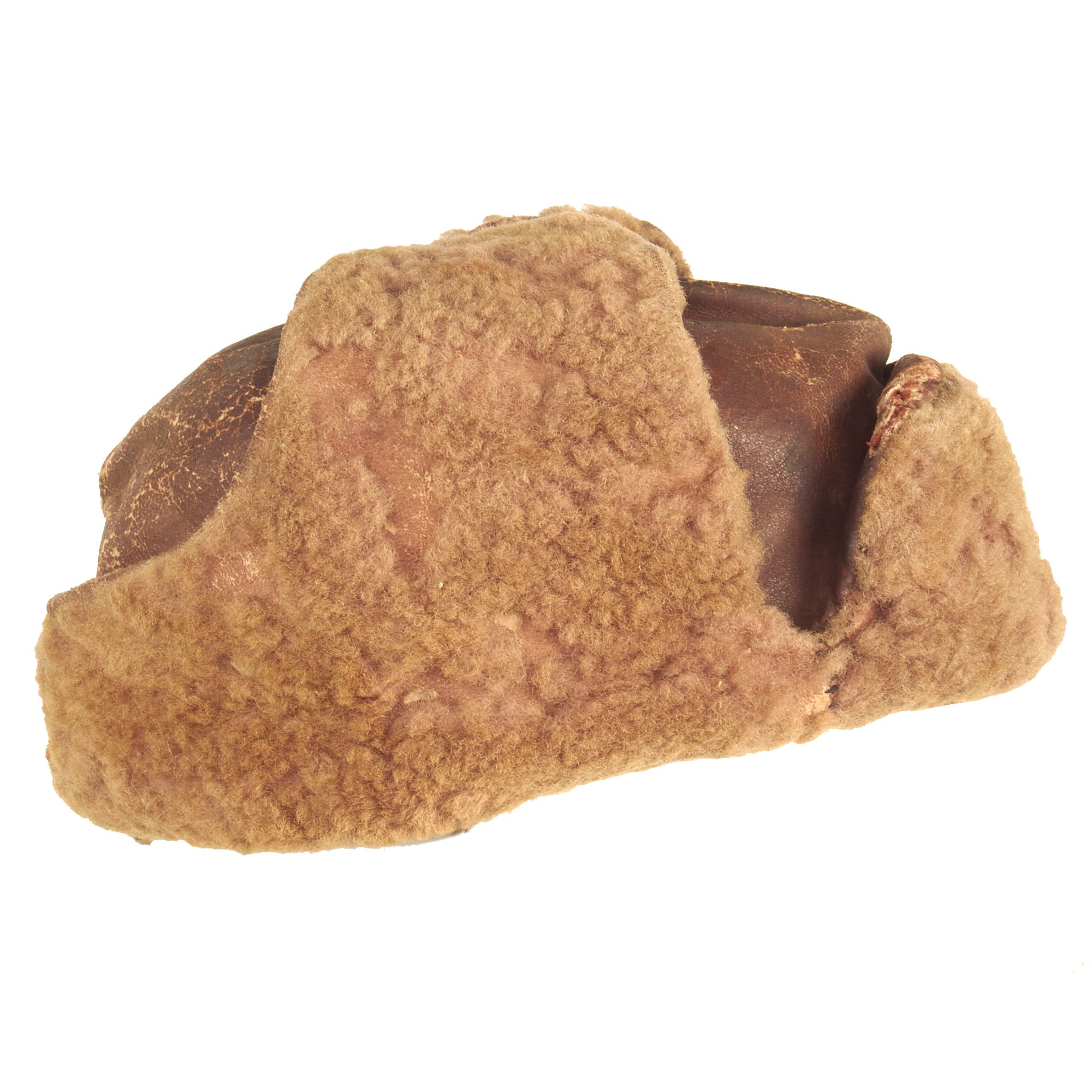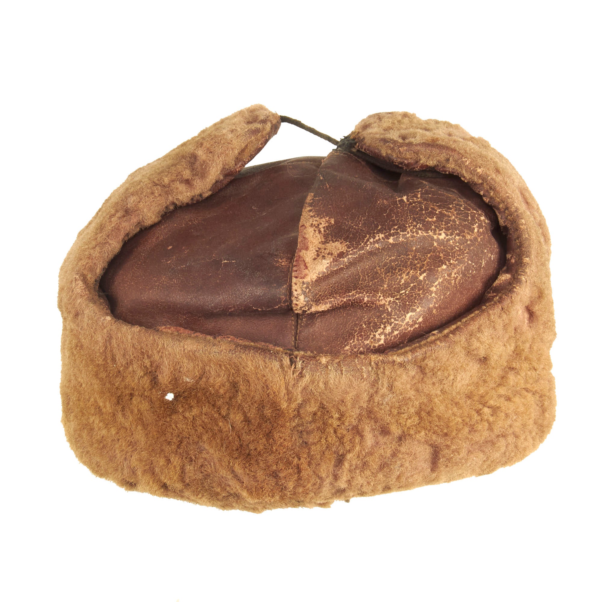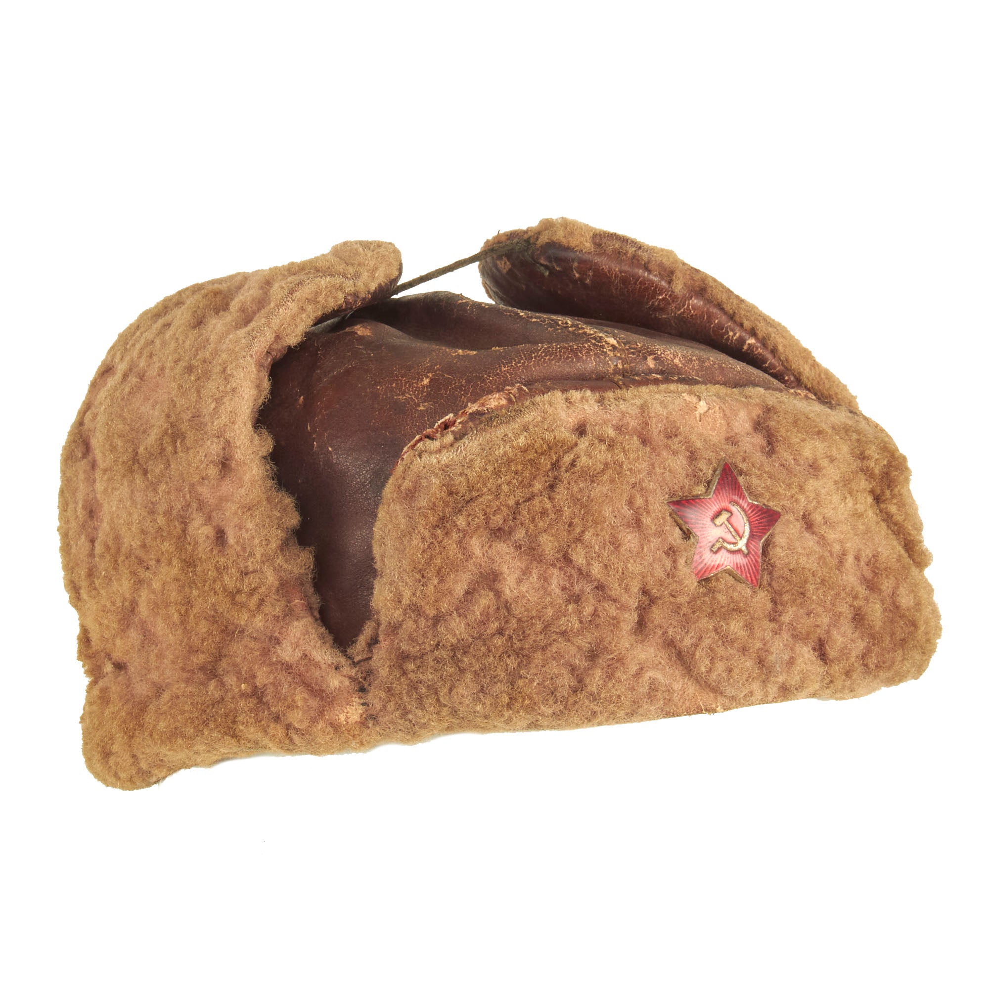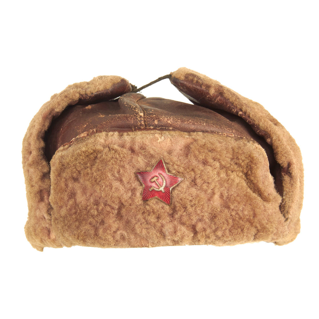 This is a lovely example of these types of caps and is constructed out of the desired brown leather instead of wool. The cap is in great condition and shows signs of minor use and wear. The interior has the standard Soviet style quilt type padding lining in dark brown, with no markings present. The front has the standard enameled Soviet star attached.