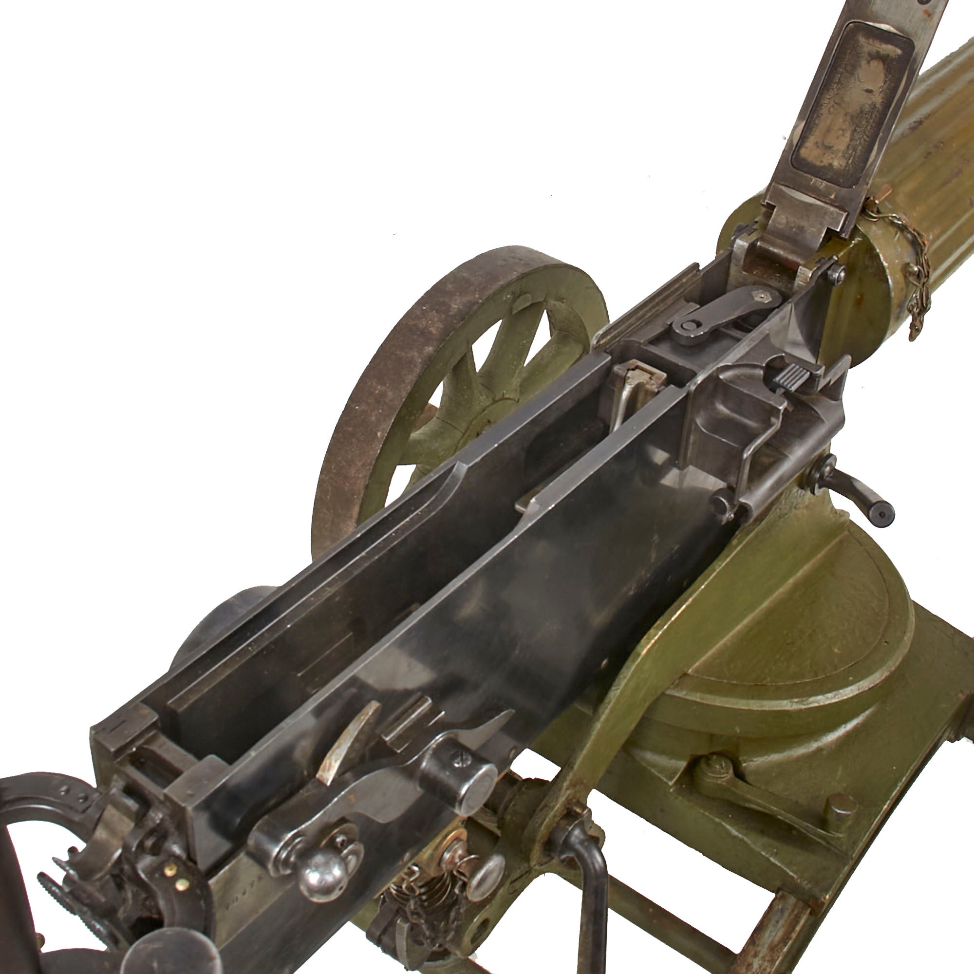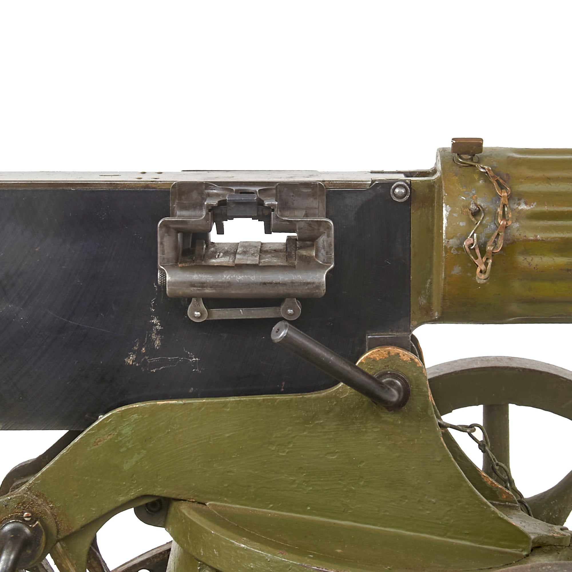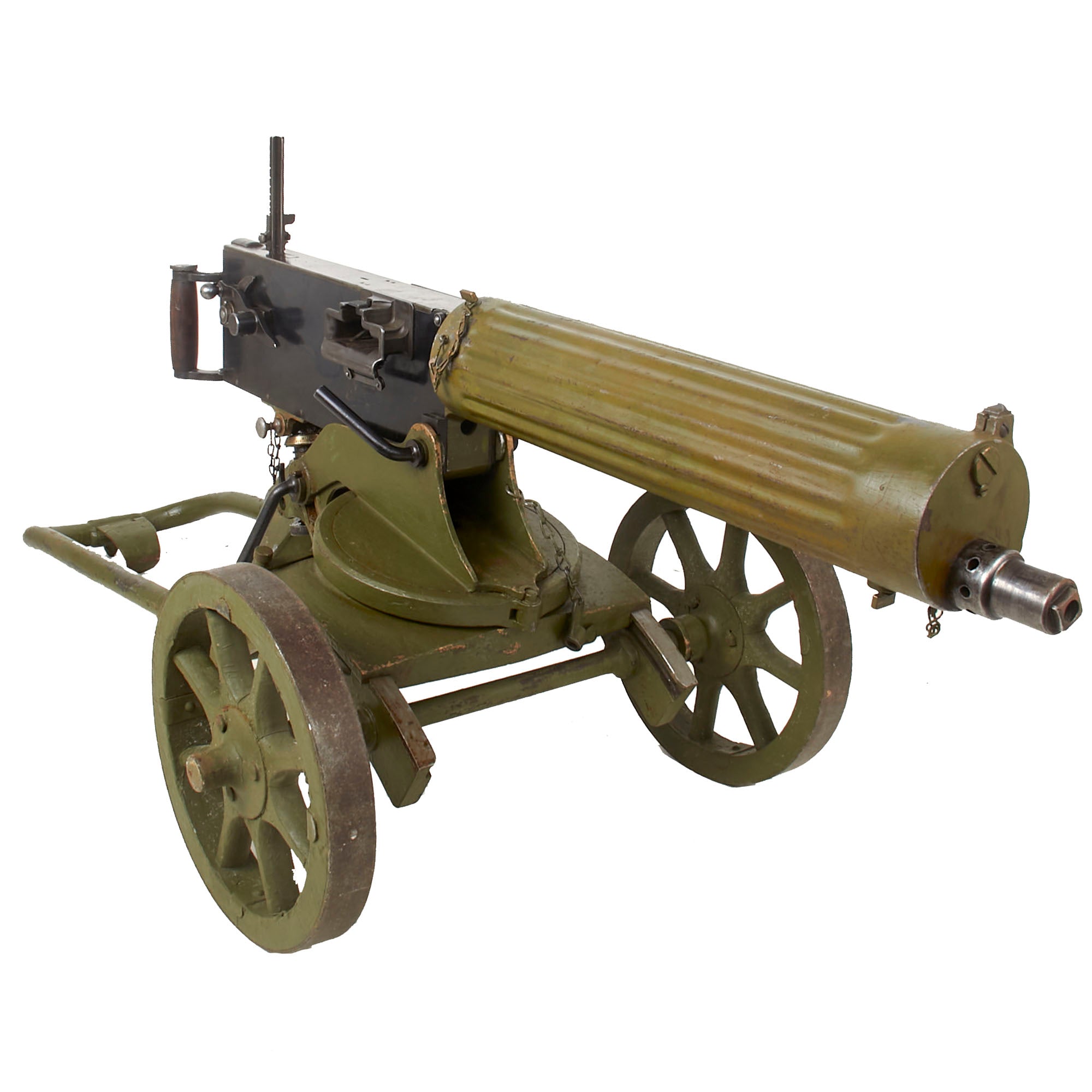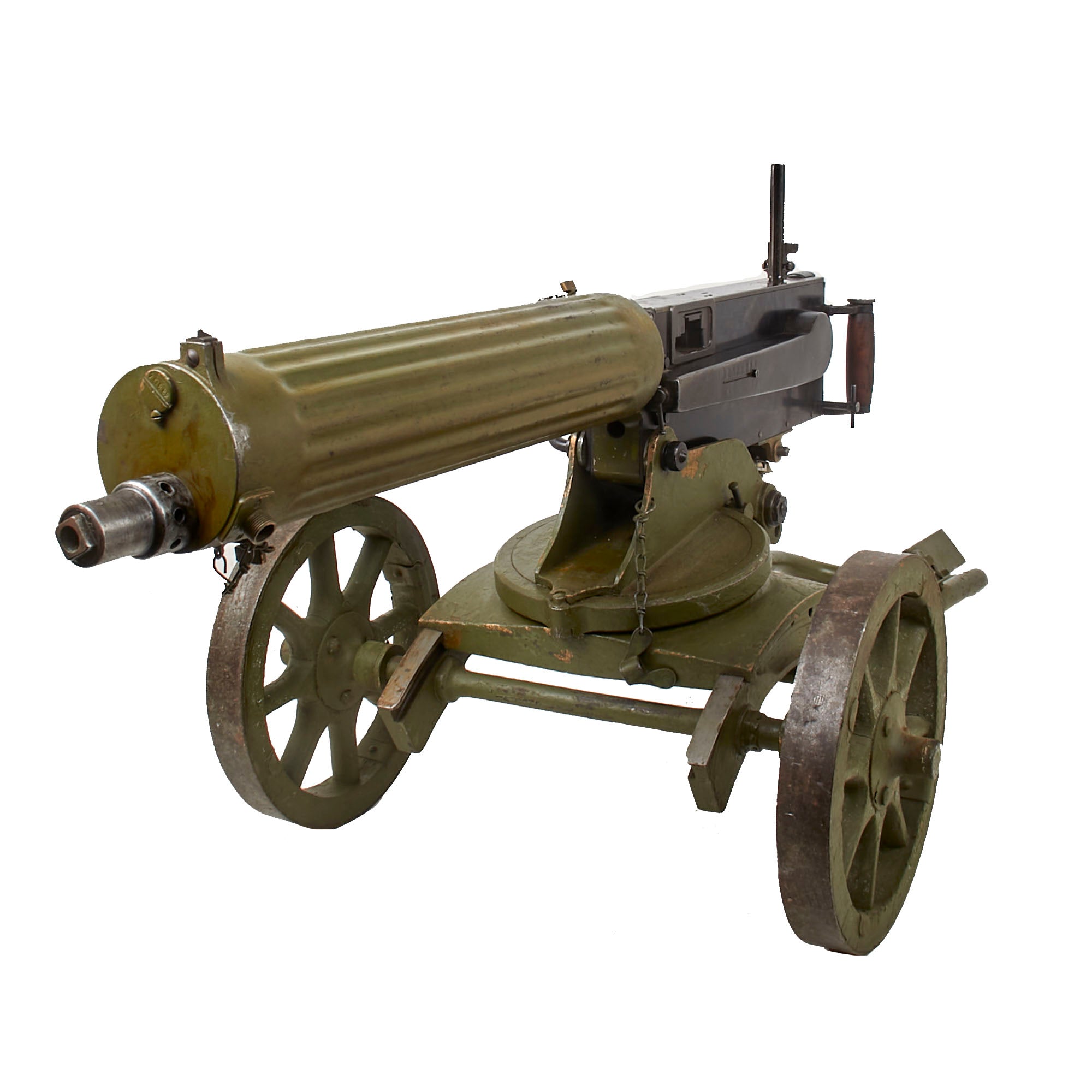 Original Item: Only One Available. One of the first we have had in some time! This fantastic original WWII issue Russian M-1910 Maxim Display Machine Gun was built to BATF specifications using an all original Russian Maxim parts sets assembled on a BATF compliant inert non-firing dummy receiver. Both the left and right side plate are BATF compliant and completely inert, newly made from steel several times as thick as the originals, which makes it impossible to insert unaltered original components. They lack any type of functional cams or protrusions, and as they are new made inert pieces this display "non-gun" is totally legal to own without any federal restrictions or license as it is no longer legally considered a firearm.