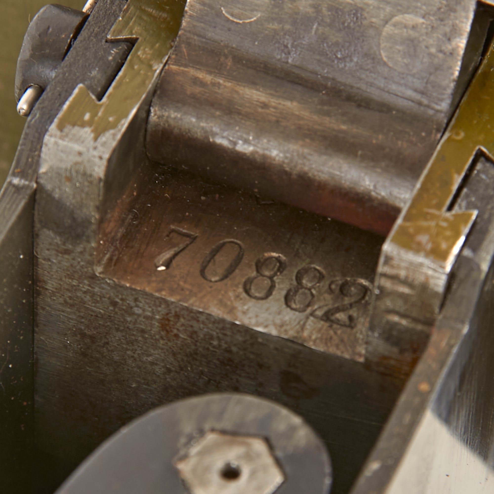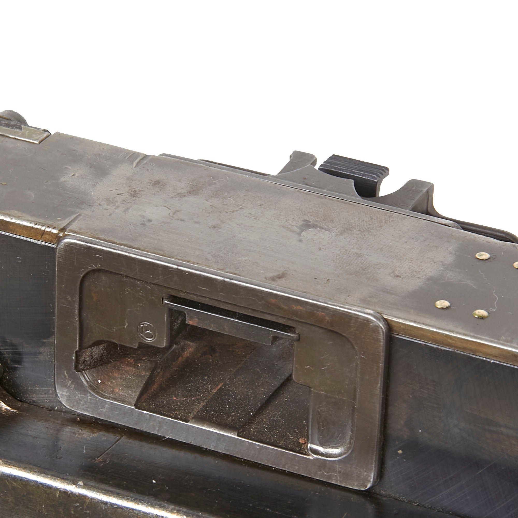 The inside of the receiver still incorporates many of the original internal components, which have been modified to fit into the narrower receiver, and have also been deactivated to BATF specifications by welding up the firing pin and some of the moving components. There is also a deactivated barrel inside the water jacket. The crank can still be moved back and forth with spring action. This example looks to be mostly made up of WWII Era parts, though it probably does have some WWI issue parts, as did many of the guns the Russians used during WWII.