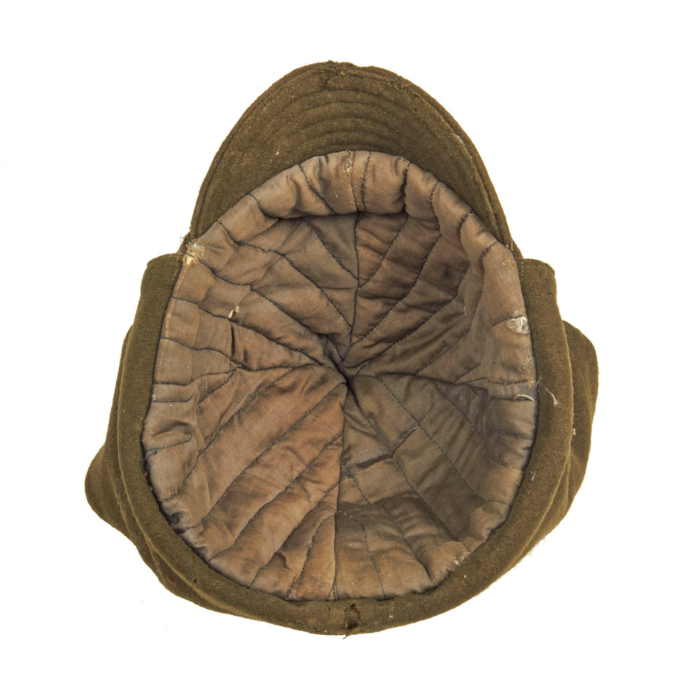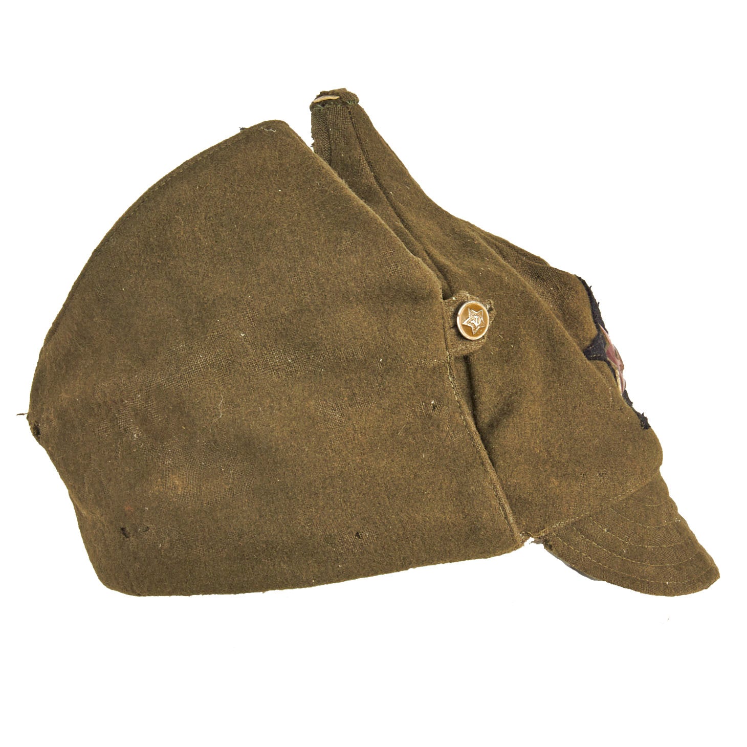 This is a very nice example of a WWII Issue Model 27 Budenovka Winter Cap, which is in very nice service used condition. The exterior is made from dark green wool, and it has a small fabric visor on the front. It has a raspberry colored star sewn on the front, which has a Soviet Red Star pinned in place. The star shows intact enamel and is made of non-ferrous metal.