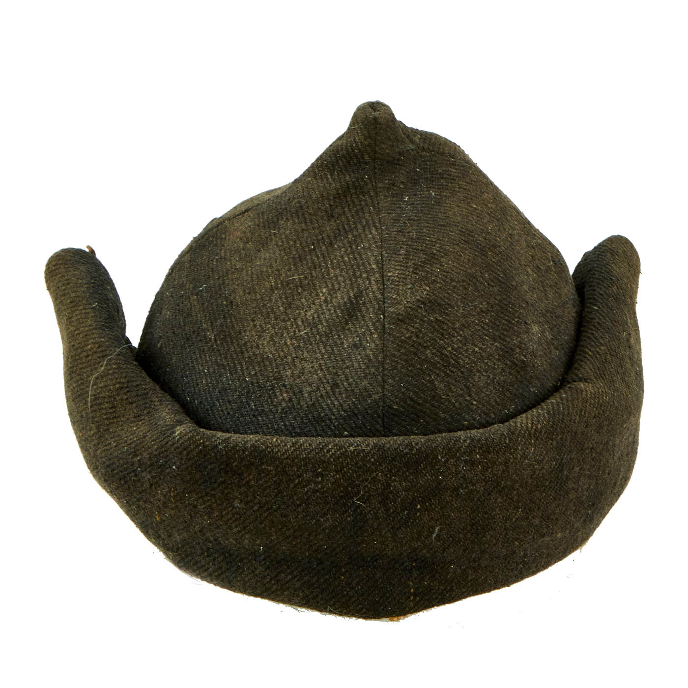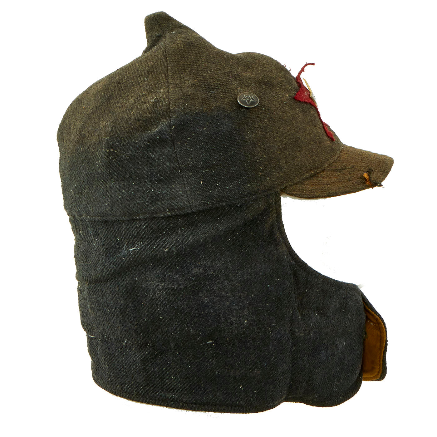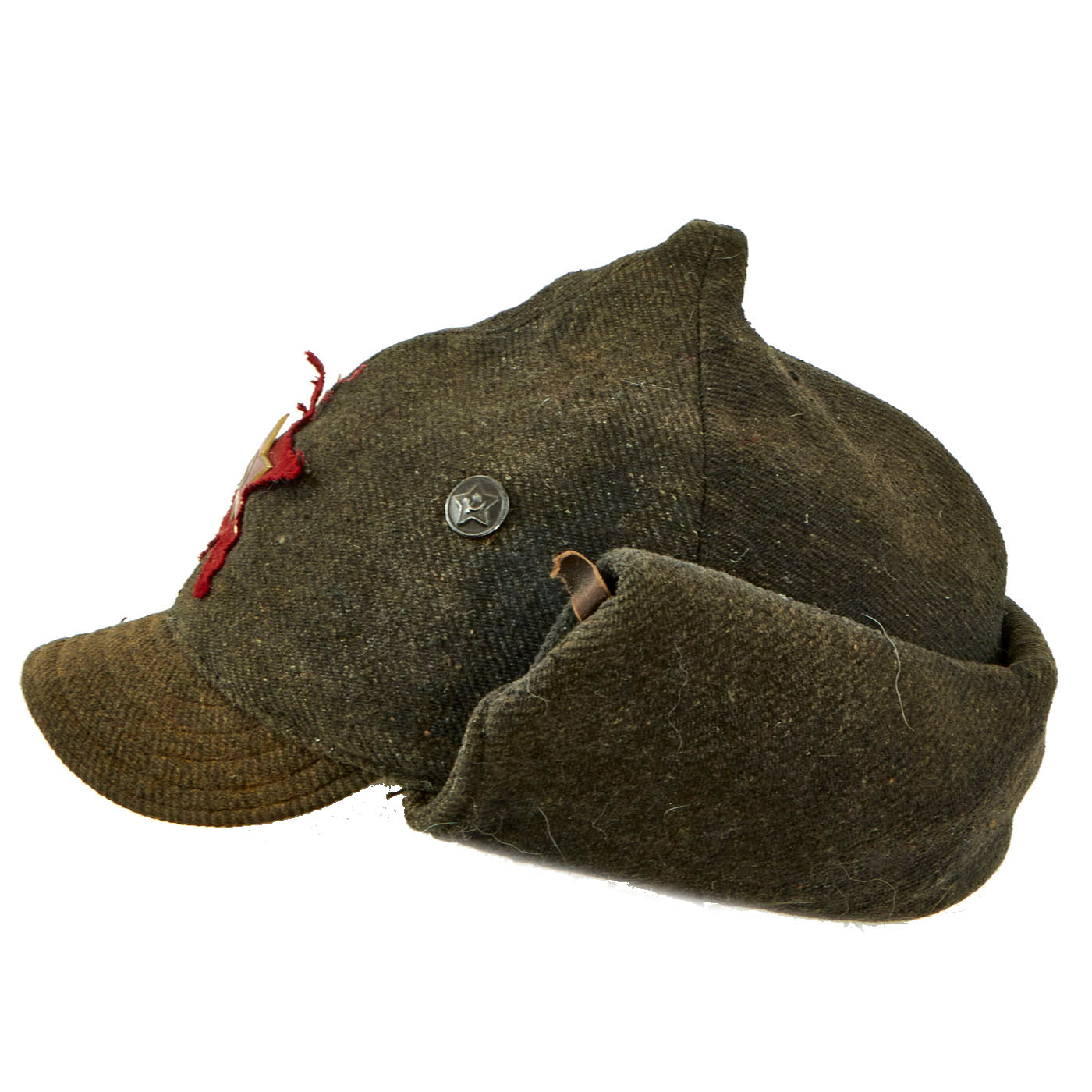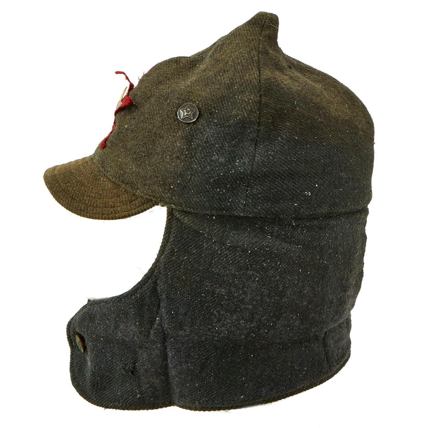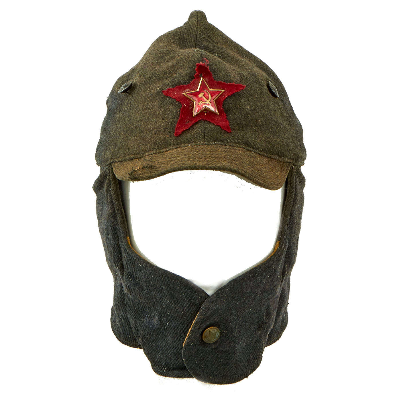 Original Item: Only One Available. A budenovka is a distinctive type of hat, an archetypal part of the Communist military uniforms of the Russian Civil War (1917-1922) and later conflicts. Its official name was the "broadcloth helmet" (шлем суконный). Named after Red cavalry commander Semyon Budyonny, it was also known as the "frunzenka" after the Commissar Mikhail Frunze. It is a soft, woolen hat that covers the ears and neck. The cap features a peak and folded ear flaps that can be buttoned under the chin.