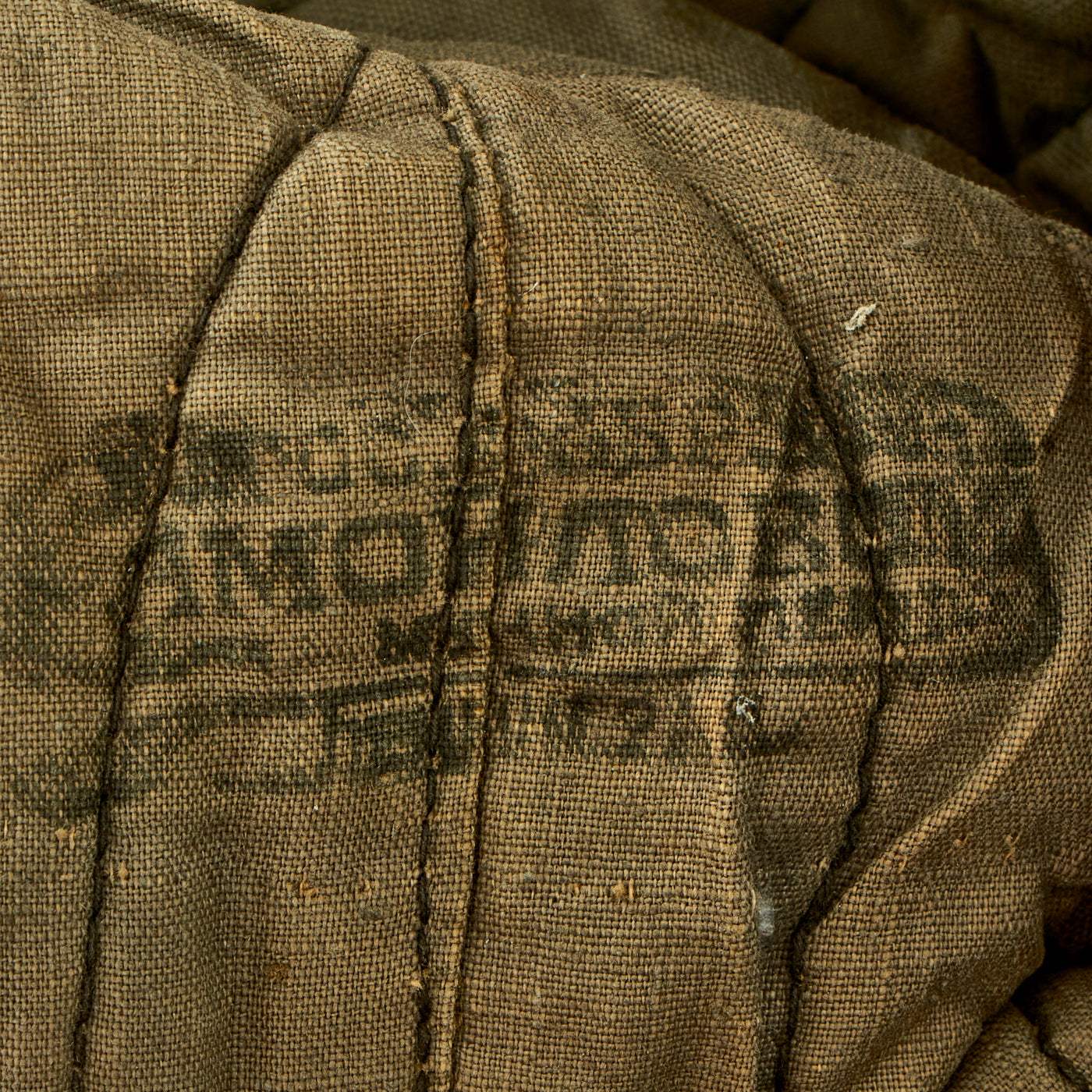 The interior is dark gray cloth, most likely cotton, with padding and insulation. There are the usual Soviet markings present, one of which being the year, but we can’t make it out.