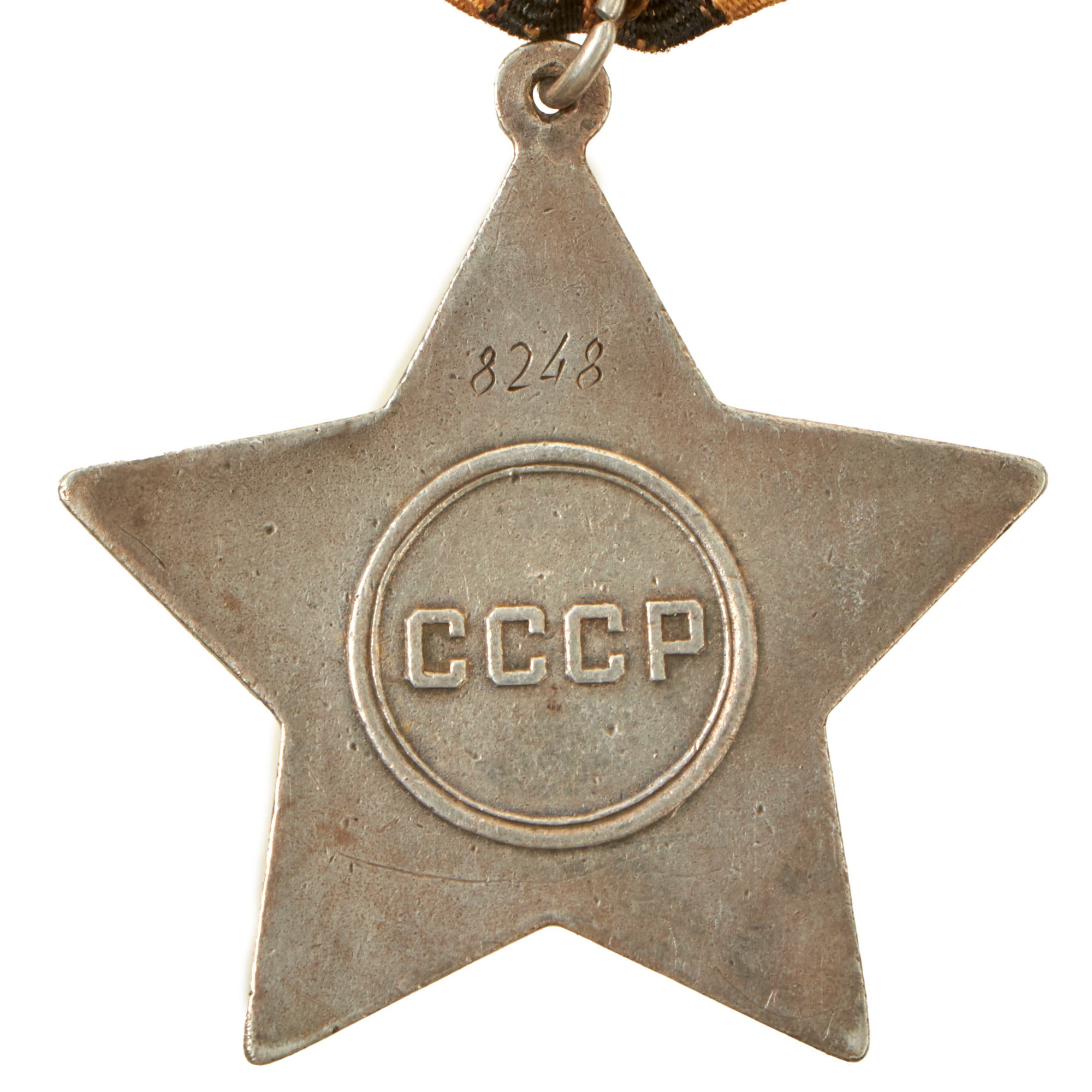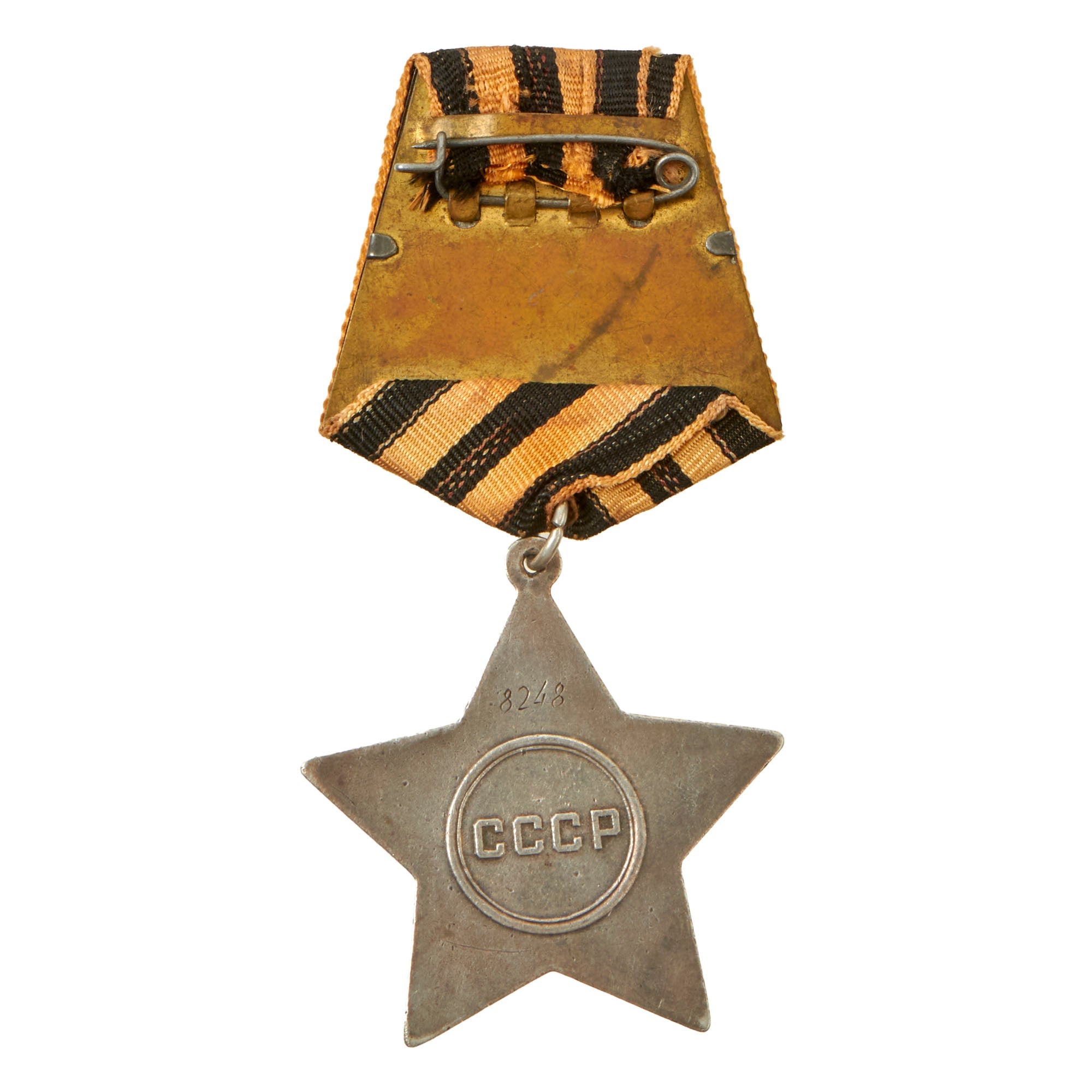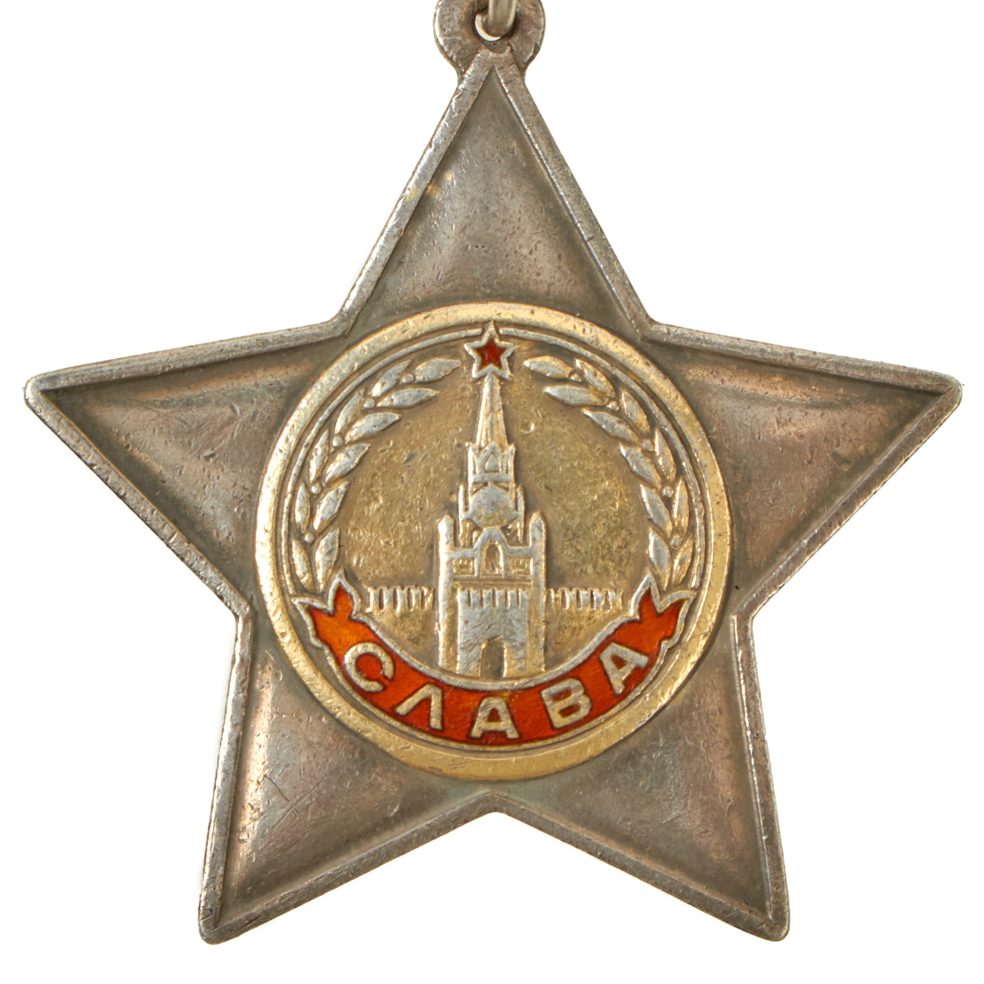 Original Item. Only One Available. The Order of Glory was a military decoration of the Soviet Union established by Decree of the Presidium of the Supreme Soviet on November 8, 1943. It was awarded to soldiers and non-commissioned officers of the Red Army as well as to aviation junior lieutenants, for bravery in the face of the enemy. It was awarded in three classes. The order's first class was made of 950 (23 karat) gold; the order's second class was made of silver with a gilt central medallion and the order's third class was made entirely of silver.