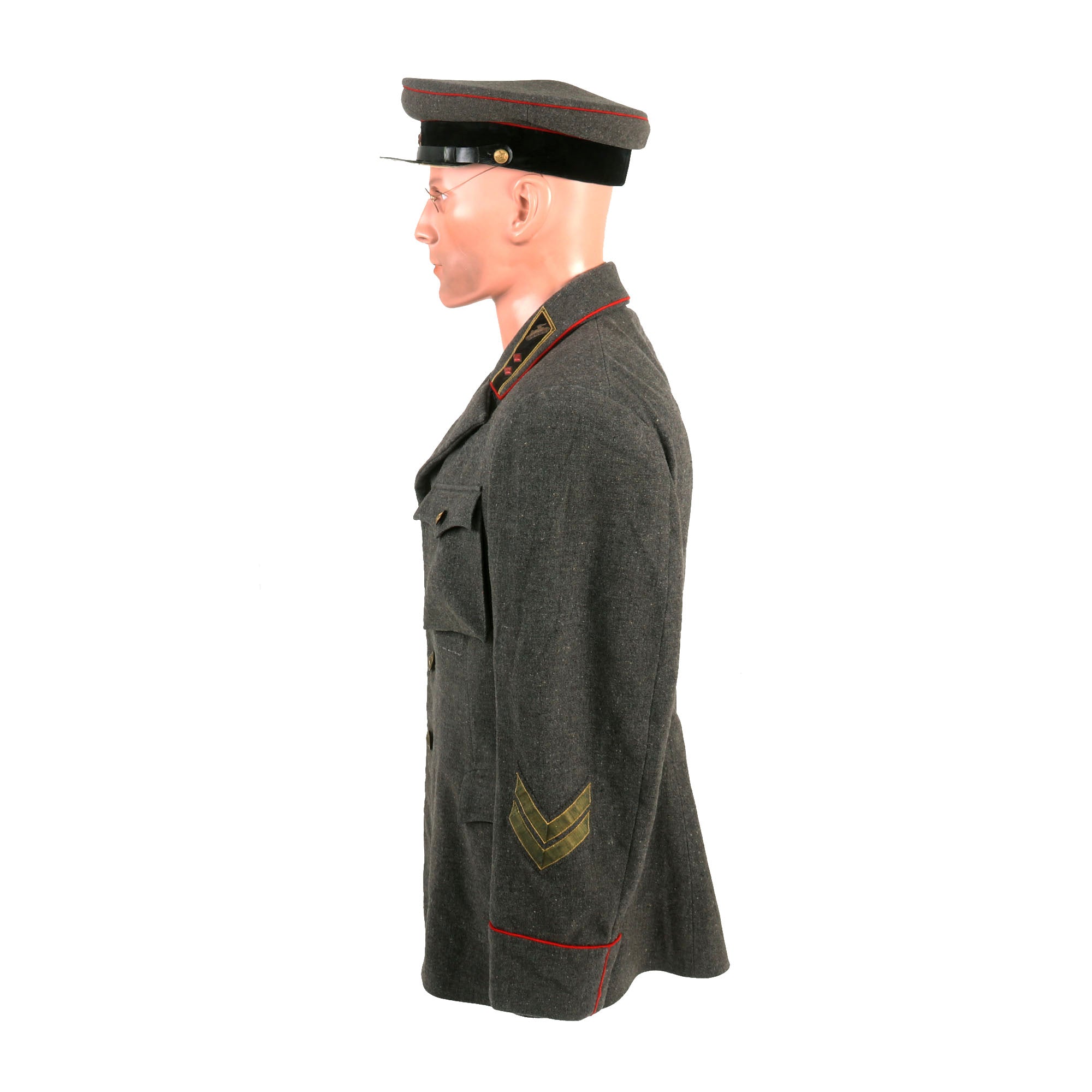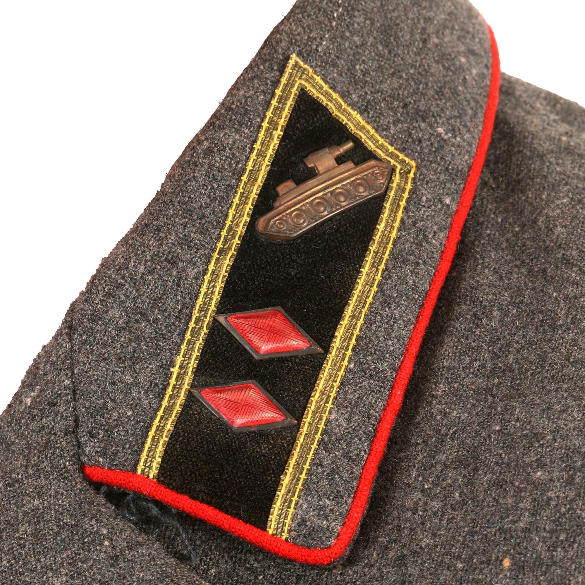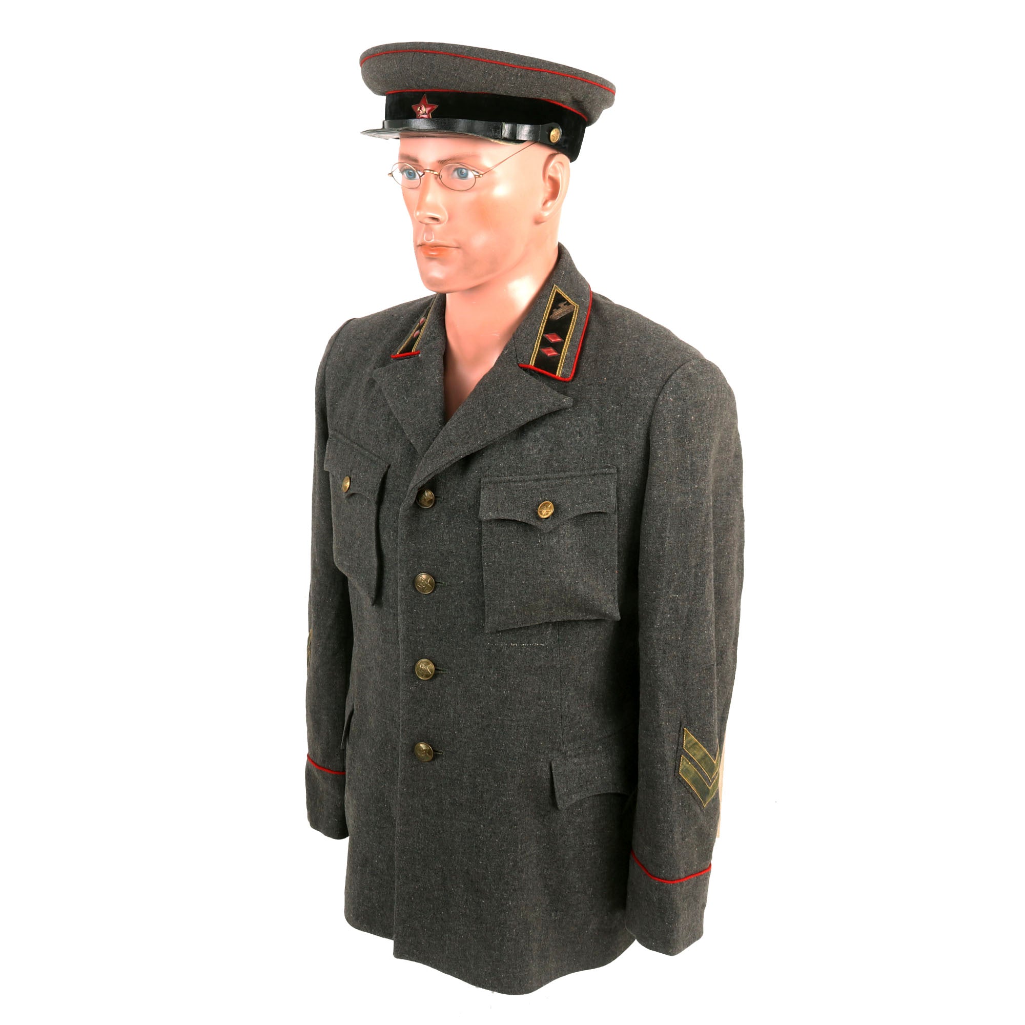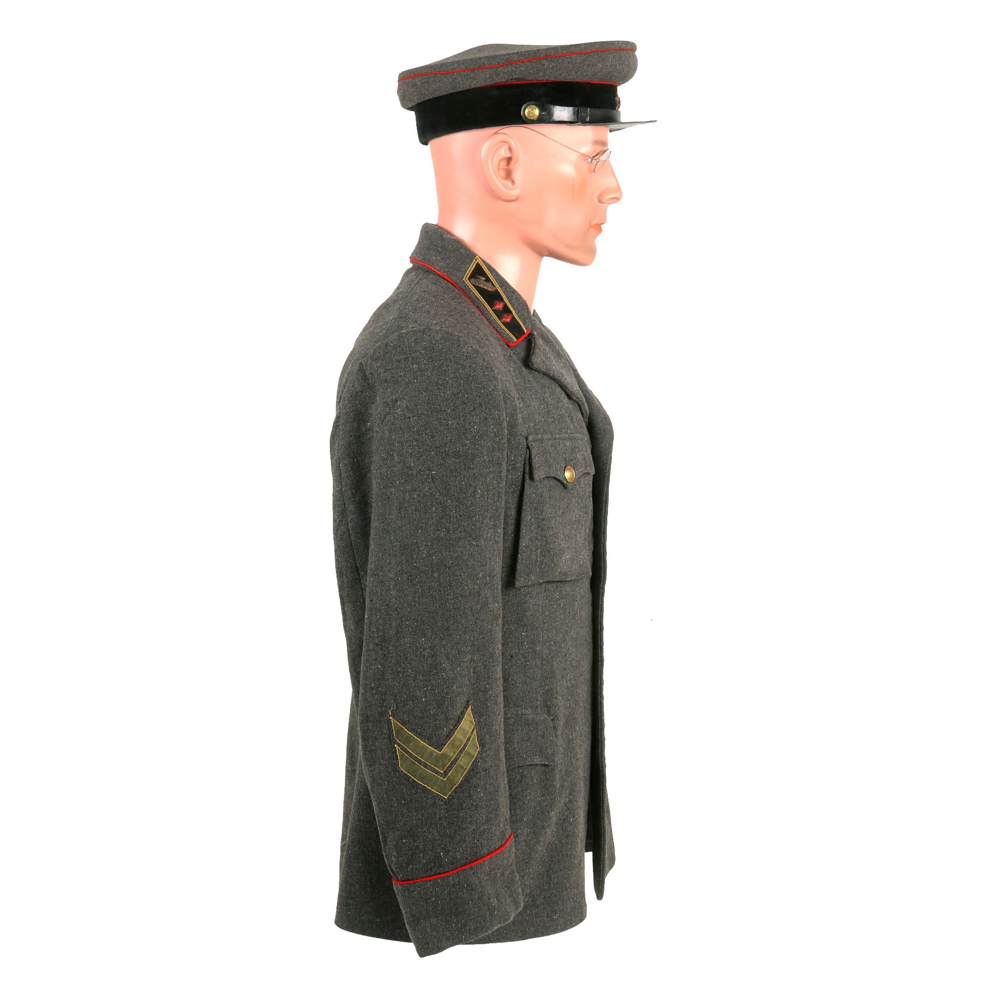 This is an original pattern 1935 tanker uniform set for the rank of Major General. The model 1935 uniform did not feature shoulder boards as the communist thinking at the time is that shoulder boards were a bourgeois indication of the Imperialist era. Introduced in 1935, the Red Army soldier was issued with both summer and winter field service dress. Both officers and men (other ranks) wore 'sharovari' trousers, a semi-breeches garment, the other ranks' issue being distinguished by the diamond-shaped reinforcing patches at the knees.