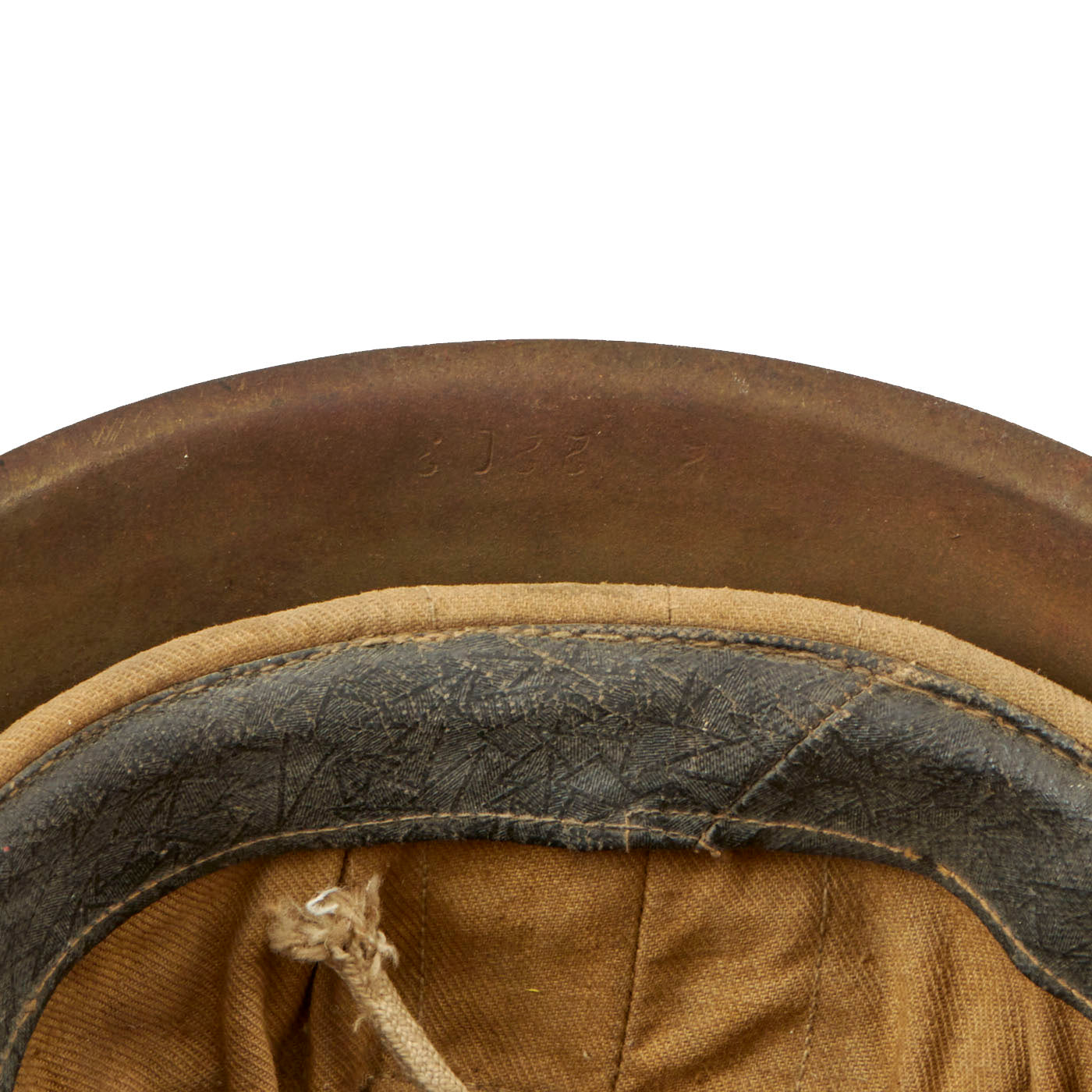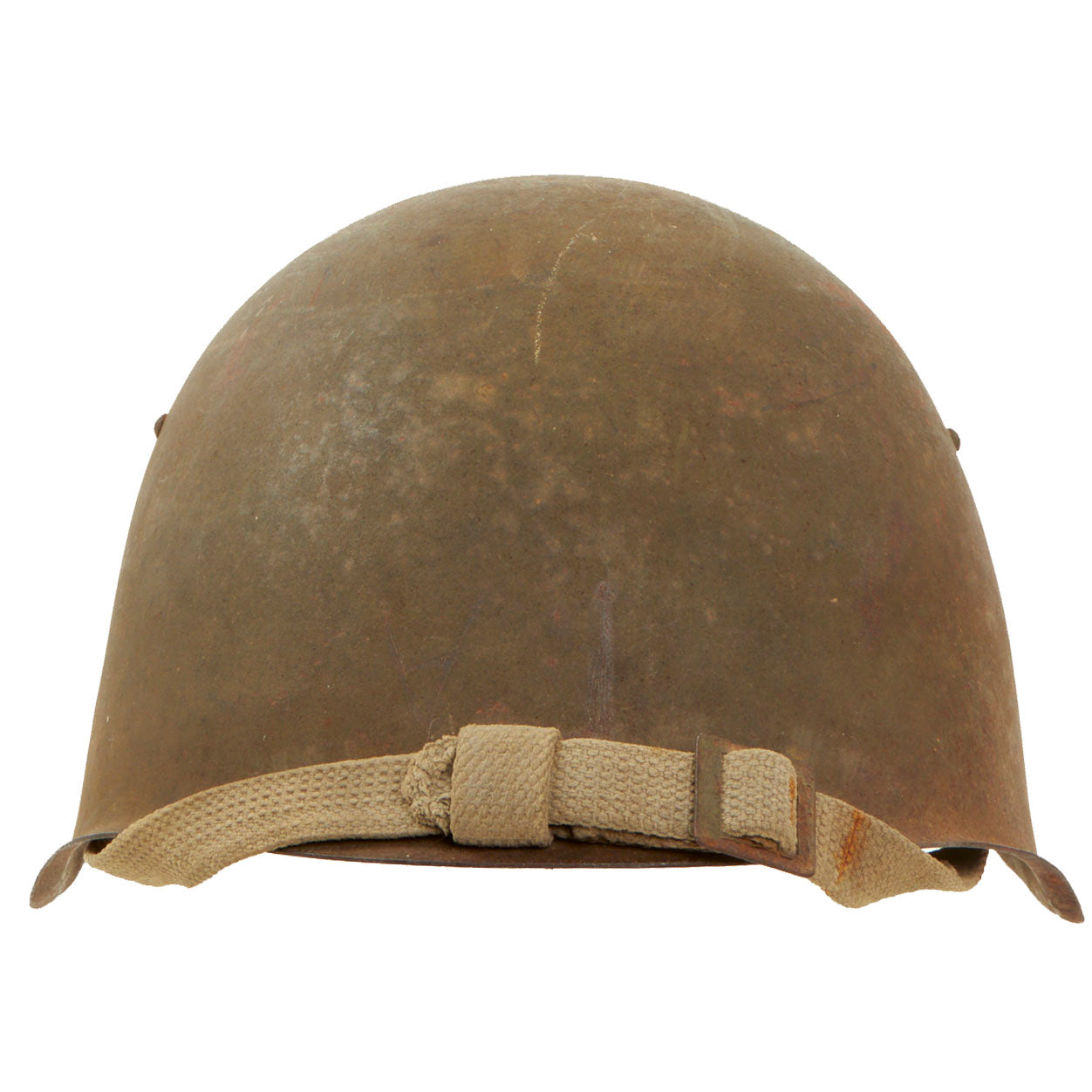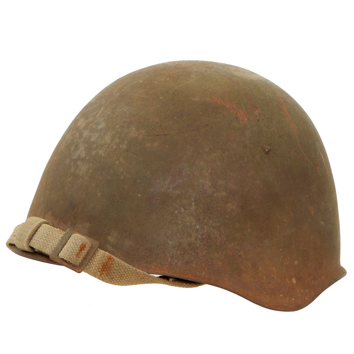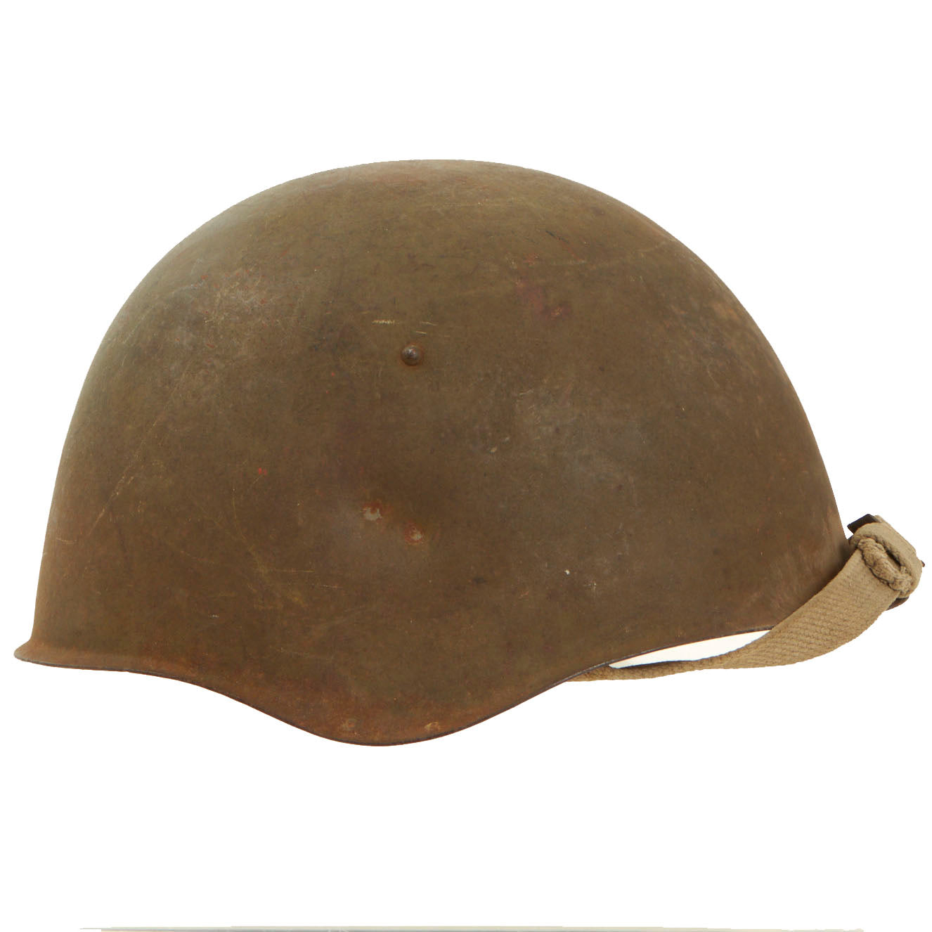 This example is an excellent specimen of a wartime manufactured Soviet Combat Helmet. Showing wear from honest use, patina from age and storage wear, this is a very sound specimen for a collector wishing to obtain an example of a WWII Soviet Combat Helmet. The liner is intact with its original drawstring cord, artificial leather sweatband, and unbroken chinstrap. The exterior and interior still retains a high proportion of original Soviet ordnance paint. On the left side of the helmet are two “dings”, low velocity impacts, likely from shrapnel balls. The reverse rim of the helmet is marked “2203”. There is no date stamp, which is not uncommon.