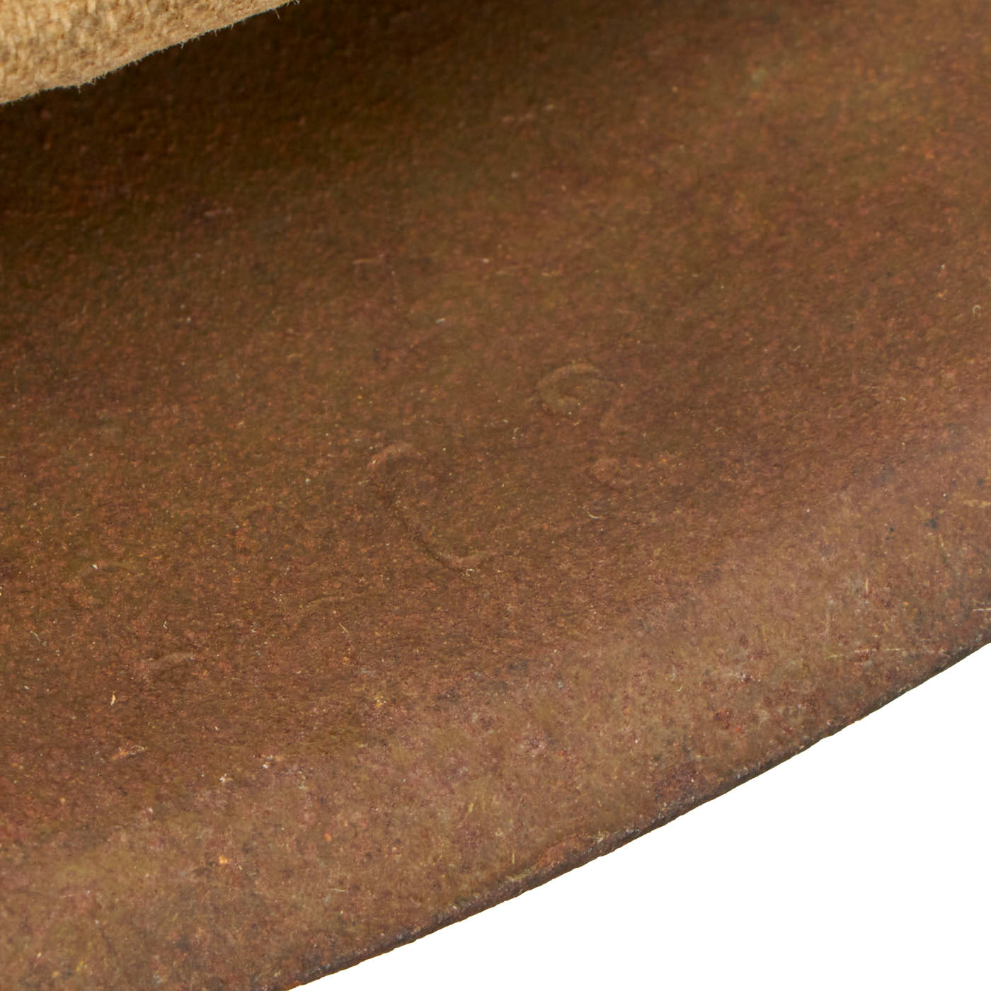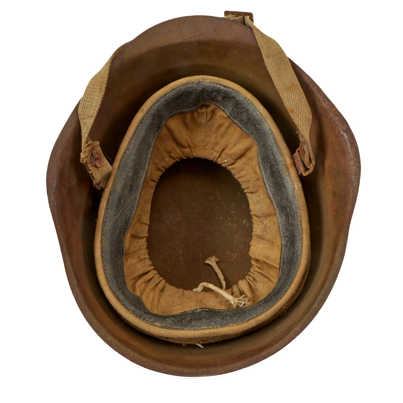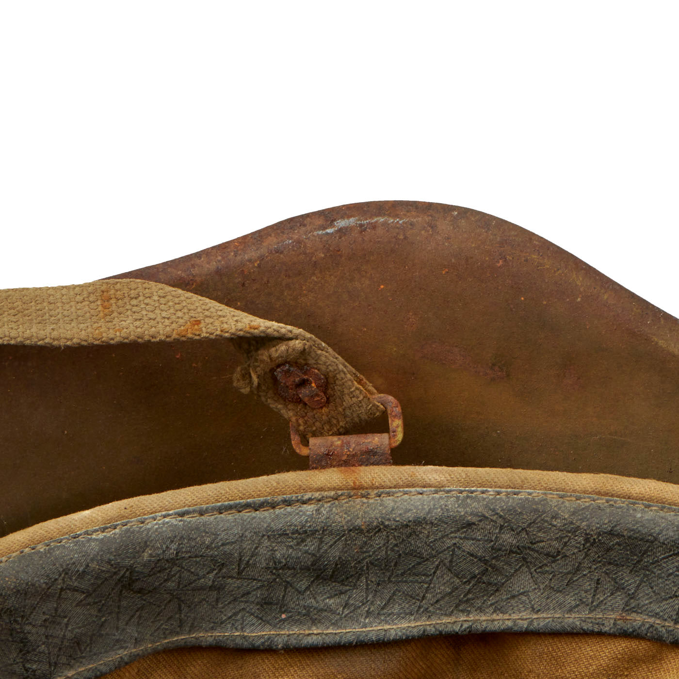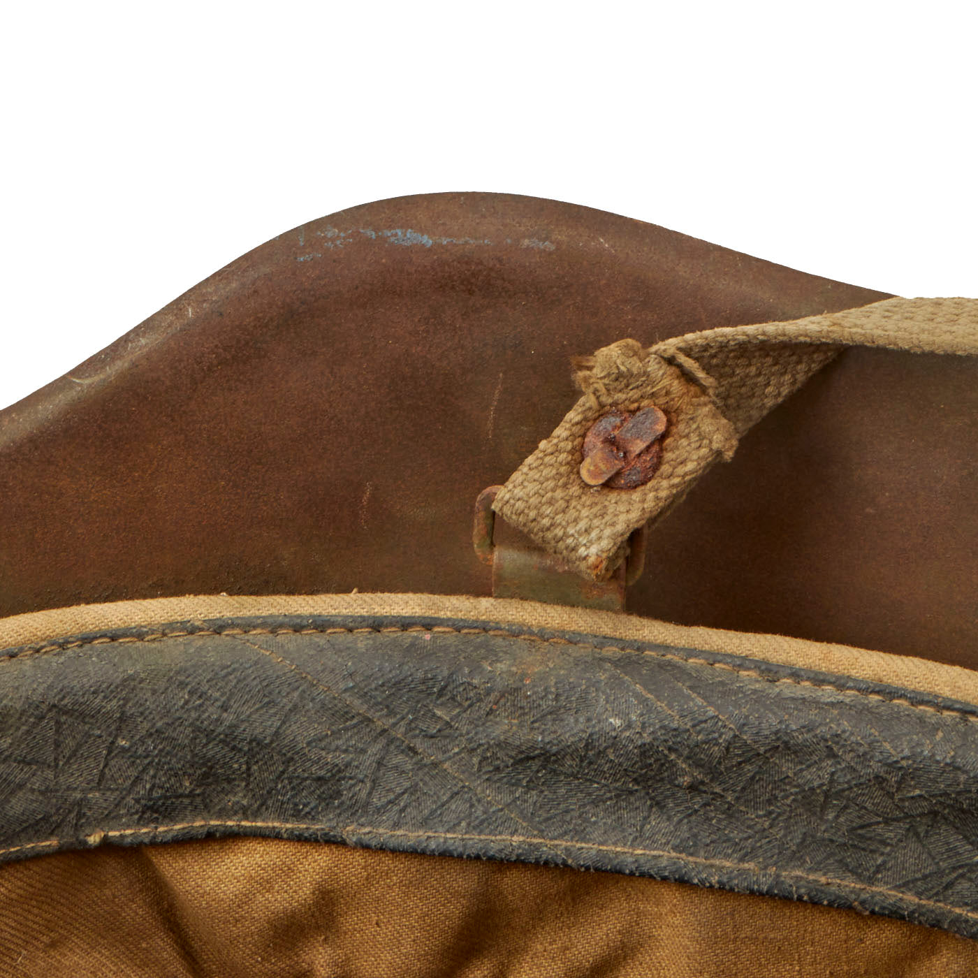 This example is an excellent specimen of a wartime manufactured Soviet Combat Helmet. Showing wear from honest use, patina from age and storage wear, this is a very sound specimen for a collector wishing to obtain an example of a WWII Soviet Combat Helmet. The liner is intact with its original drawstring cord, artificial leather sweatband, and unbroken chinstrap. The exterior and interior still retains a high proportion of original Soviet ordnance paint. On the left side of the helmet are two “dings”, low velocity impacts, likely from shrapnel balls. The reverse rim of the helmet is marked “2203”. There is no date stamp, which is not uncommon.