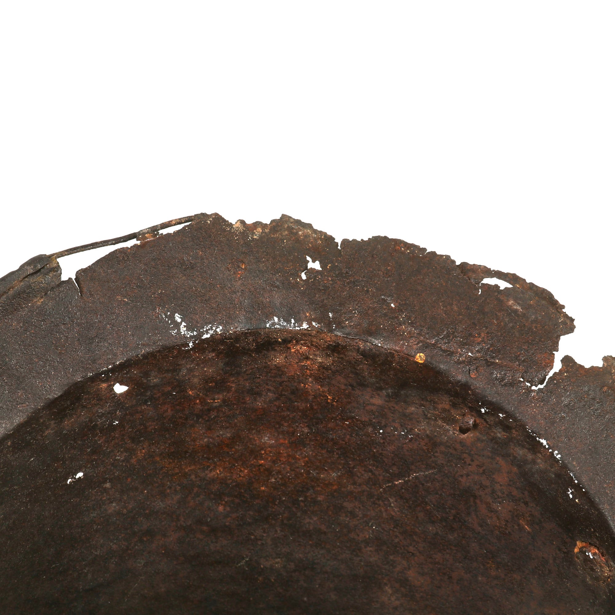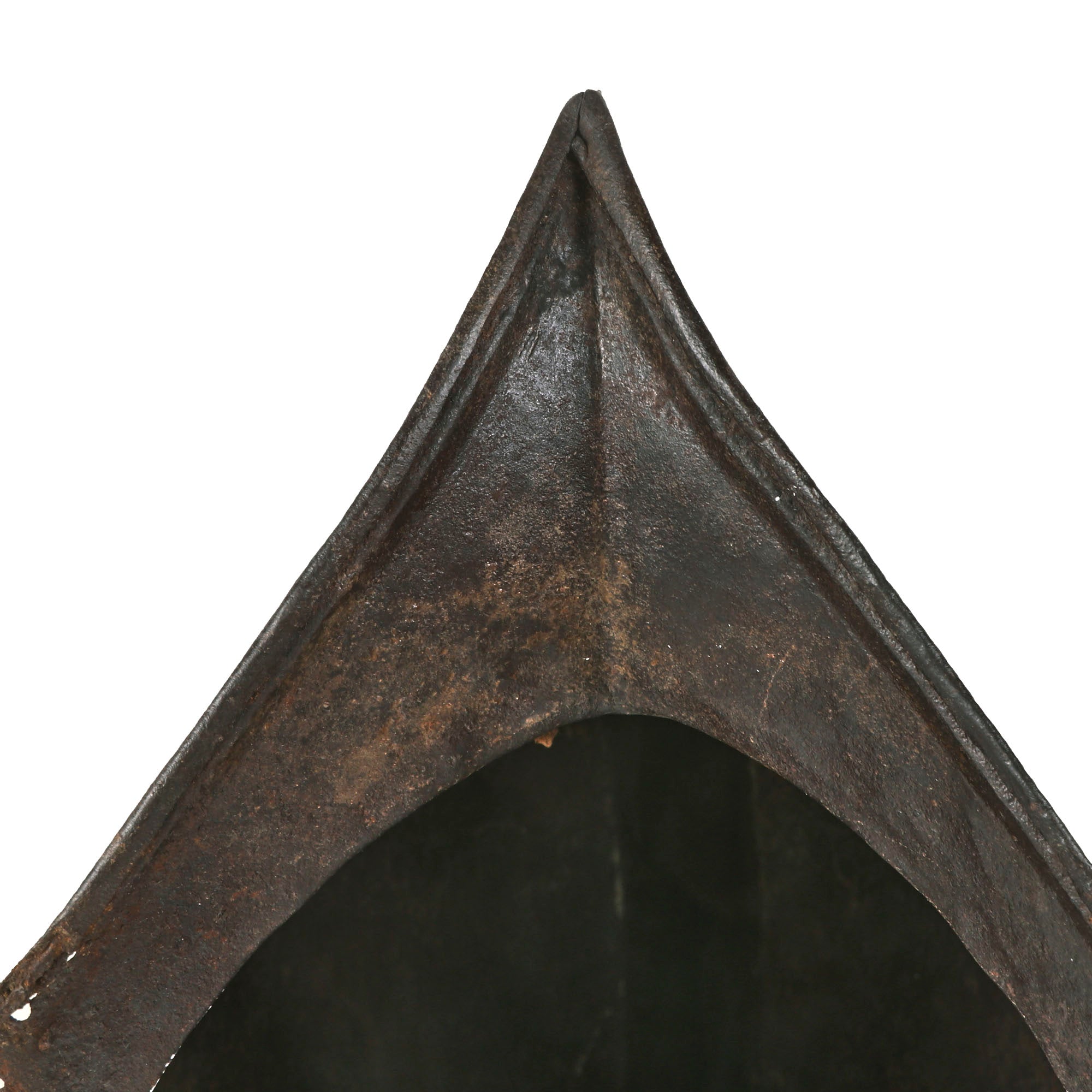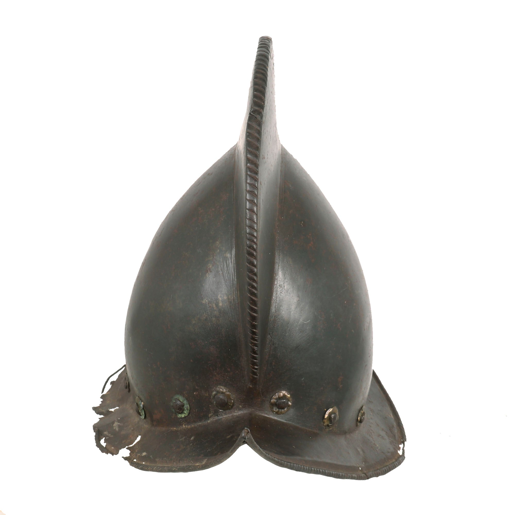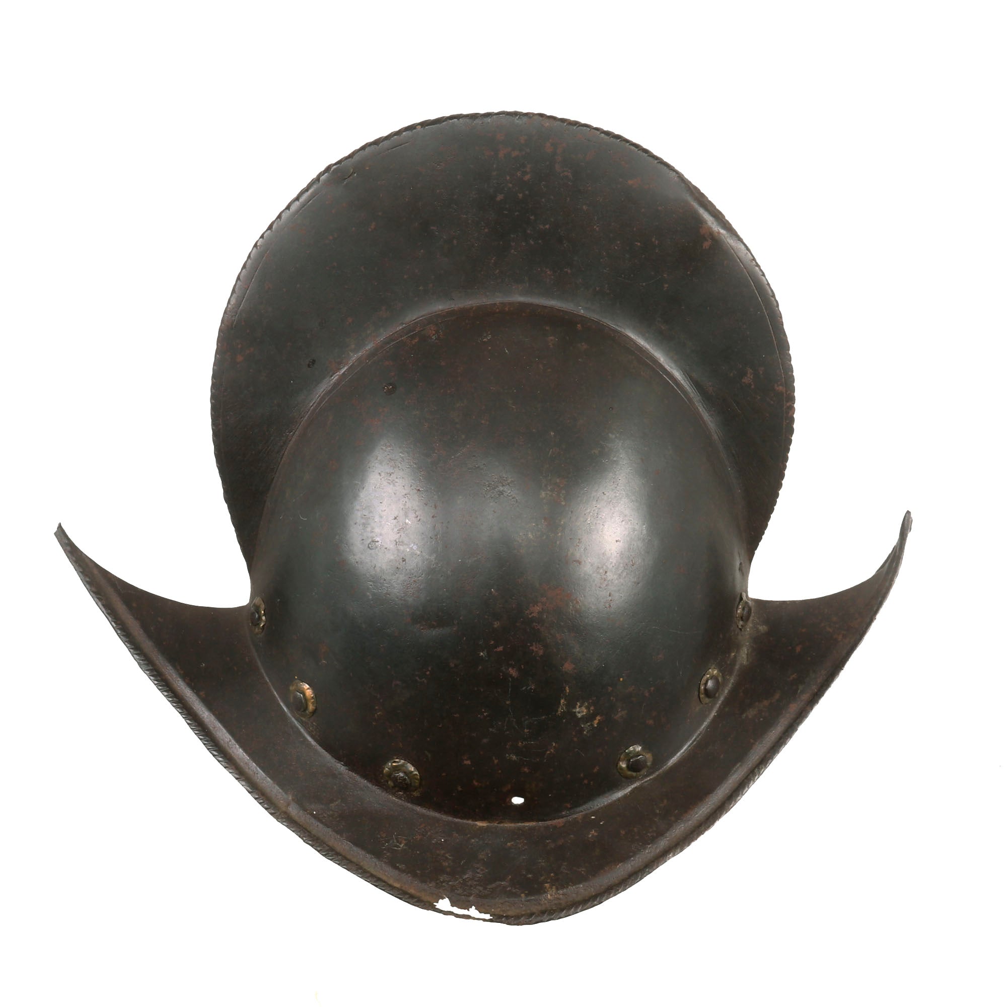 Original Item: One of a Kind. This is a gorgeous Spanish example of one of the most romantic helmets, usually found in connection to the New World. COMB MORIONS were used all over Europe especially in the various German States, England, France and Italy.A Morion is a type of open-faced combat helmet originally from Spain, used from the beginning of the 16th century to the early-17th century. The morion usually had a flat brim and a crest running from front to back. Its introduction was contemporaneous with European exploration of much of North, Central and South America - explorers such as Hernando de Soto and Coronado may have supplied morions to their foot-soldiers in the 1540s.This lovely example is fluted along the brim of the helmet and along the edge of the comb, a lovely design detail very characteristic of Spanish Morions from this period. Of the original 14 rivets that were affixed to the helmet, there are still twelve retained, but there is no remnant of the original liner outside of very small piece of leather attached to the ends of some rivets. Some of these rivets retain their floral patterning on the exterior. There is some heavy rusting and loss on both sides of the brim, with one side having much more loss. The helmet measures roughly 14” long and 11½” tall, and 9½” wide.This is a truly stunning example of a scarcely seen helmet, a real Spanish Morion dating to roughly the 1630s. Comes ready for further research and display!