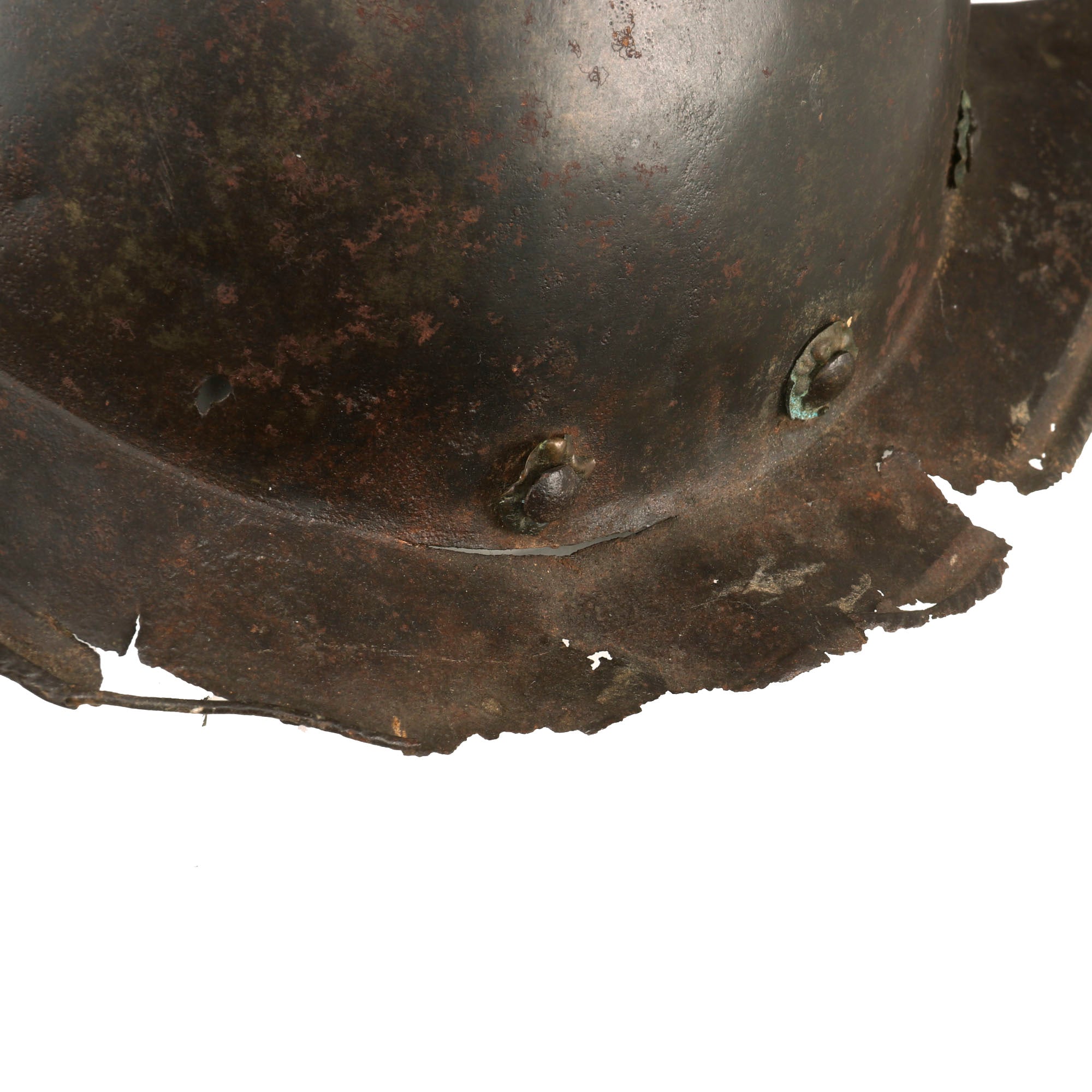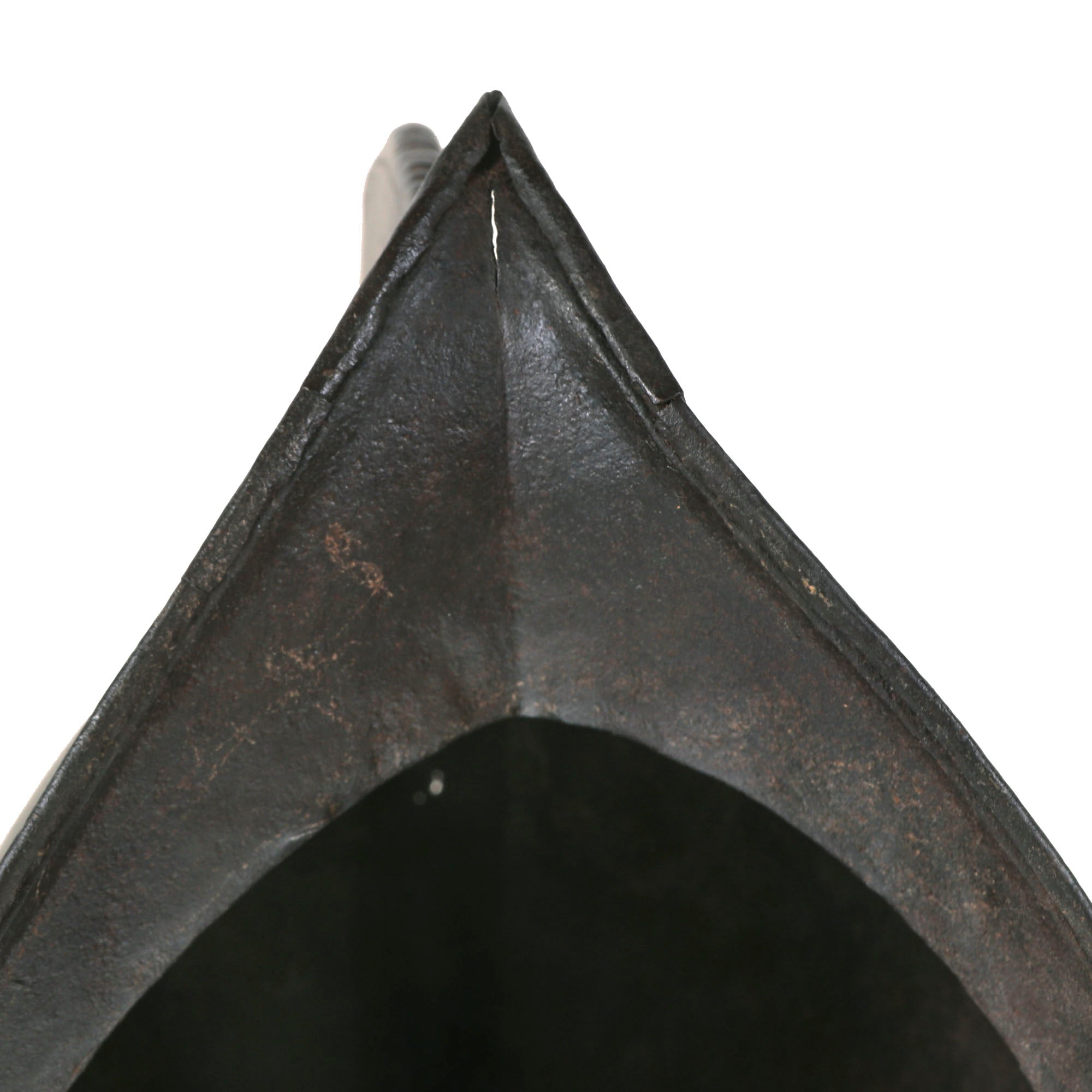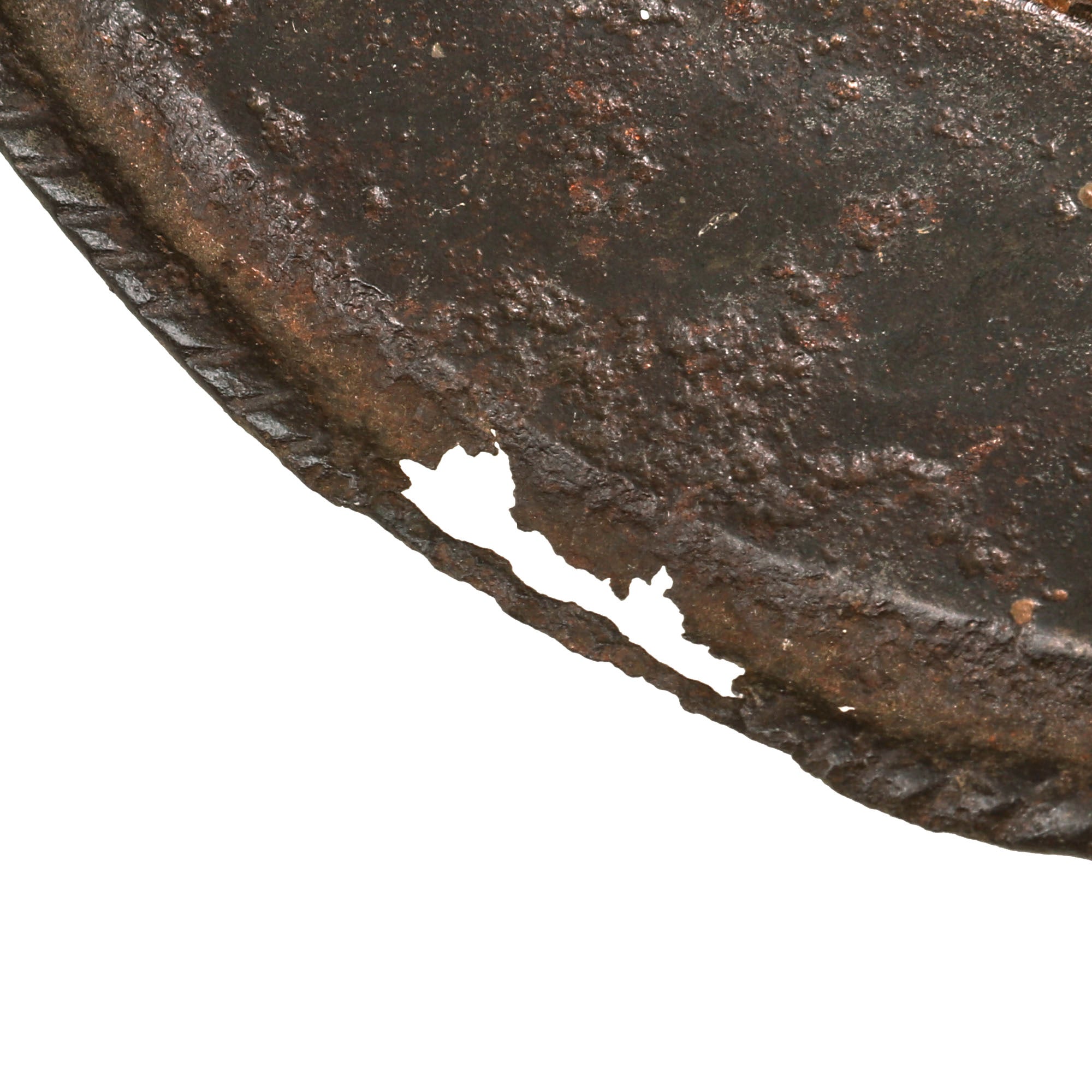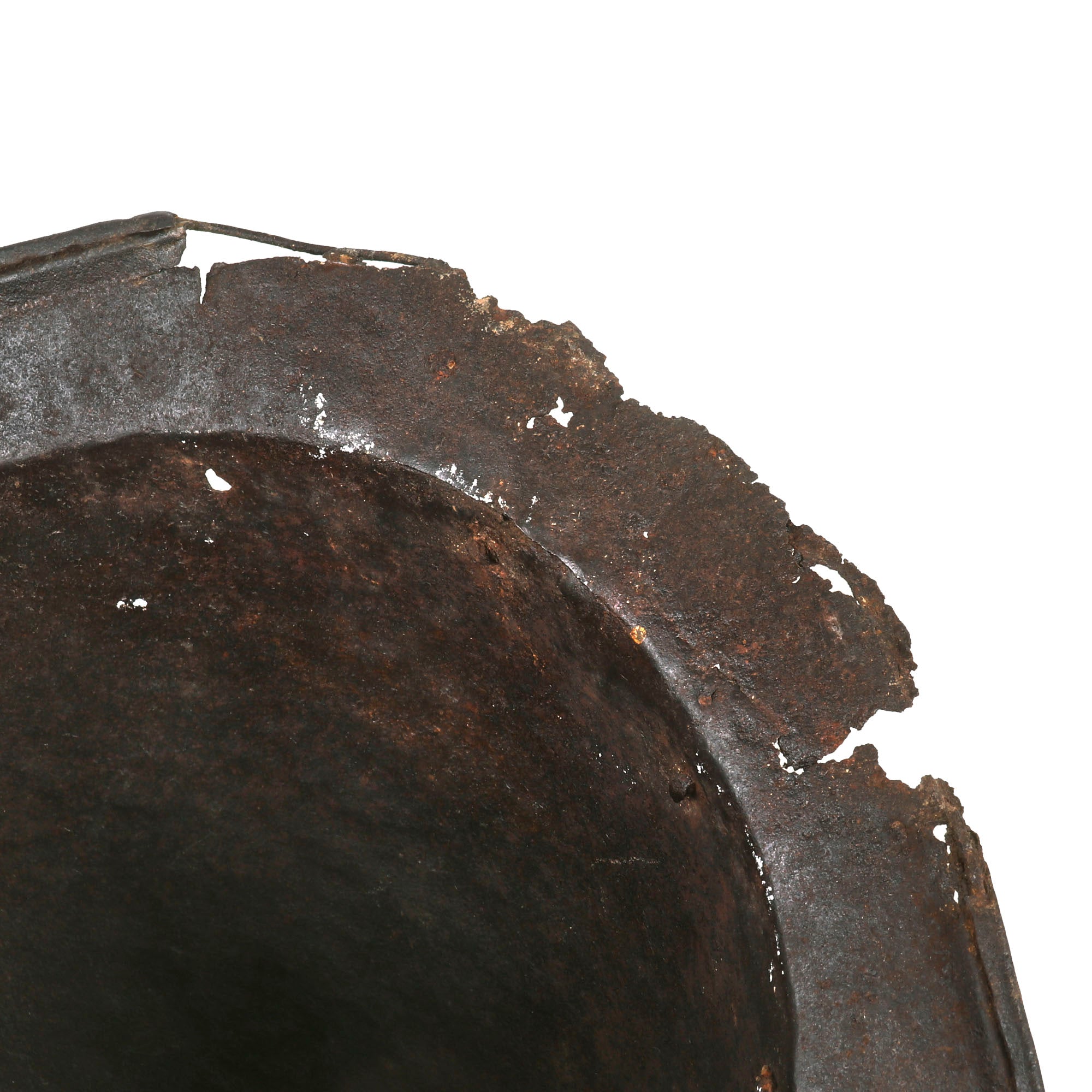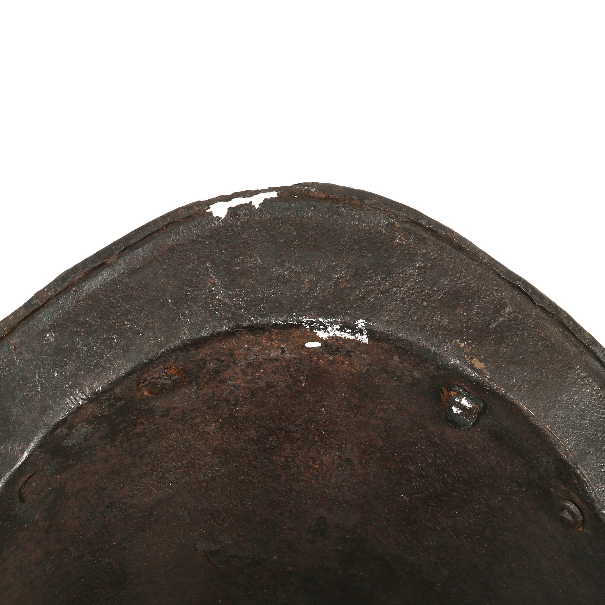 Original Item: One of a Kind. This is a gorgeous Spanish example of one of the most romantic helmets, usually found in connection to the New World. COMB MORIONS were used all over Europe especially in the various German States, England, France and Italy.A Morion is a type of open-faced combat helmet originally from Spain, used from the beginning of the 16th century to the early-17th century. The morion usually had a flat brim and a crest running from front to back. Its introduction was contemporaneous with European exploration of much of North, Central and South America - explorers such as Hernando de Soto and Coronado may have supplied morions to their foot-soldiers in the 1540s.This lovely example is fluted along the brim of the helmet and along the edge of the comb, a lovely design detail very characteristic of Spanish Morions from this period. Of the original 14 rivets that were affixed to the helmet, there are still twelve retained, but there is no remnant of the original liner outside of very small piece of leather attached to the ends of some rivets. Some of these rivets retain their floral patterning on the exterior. There is some heavy rusting and loss on both sides of the brim, with one side having much more loss. The helmet measures roughly 14” long and 11½” tall, and 9½” wide.This is a truly stunning example of a scarcely seen helmet, a real Spanish Morion dating to roughly the 1630s. Comes ready for further research and display!