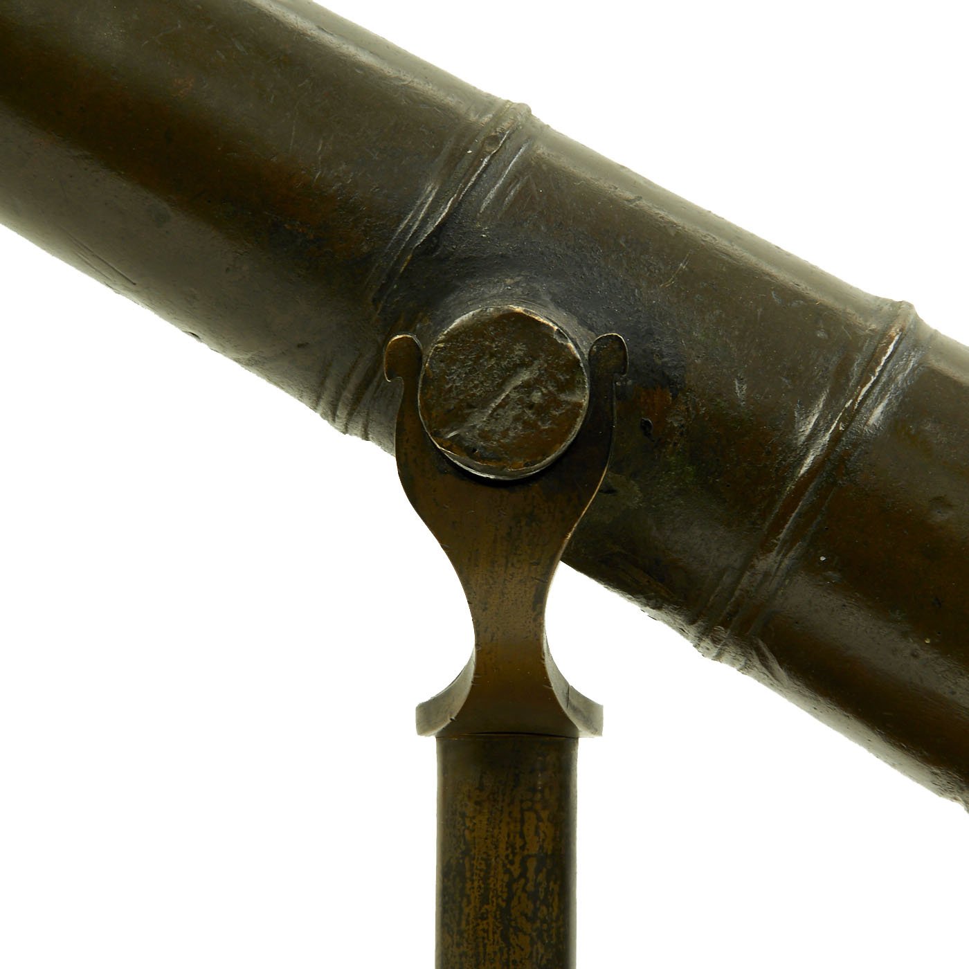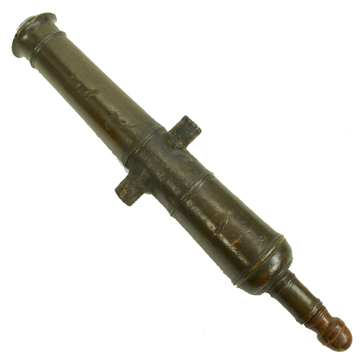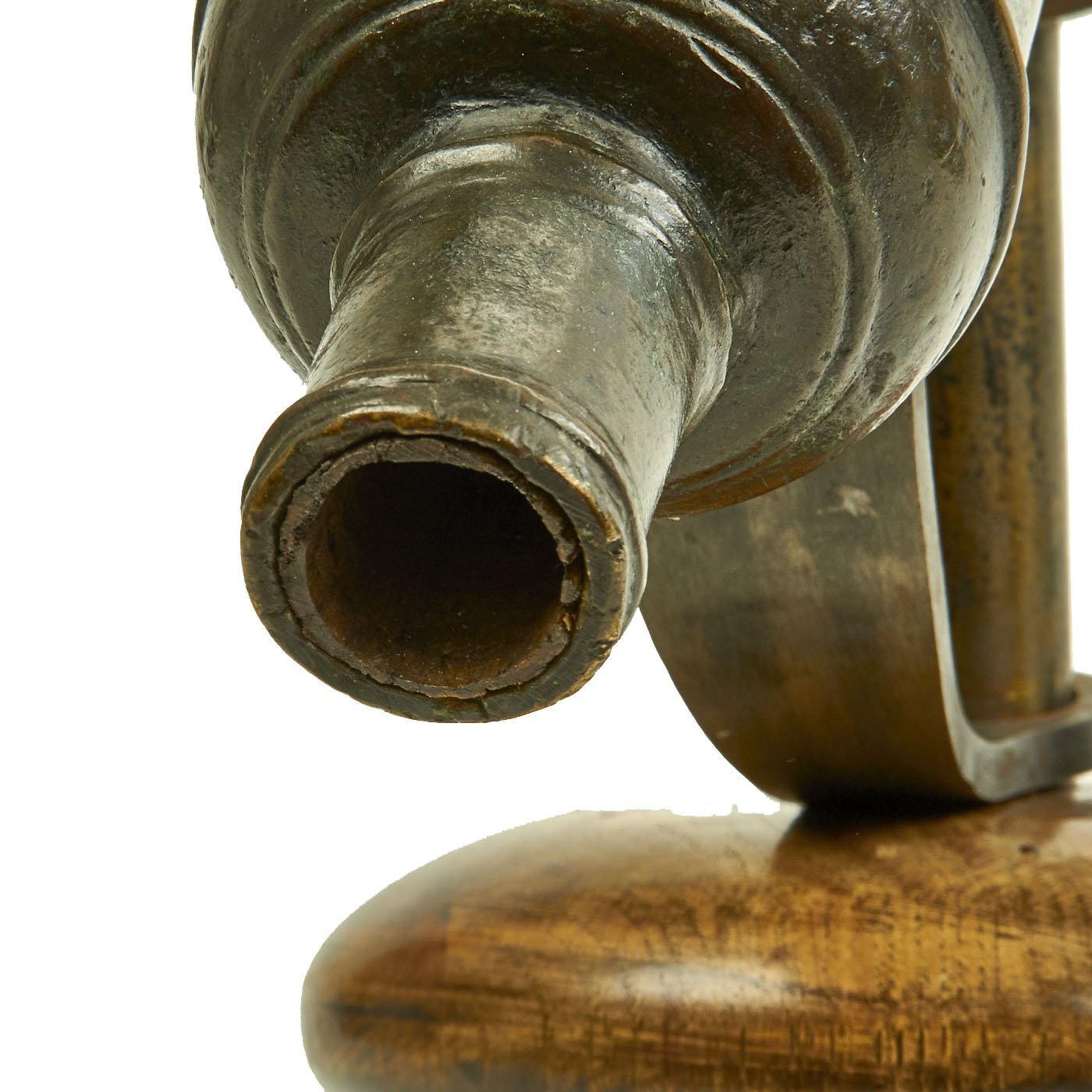 This fine, bronze swivel gun (cannon) is unmarked, but it is mid-18th century in form and almost certainly of Spanish Colonial origin, based on comparable examples known from Spanish New World archaeological sites. The yoke-shaped, swivel mount of heavy brass is quality production more modern than the cannon, as is the turned wooden stanchion base. There is a turned oak plug of some age inserted in the socket-shaped cascabel at the breech of the gun, in lieu of a longer wooden tiller or aiming arm that would have been more commonly used during the period. Such small cannon were commonly mounted in the fighting tops or on the quarterdeck and forescastle rails of ships, principally as anti-personnel weapons, as well as mounted on frontier fort walls and in blockhouses.