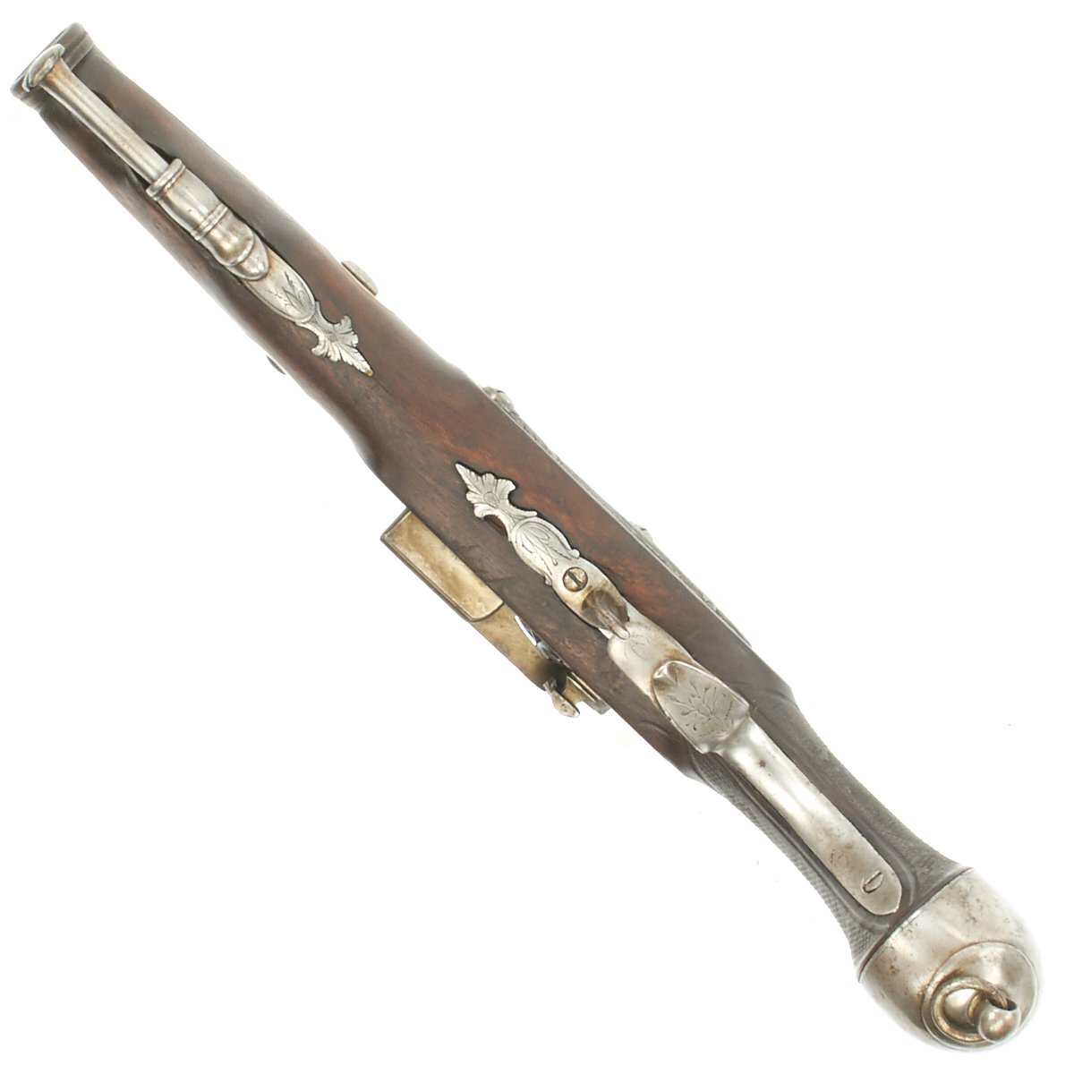 The pistol has lightly engraved iron mounts, the most impressive of which is the side plate, depicting a a snake like Sea Serpent devouring the forward lock bolt head. The grip is checkered and still very crisp, and the lock is clearly engraved En Eibar. The percussion hammer depicts a lion or griffin type monster, whose mouth falls upon the cap nipple. Comes Complete with its all iron ramrod in lovely condition.