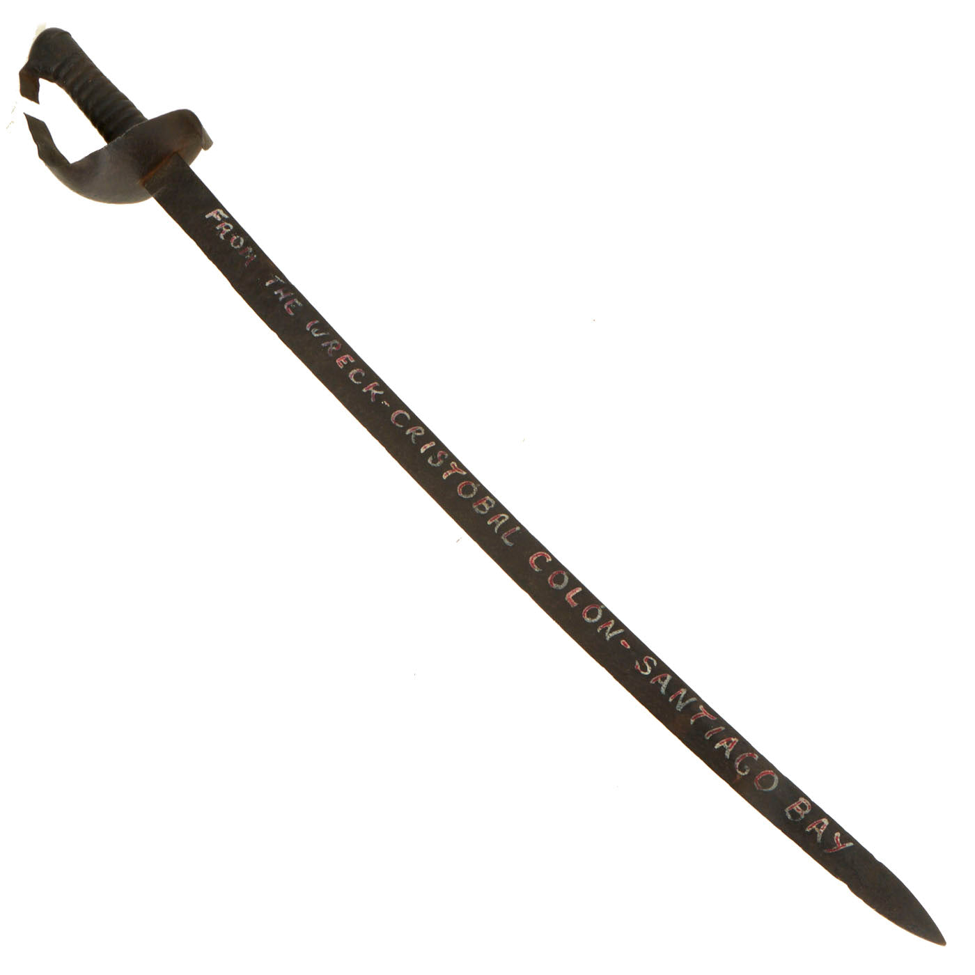 Original Item: One of Kind. Where here is a great bit of U.S. Naval History! This Spanish naval boarding cutlass was recovered from the wreck of the battle cruiser Cristóbal Colón, sunk 3 July 1898 during the Spanish-American War. She was 8000 tons and 112 meters in length, built in Italy as a Giuseppe Garibaldi-class armored cruiser, an ultra modern design. She was then sold to the Spanish Navy, and was acquired 16 May 1897.