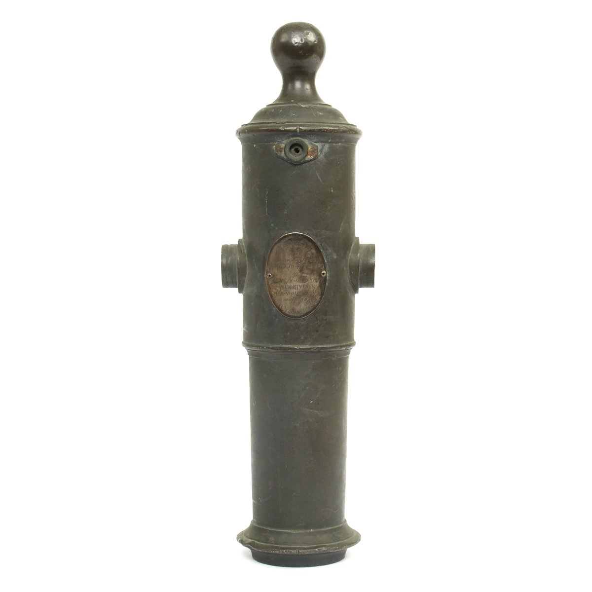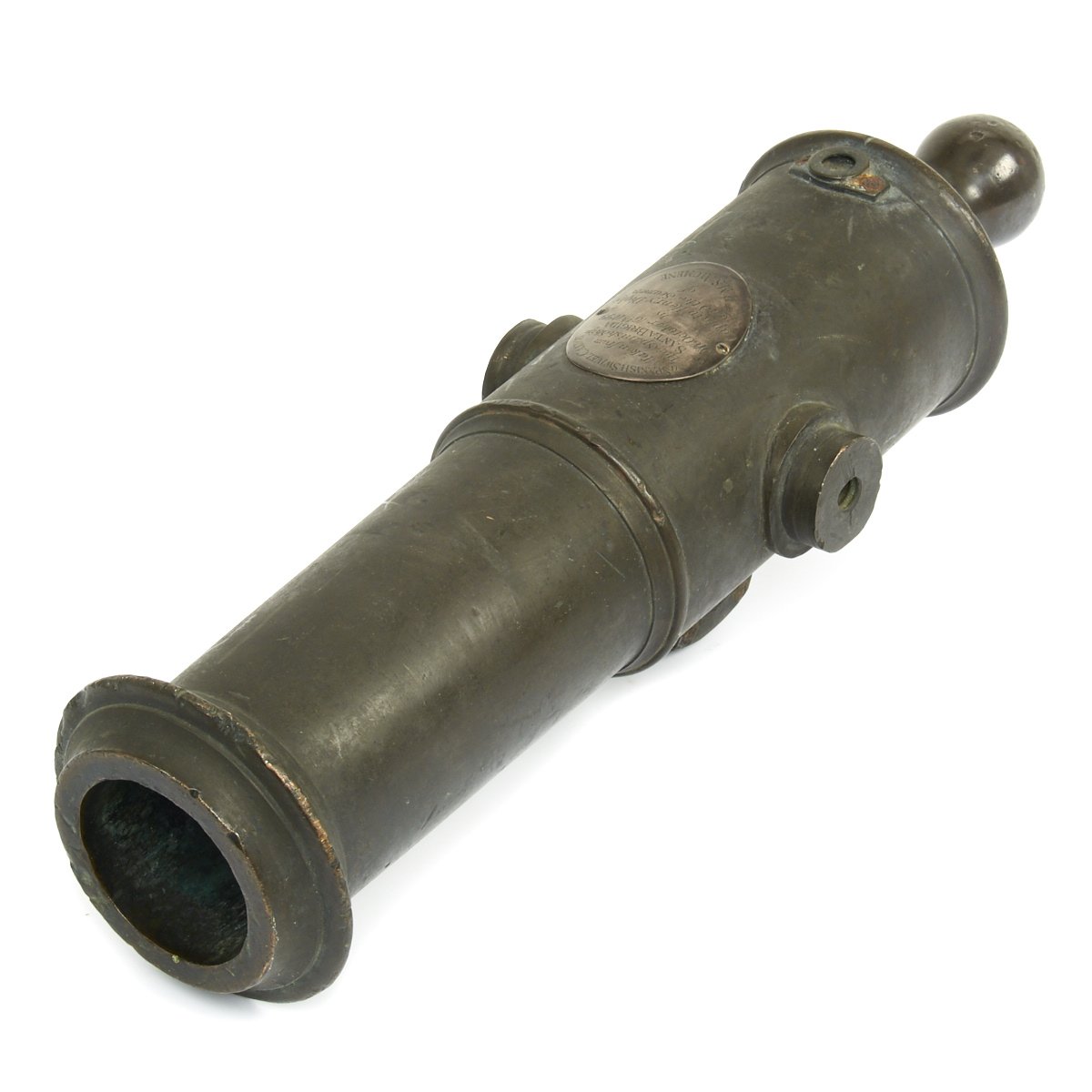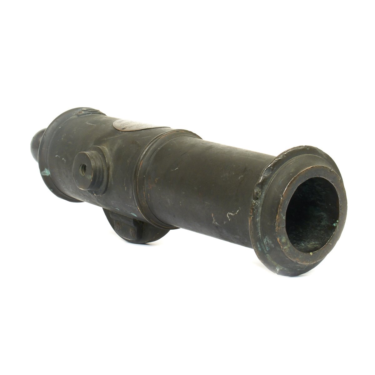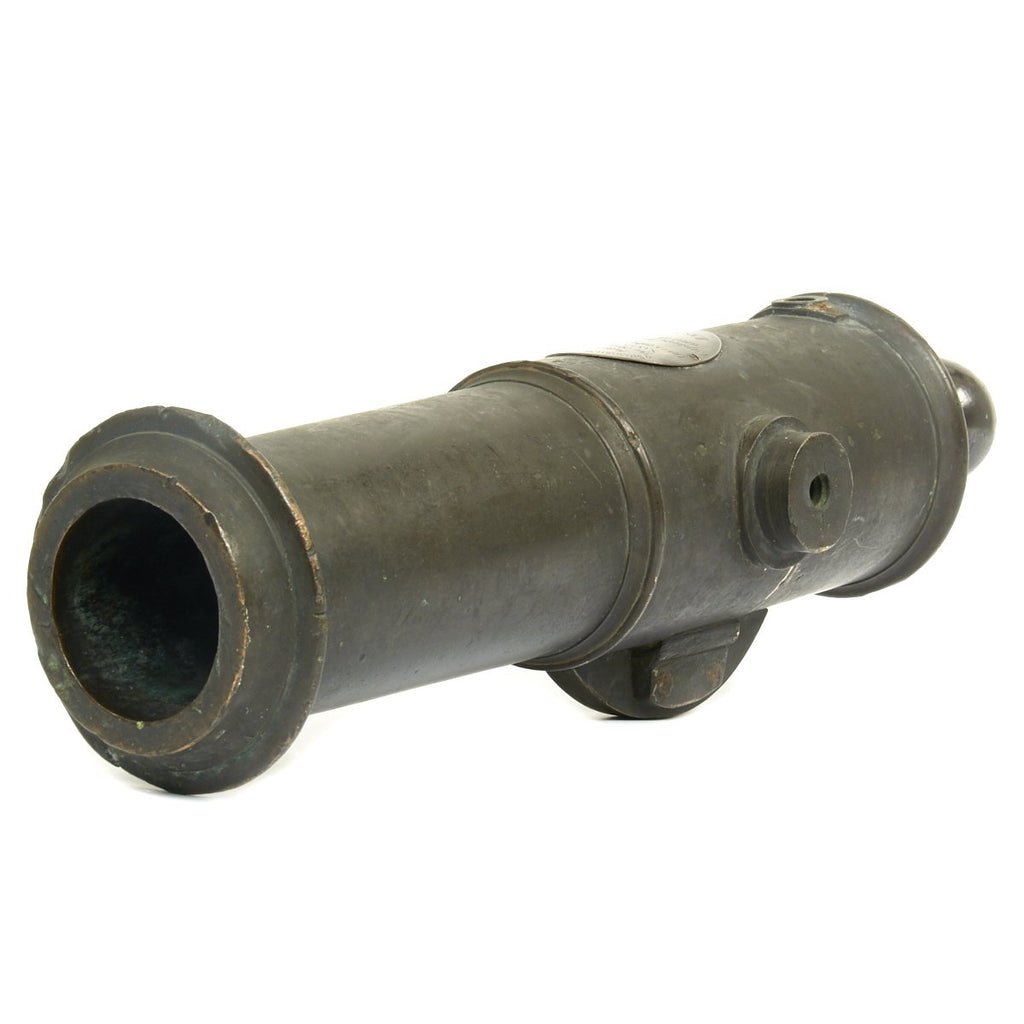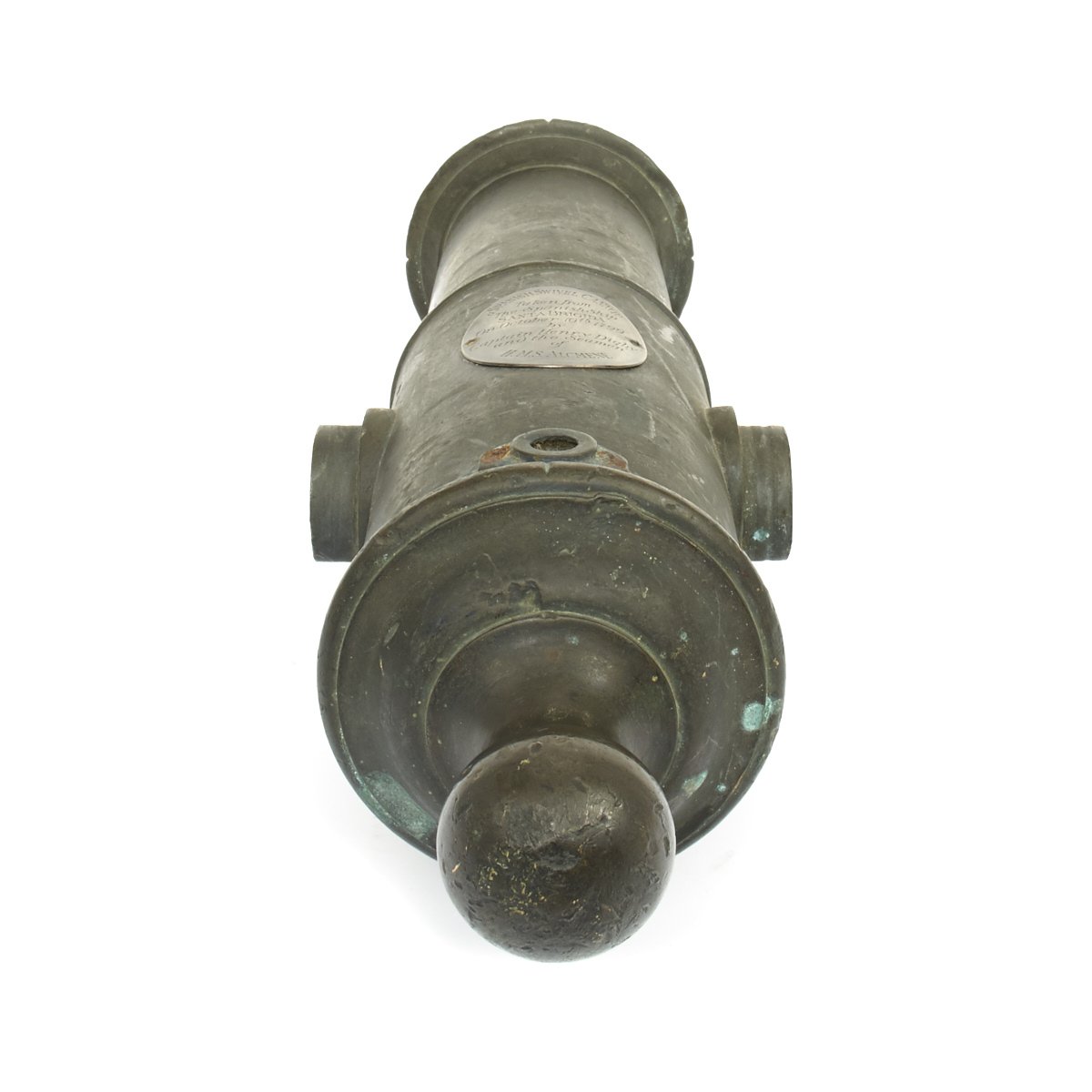 Across the top of the rear end of the barrel there is an old SILVER Plaque 3" X 2 1/4" stating:-