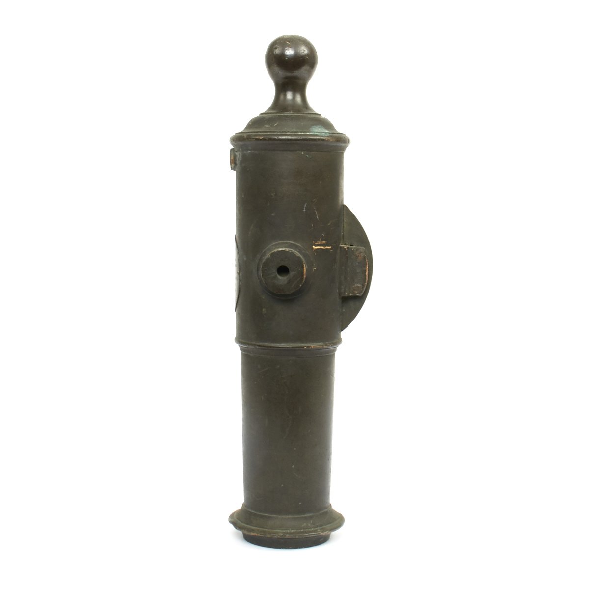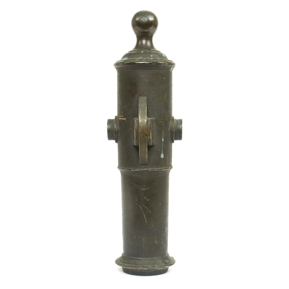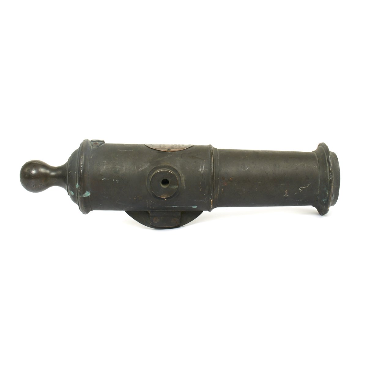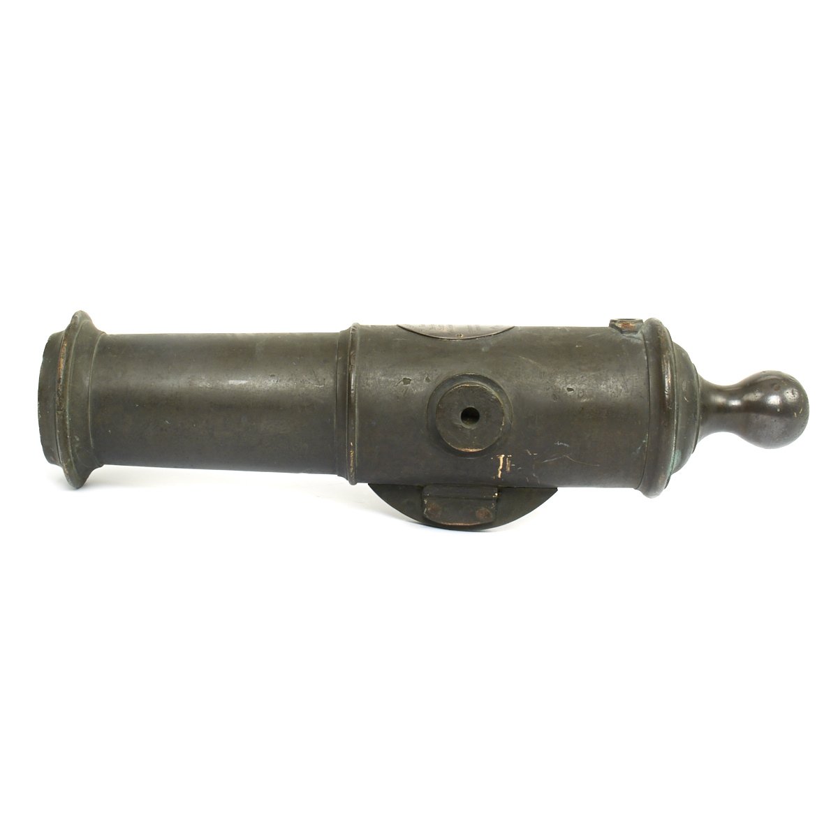 The Swivel Cannon is truly beautifully made, just 19 1/2" in total length and just 6" wide at it's widest point, the trunions. The bore is a huge 2 1/2" translating this to be a TWO Pounder, also known as a "FALCON". The bore is cylindrical, and the back of the chamber is round. There is also a small pan bolted around the touch hole to hold additional powder.