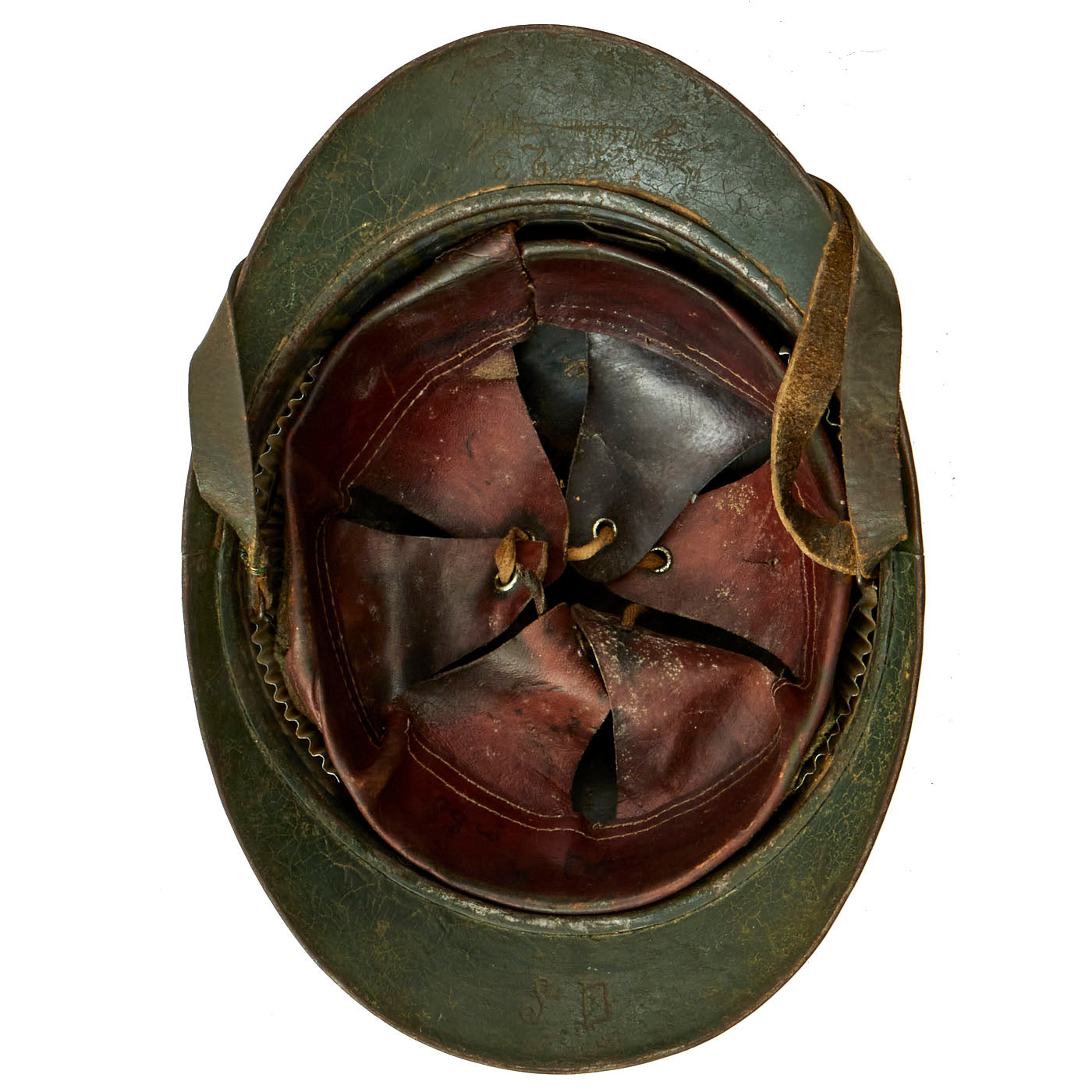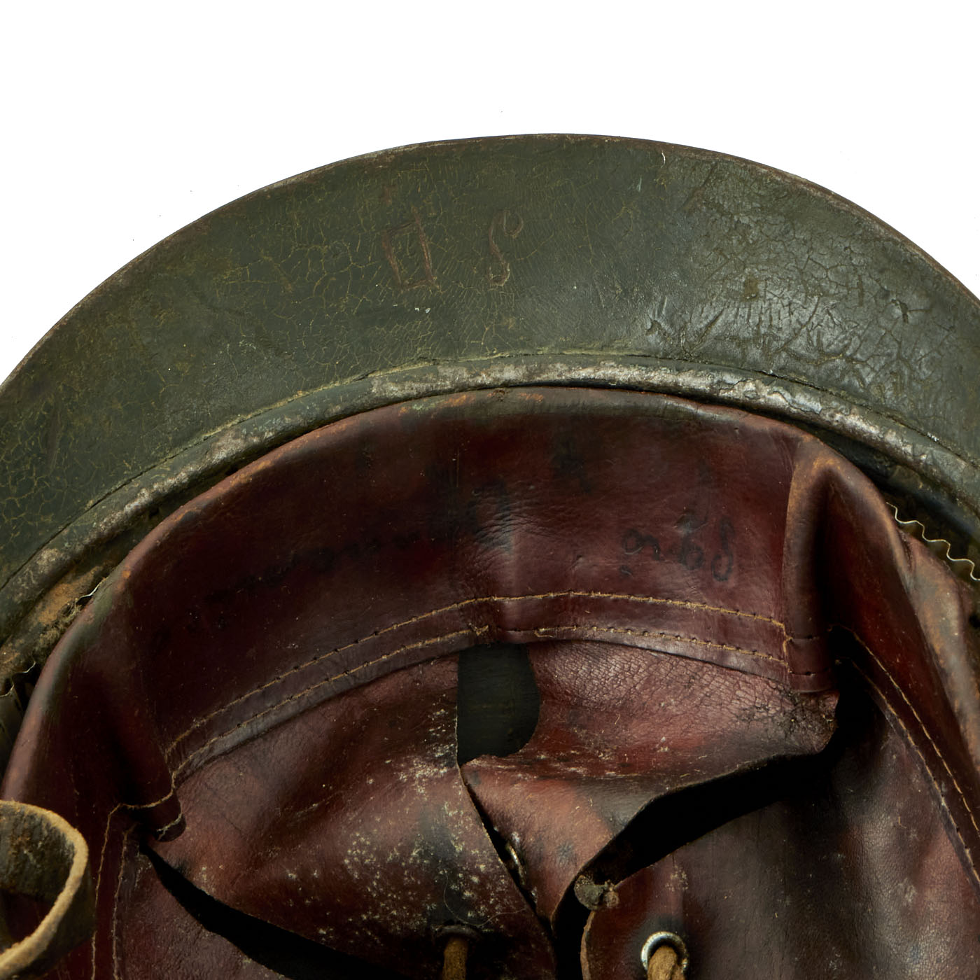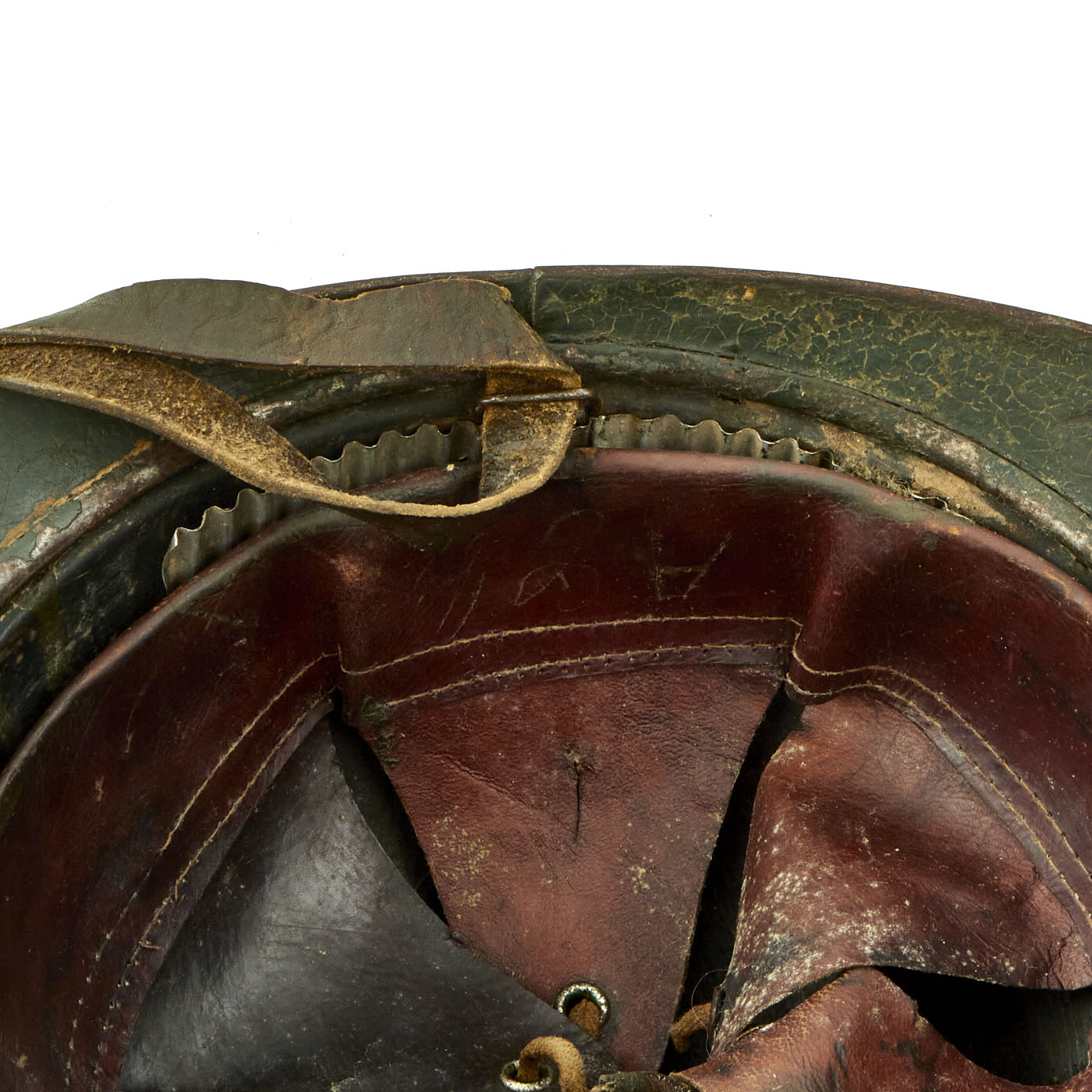 The front of this example has a rare original Spanish Civil War yugo y flechas (bow and arrow) insignia of the Spanish Nationalist group the "Black Arrows". Helmet features its original paint and leather chinstrap with a lovely worn liner.