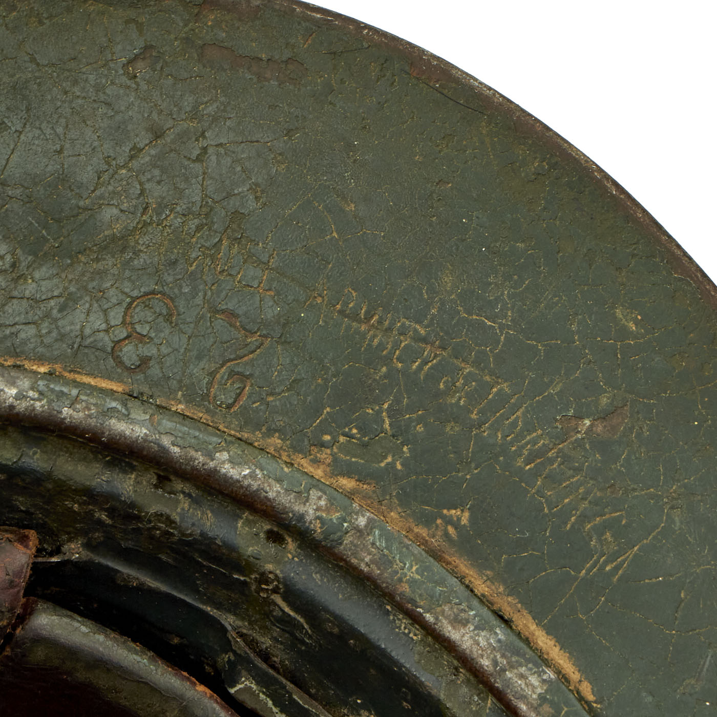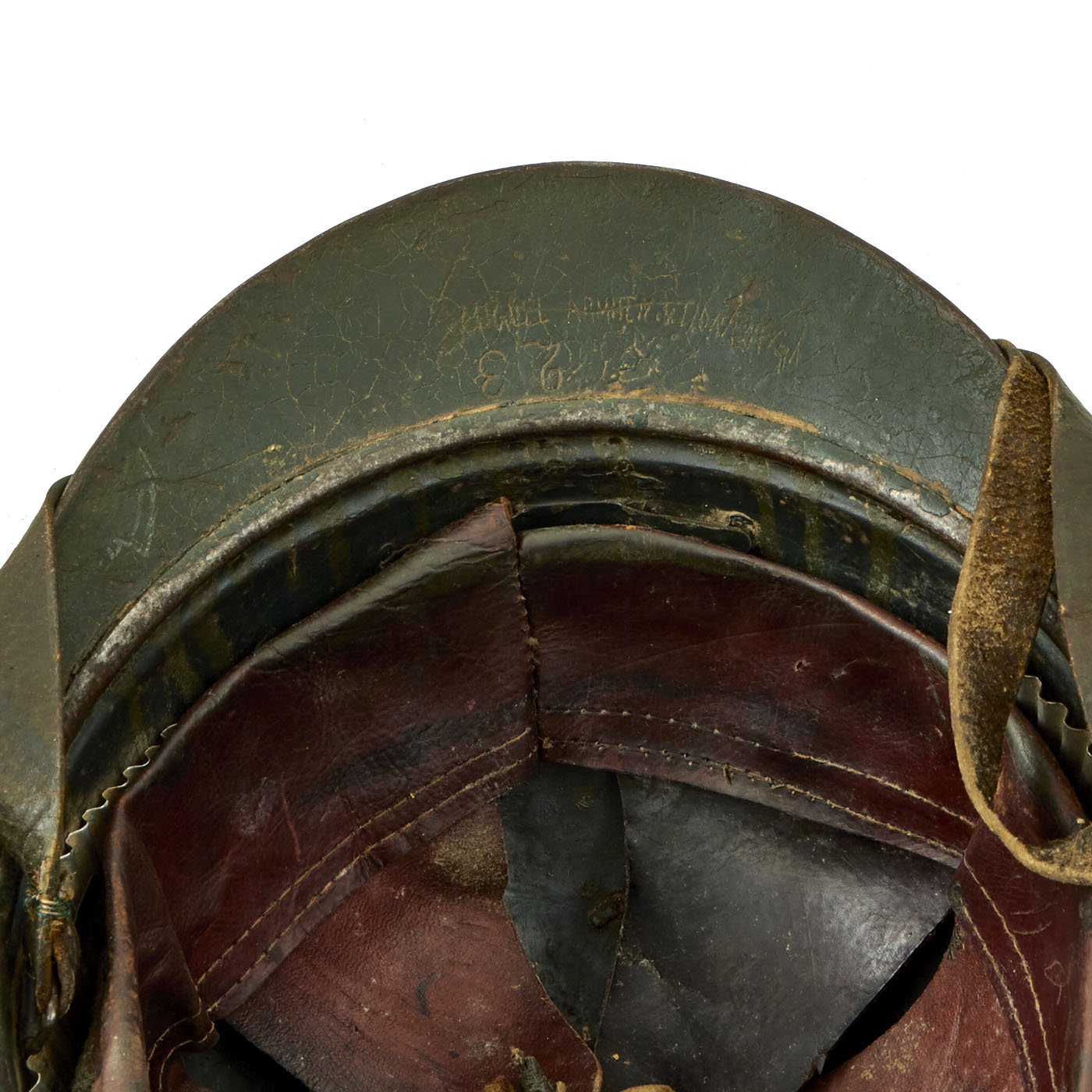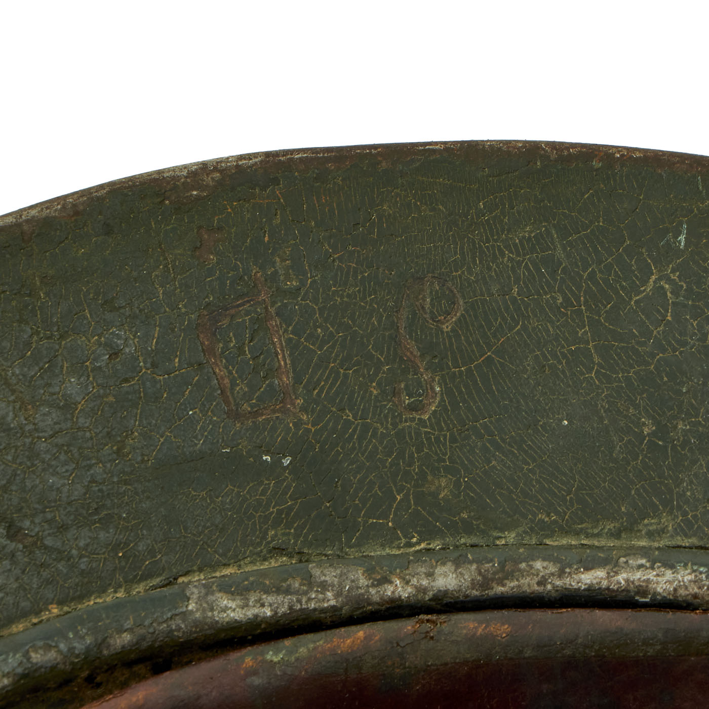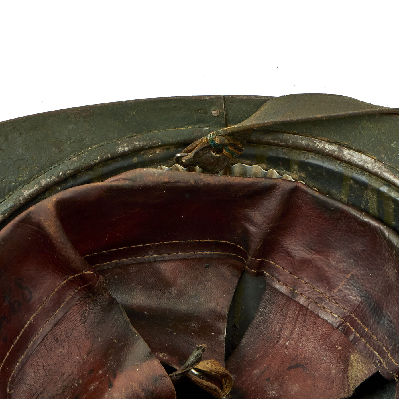 The front of this example has a rare original Spanish Civil War yugo y flechas (bow and arrow) insignia of the Spanish Nationalist group the "Black Arrows". Helmet features its original paint and leather chinstrap with a lovely worn liner.