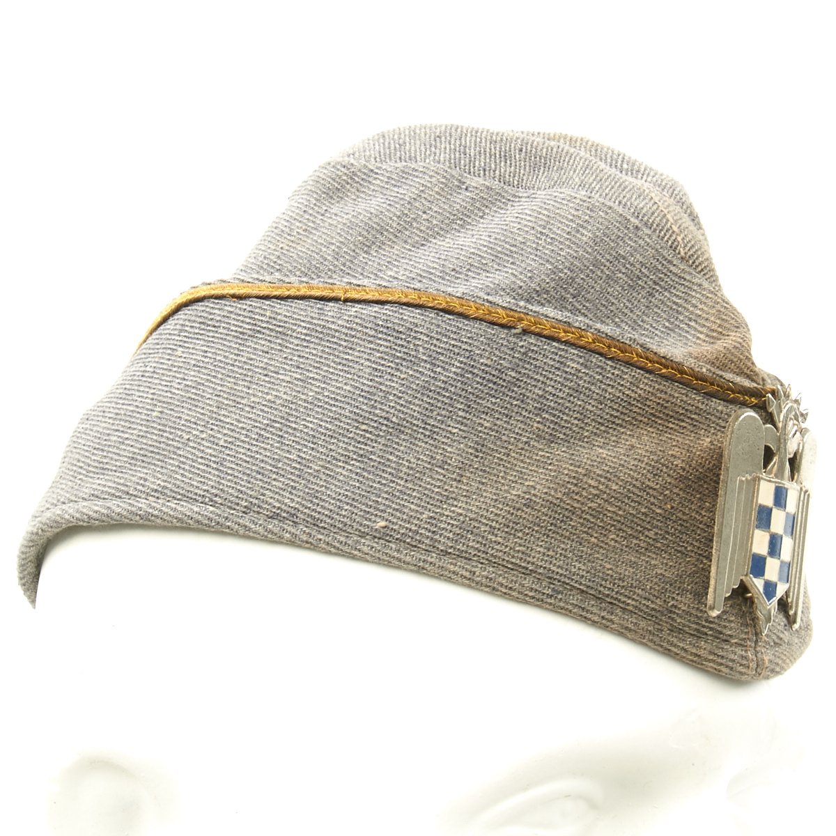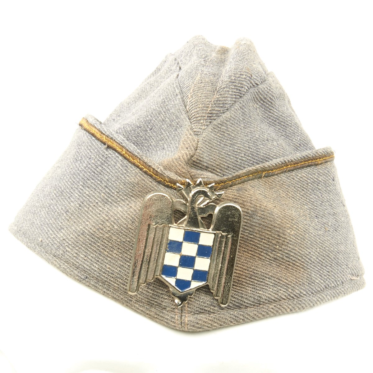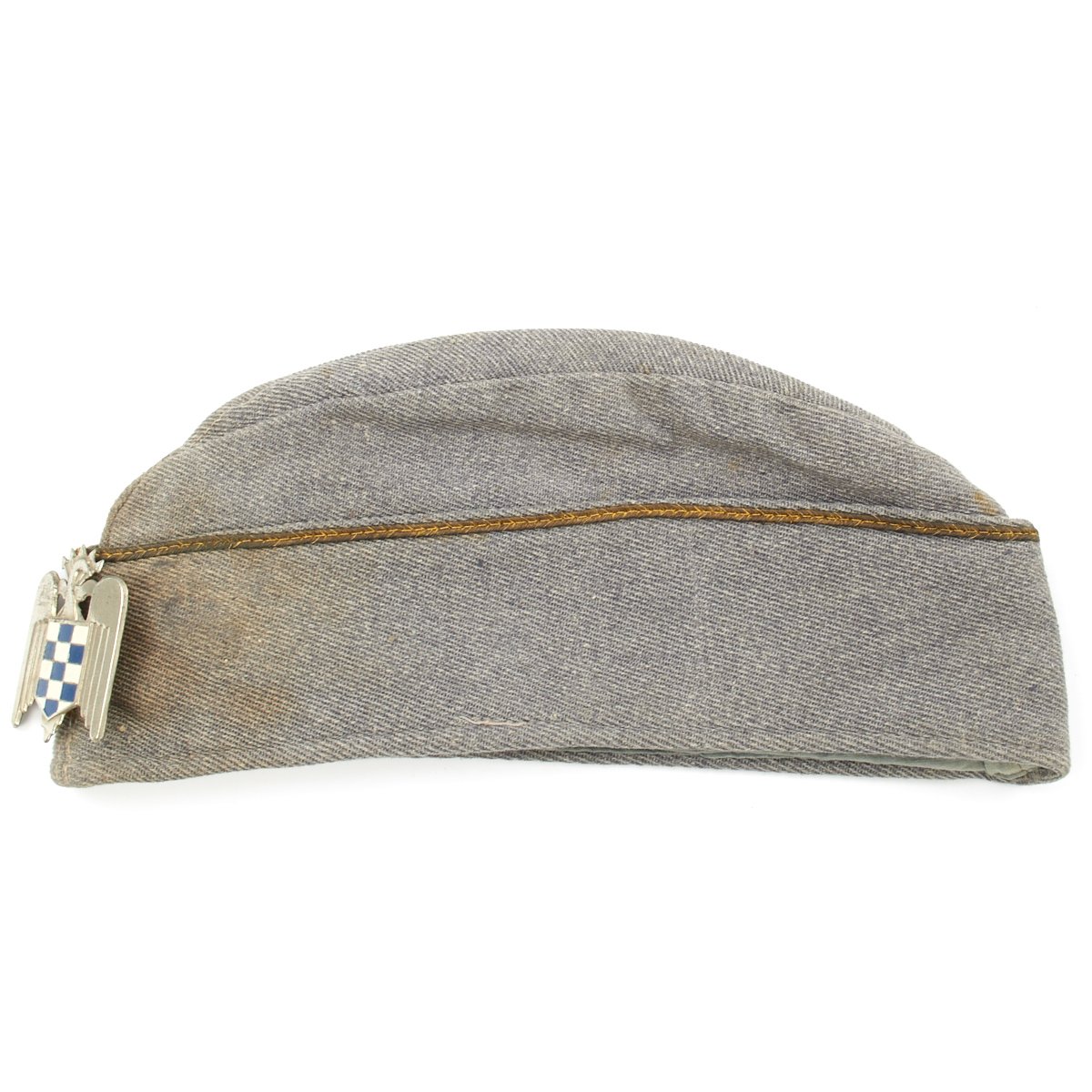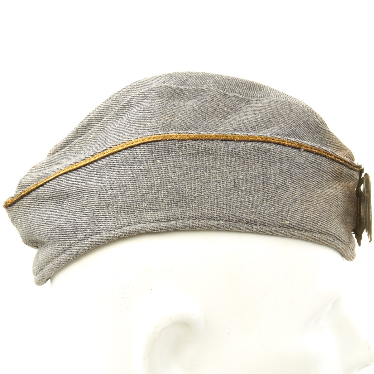 Original Item: Only One Available. This side cap was originally introduced in early 1930s and was worn by Nationalist Student Volunteers with minor variations. This blue cotton field cap features gold piping and Spanish Franquist Students League of the Falange Army Badge. The interior is fully lined in a light blue cotton.