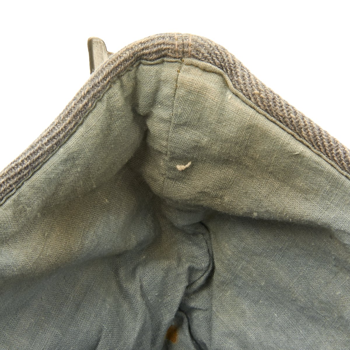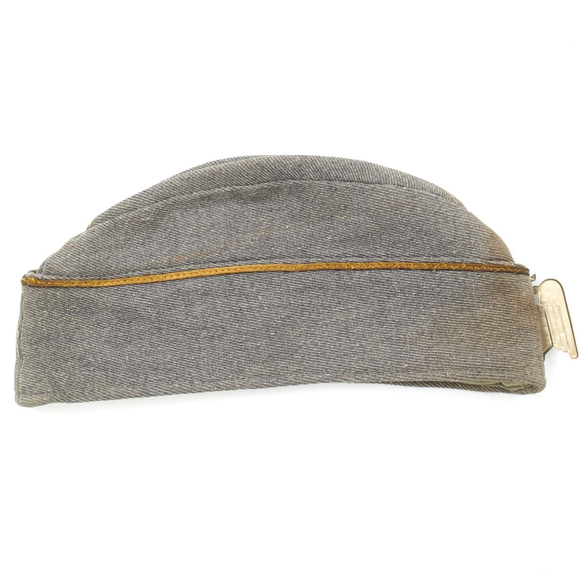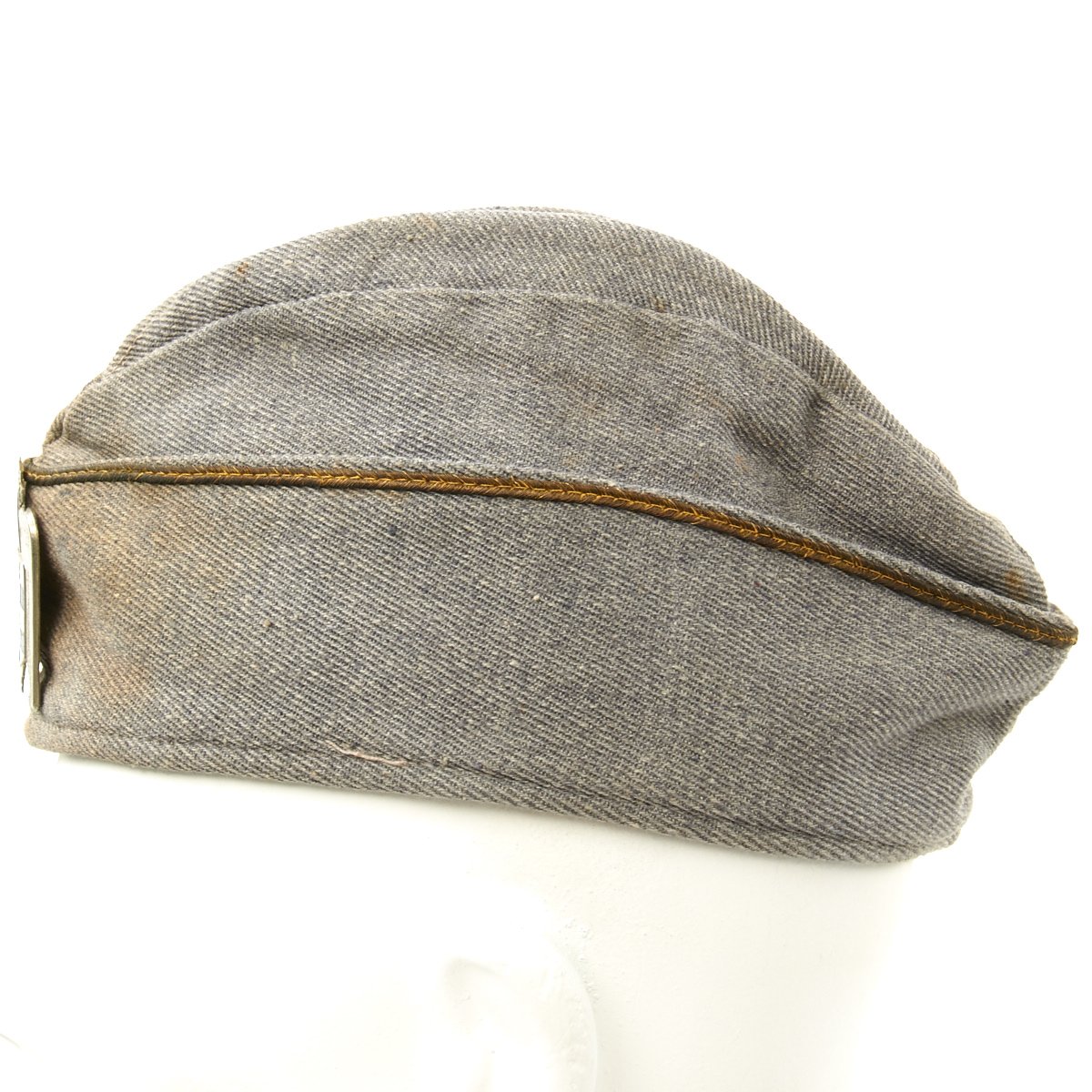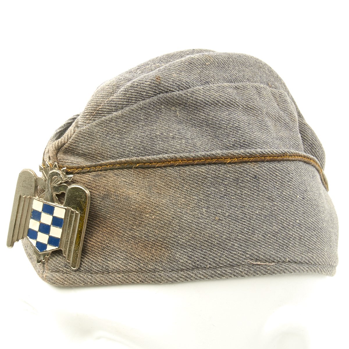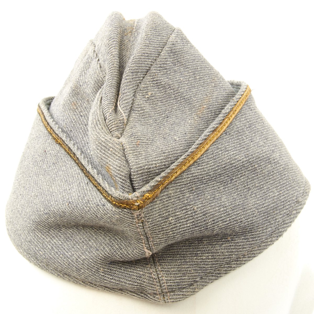 Original Item: Only One Available. This side cap was originally introduced in early 1930s and was worn by Nationalist Student Volunteers with minor variations. This blue cotton field cap features gold piping and Spanish Franquist Students League of the Falange Army Badge. The interior is fully lined in a light blue cotton.