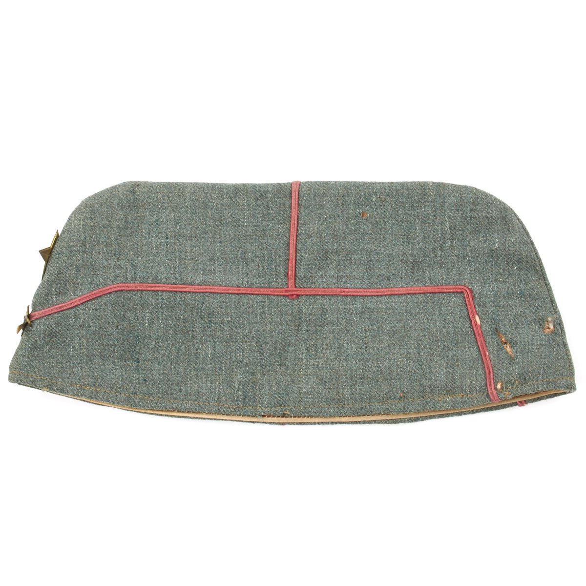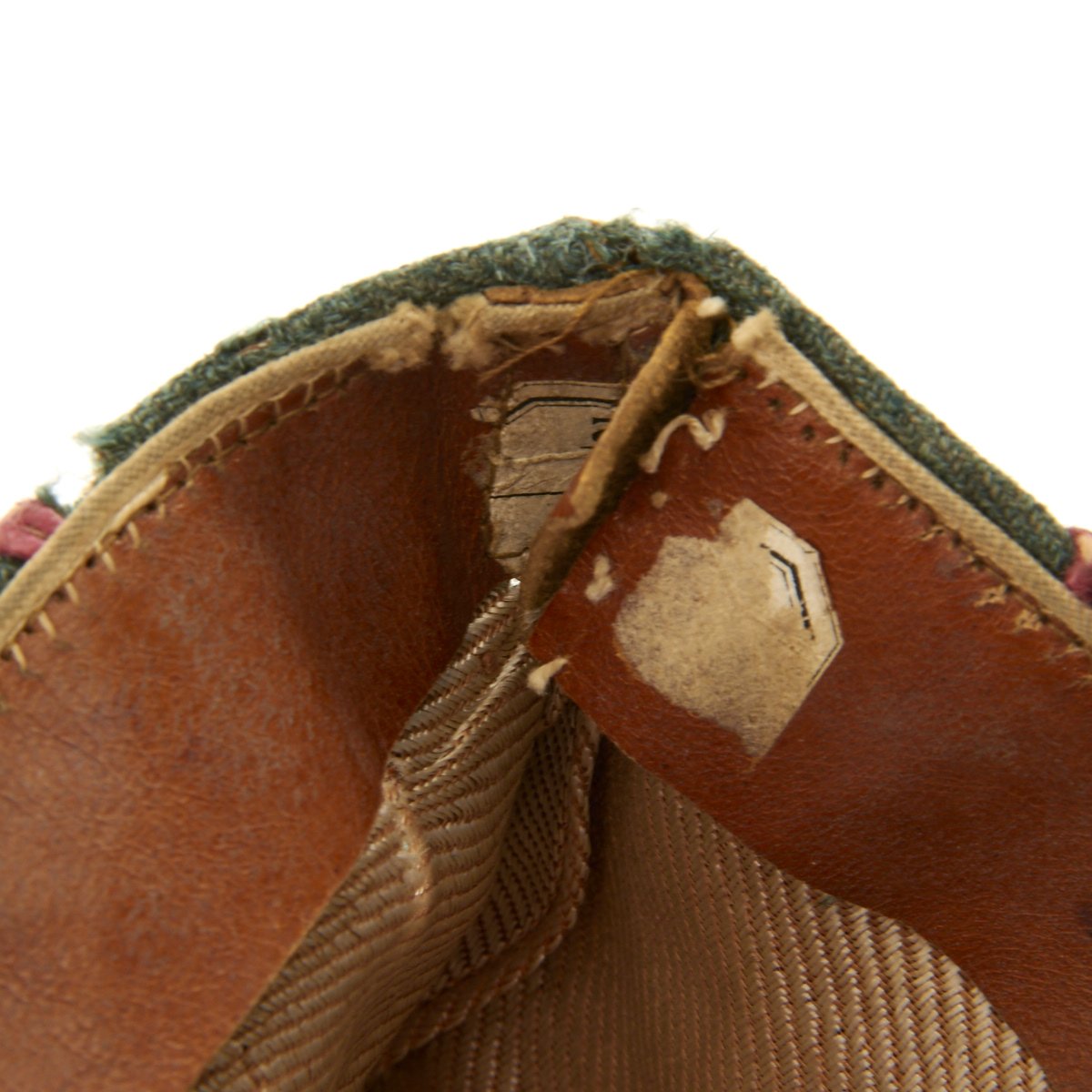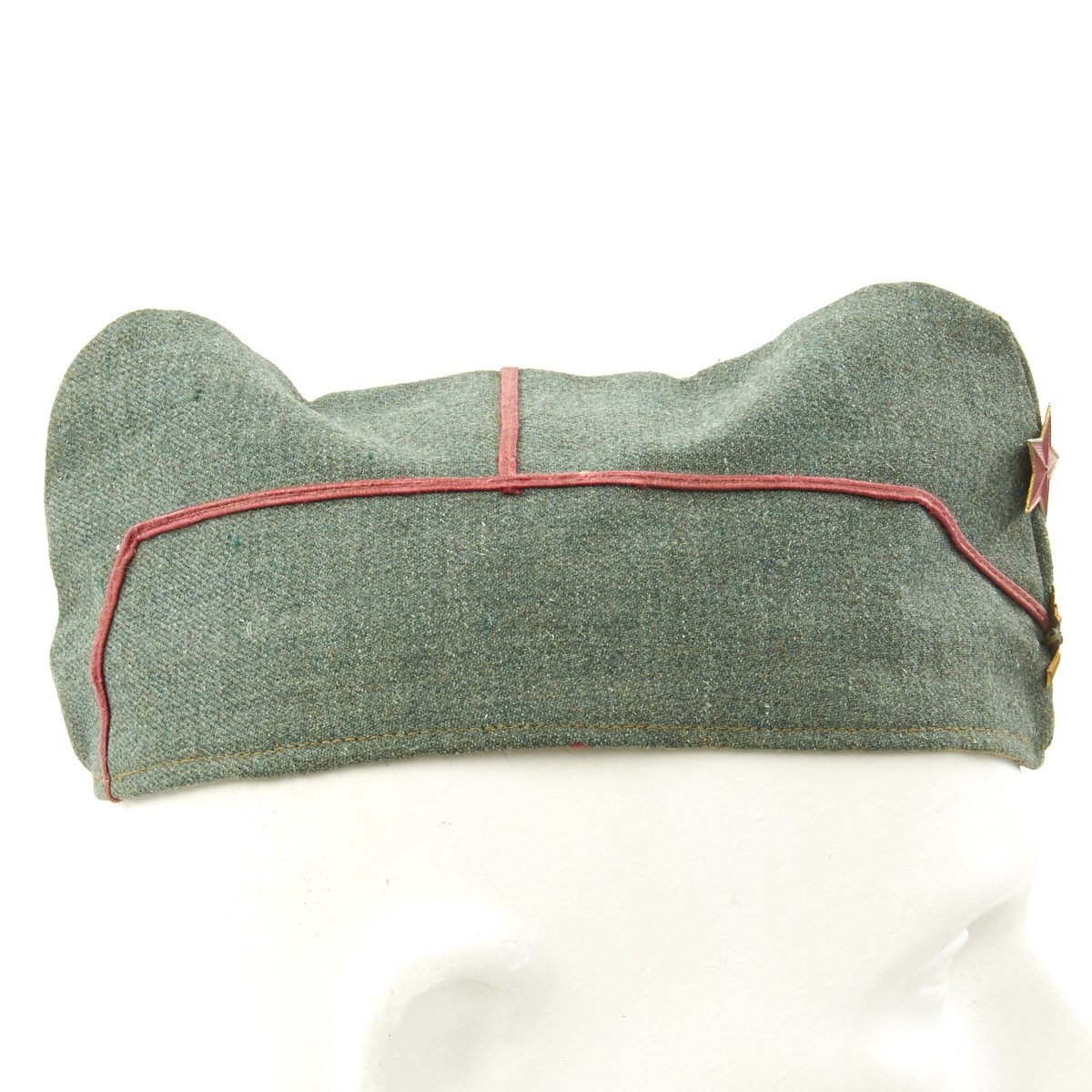 Original Item: Only One Available. This side cap was originally introduced in early 1930s and was worn by Republican (communist) personnel, with minor variations. This green wool field cap features a gold button showing the crossed rifles pin insignia above which is a red communist star pin. There is very nice red/pink trim piping on either side. The interior is fully lined in a light satin with a brown leather sweatband, portion of original maker label is still present.