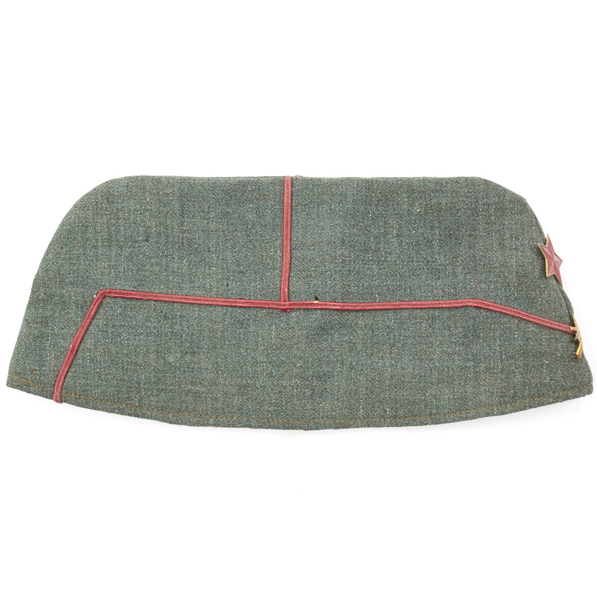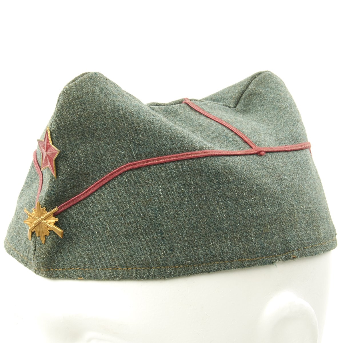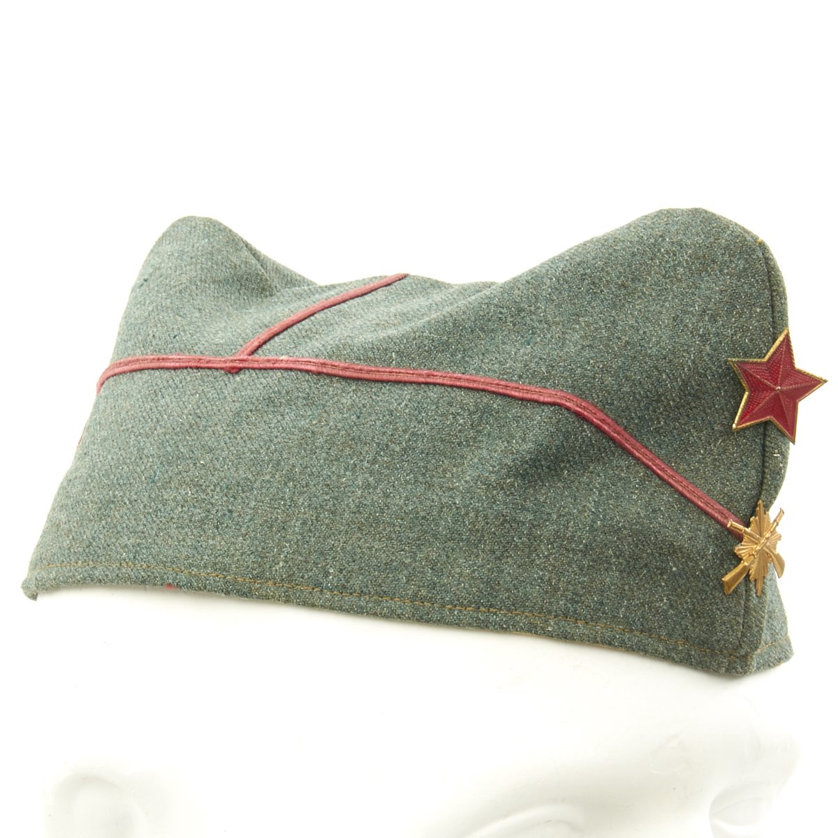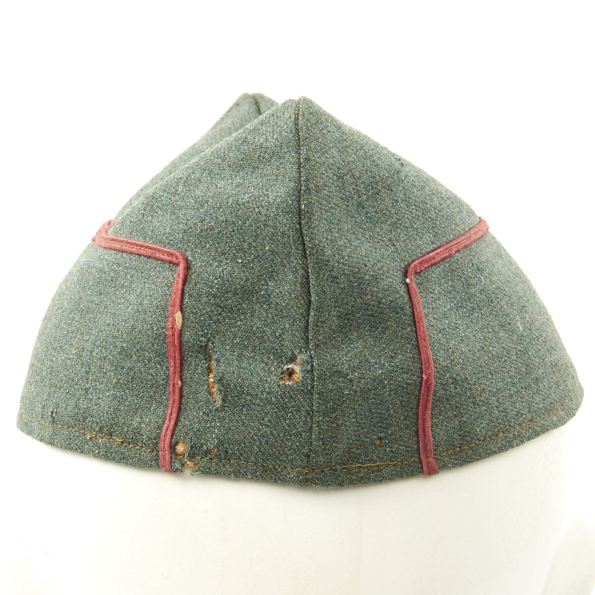 Original Item: Only One Available. This side cap was originally introduced in early 1930s and was worn by Republican (communist) personnel, with minor variations. This green wool field cap features a gold button showing the crossed rifles pin insignia above which is a red communist star pin. There is very nice red/pink trim piping on either side. The interior is fully lined in a light satin with a brown leather sweatband, portion of original maker label is still present.