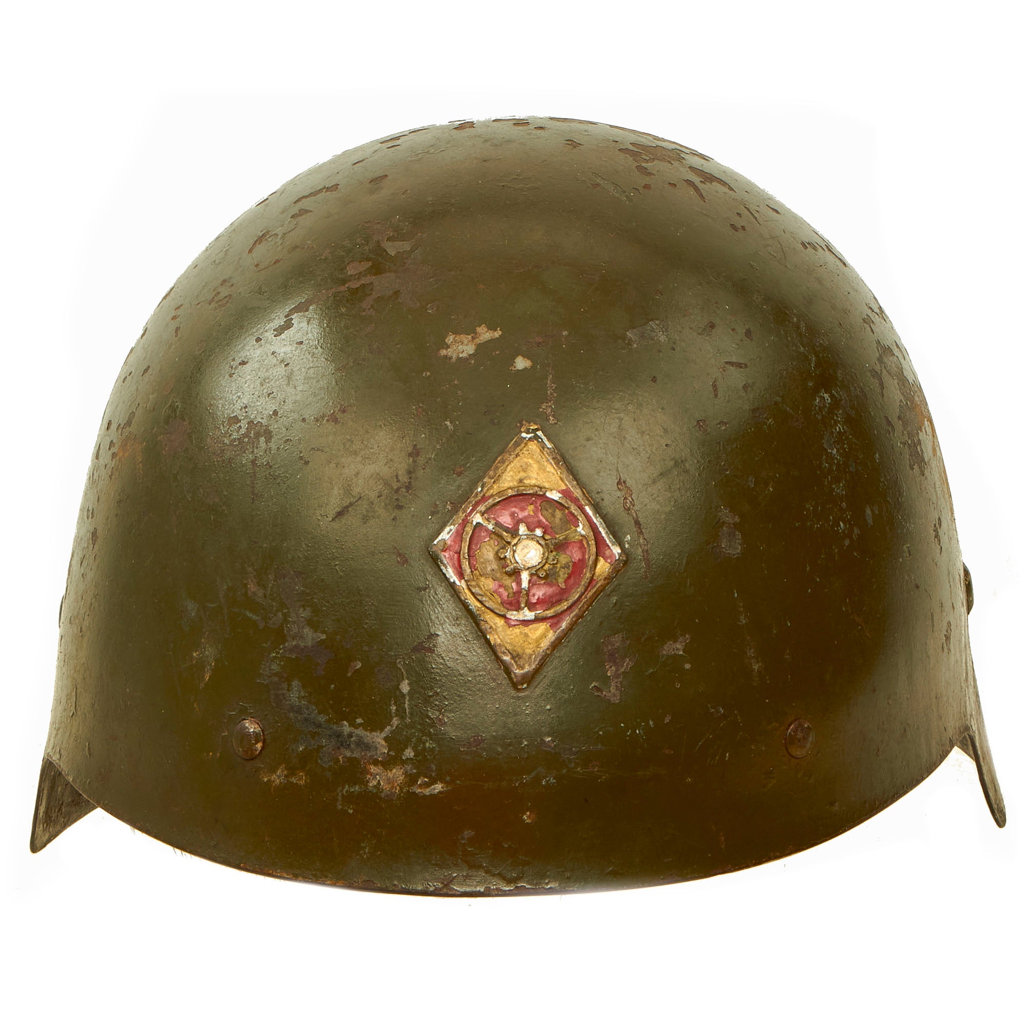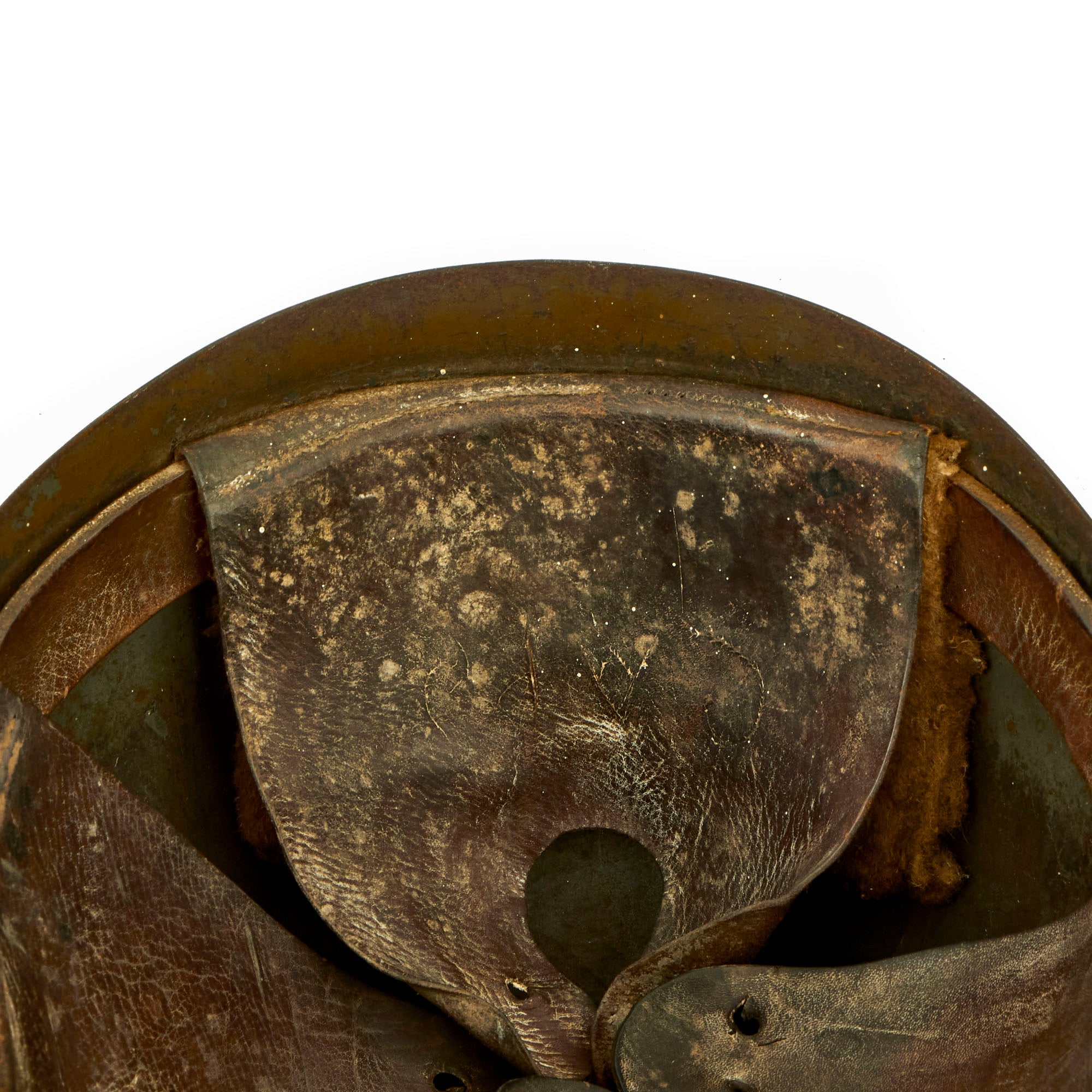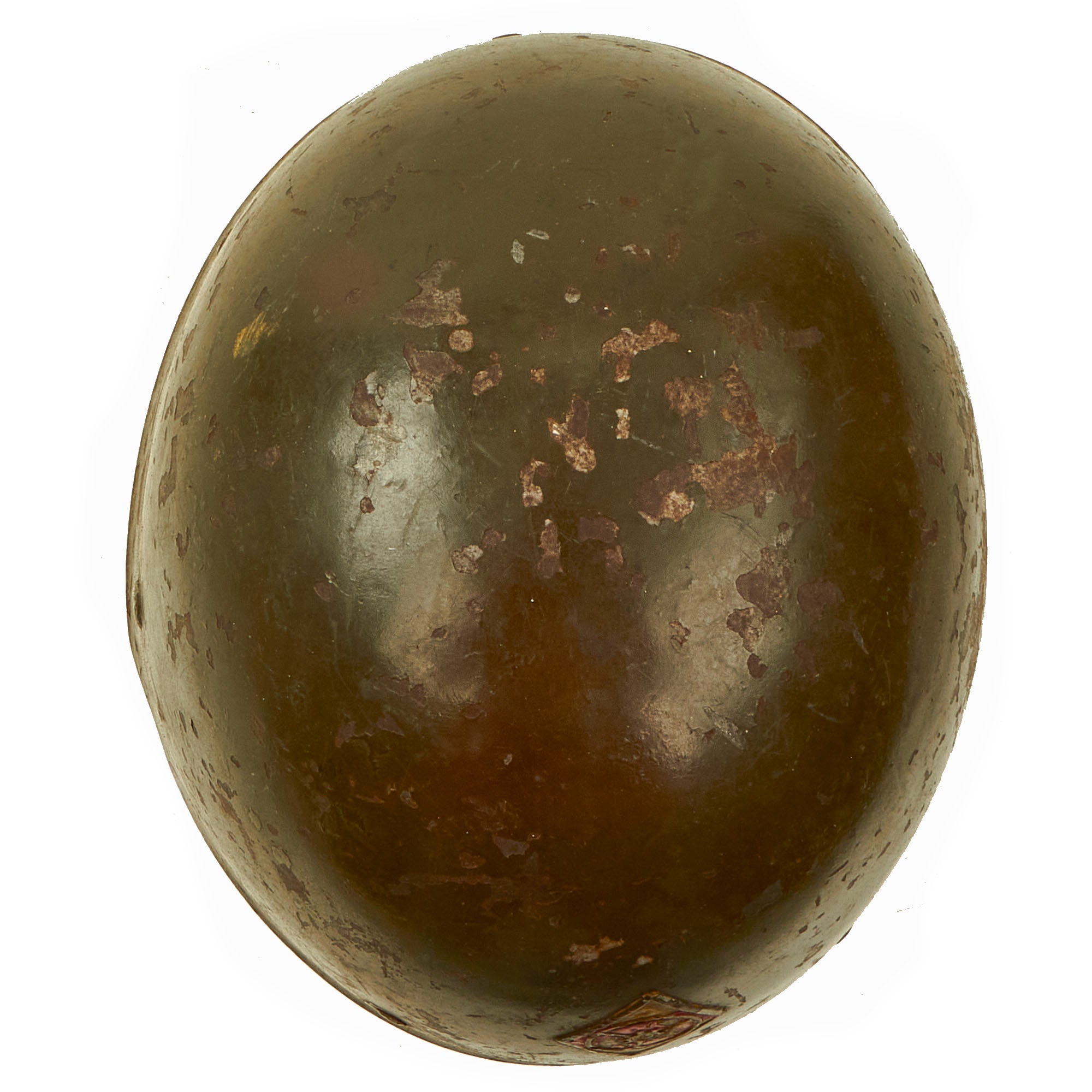 The helmet is in wonderful condition and still retains much of its original green repaint which was done some time in 1943. The WWI German style 3 panel leather liner and leather band are still quite solid and complete, but does not have a top tie/string for adjustment purposes. Both chinstrap bales are present but without the actual chinstrap. The helmet has a lovely badge on the front and is one we have not seen before. We believe the badge to be a type of specialty rating or something of similar nature.