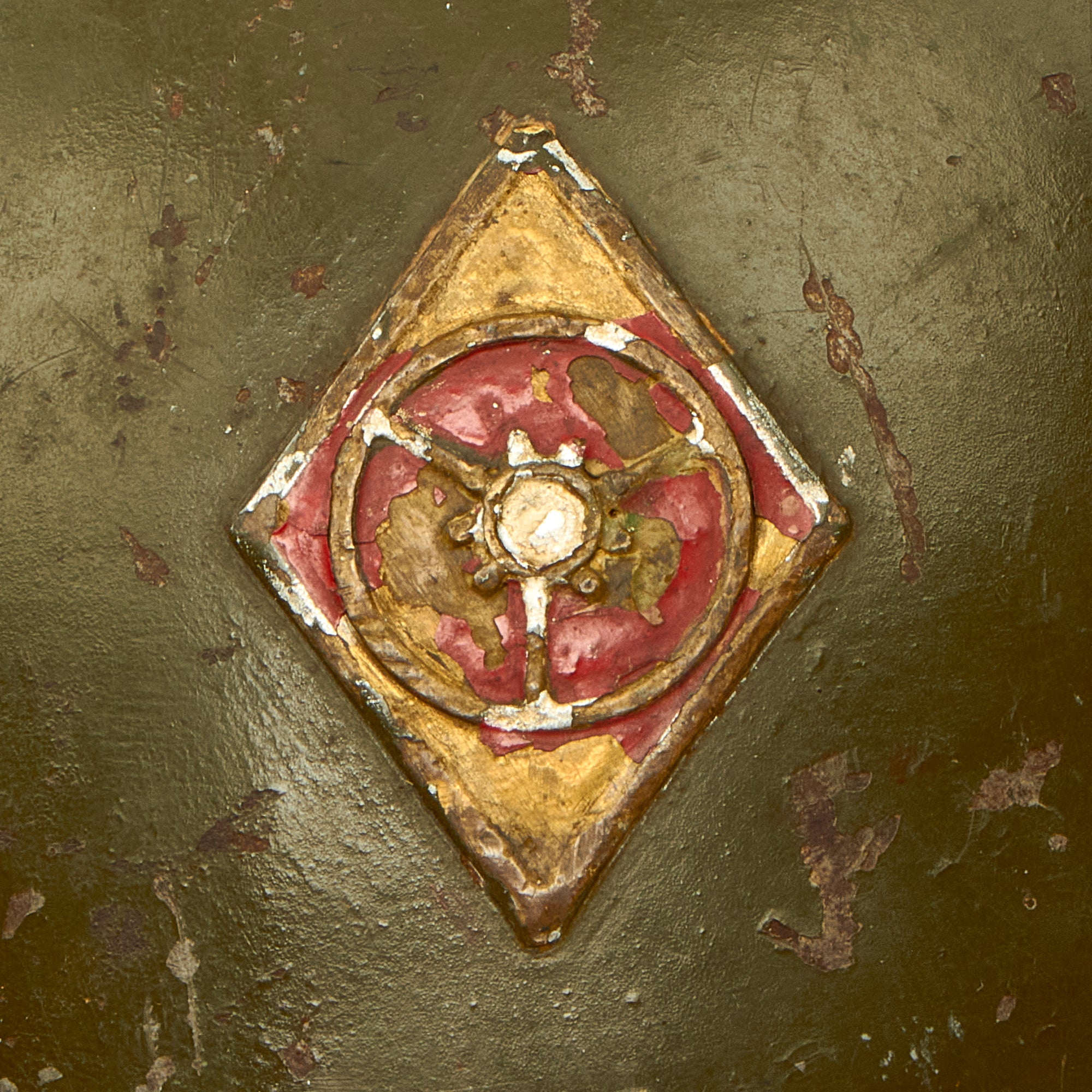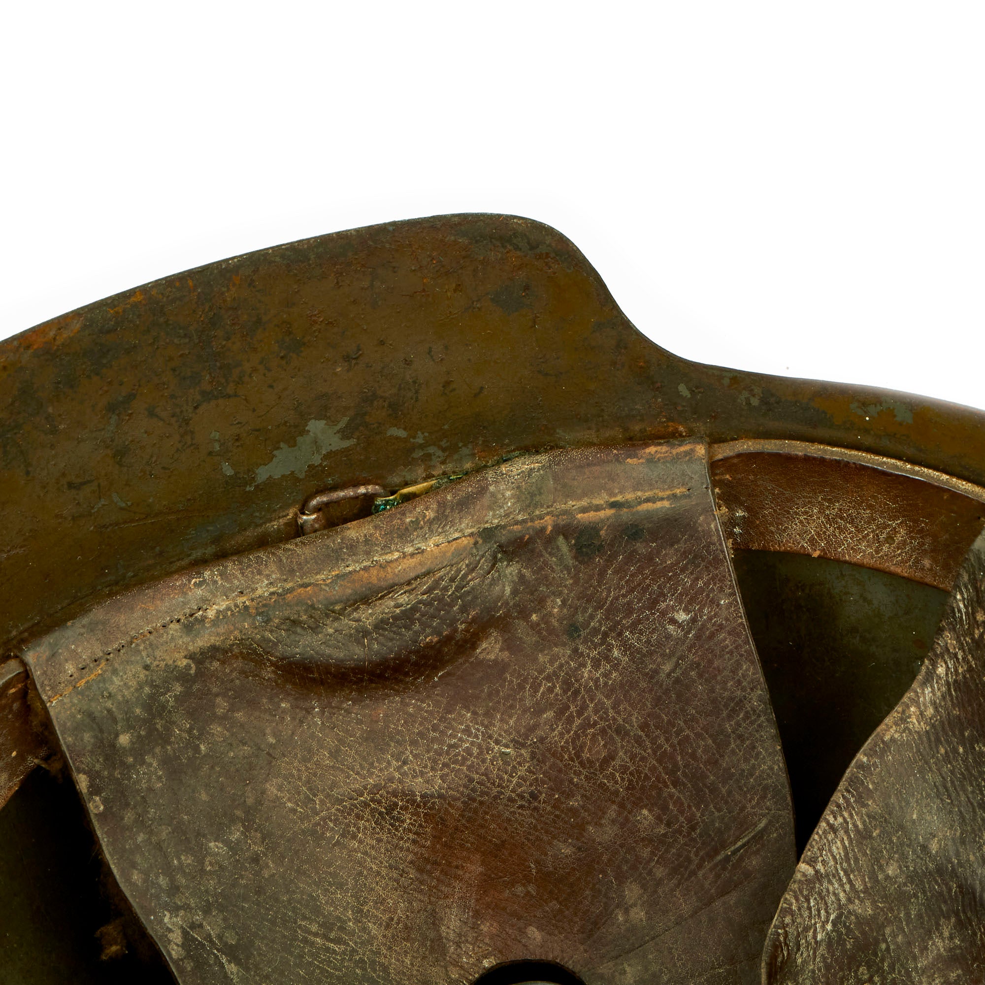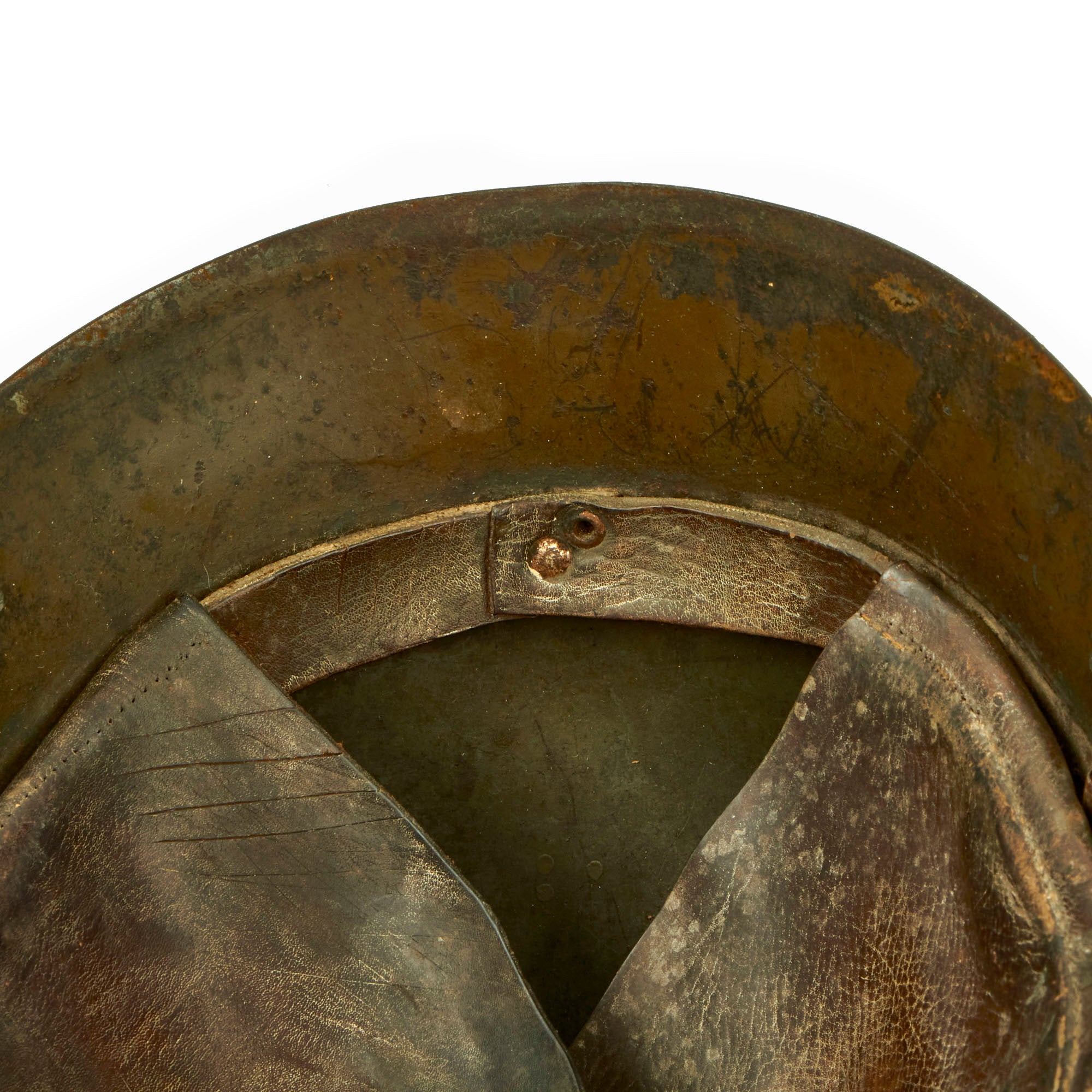 The helmet is in wonderful condition and still retains much of its original green repaint which was done some time in 1943. The WWI German style 3 panel leather liner and leather band are still quite solid and complete, but does not have a top tie/string for adjustment purposes. Both chinstrap bales are present but without the actual chinstrap. The helmet has a lovely badge on the front and is one we have not seen before. We believe the badge to be a type of specialty rating or something of similar nature.