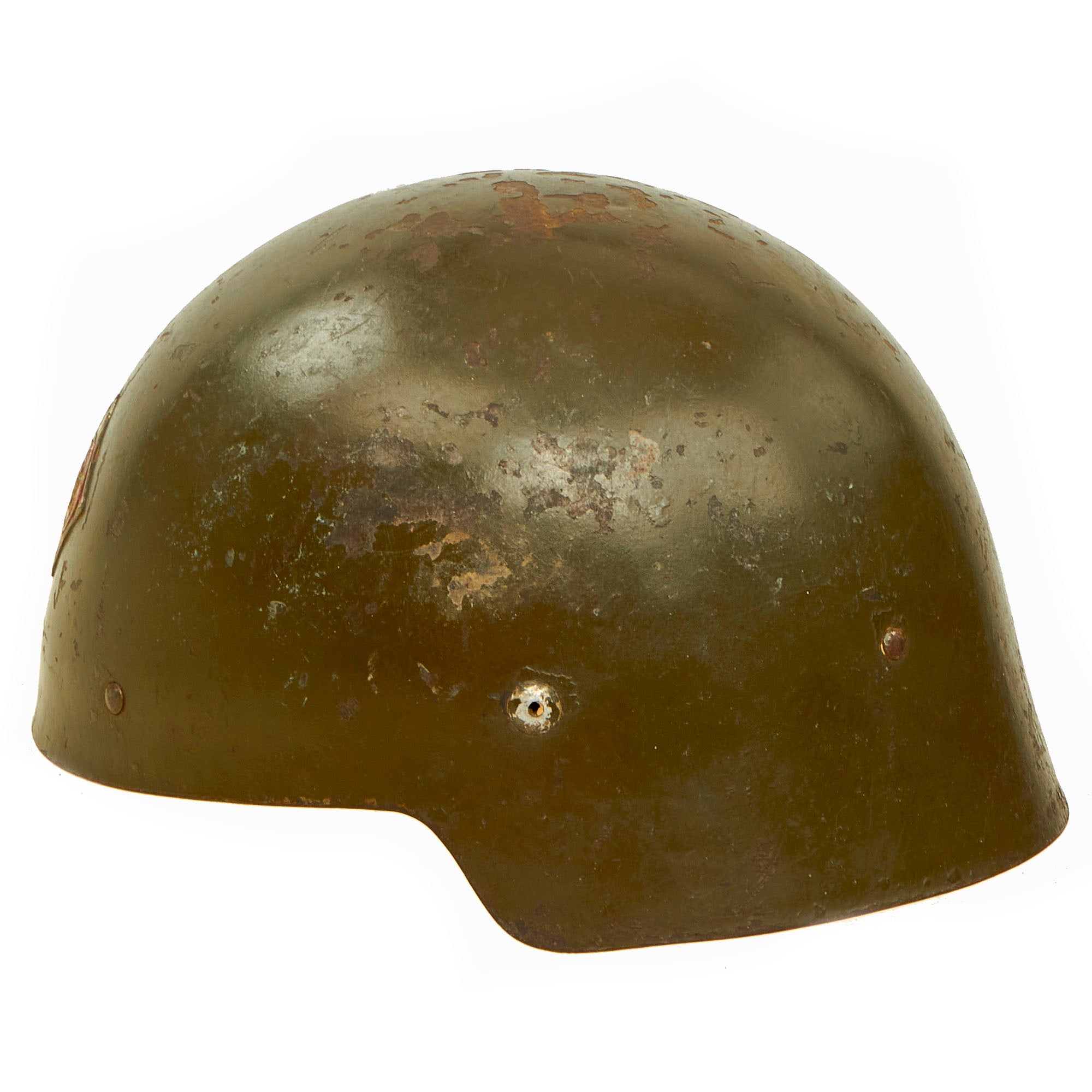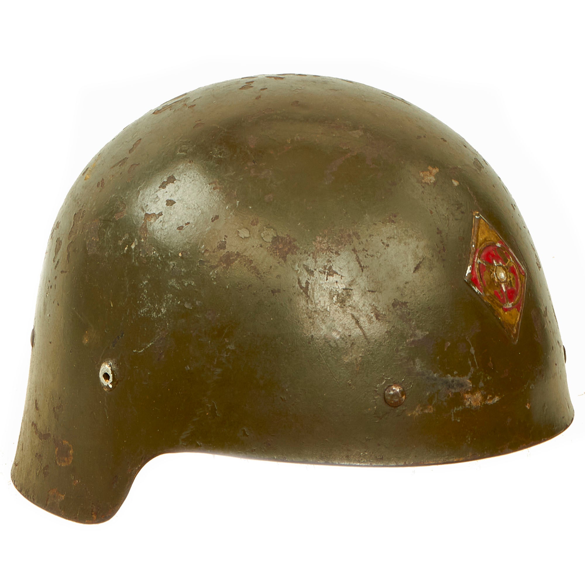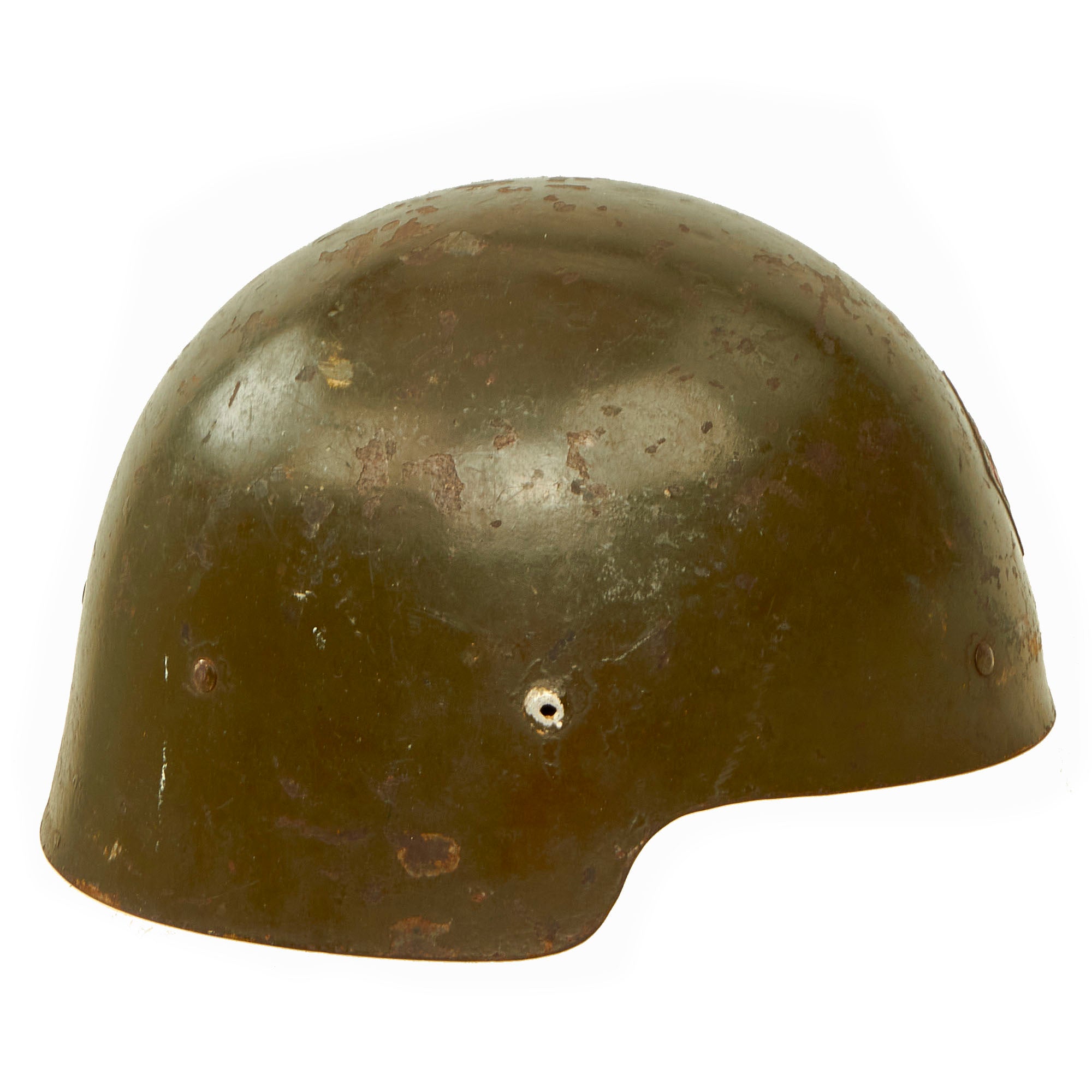 Original Item: Only One Available. This is a fantastic example of a Spanish Civil War era Modelo M1921 “Sin Ala” helmet with the 1943 “refurbishment” green repaint. This is a rather rare helmet due to the short life it had, and to find one with an original liner and badge is a wonderful encounter.