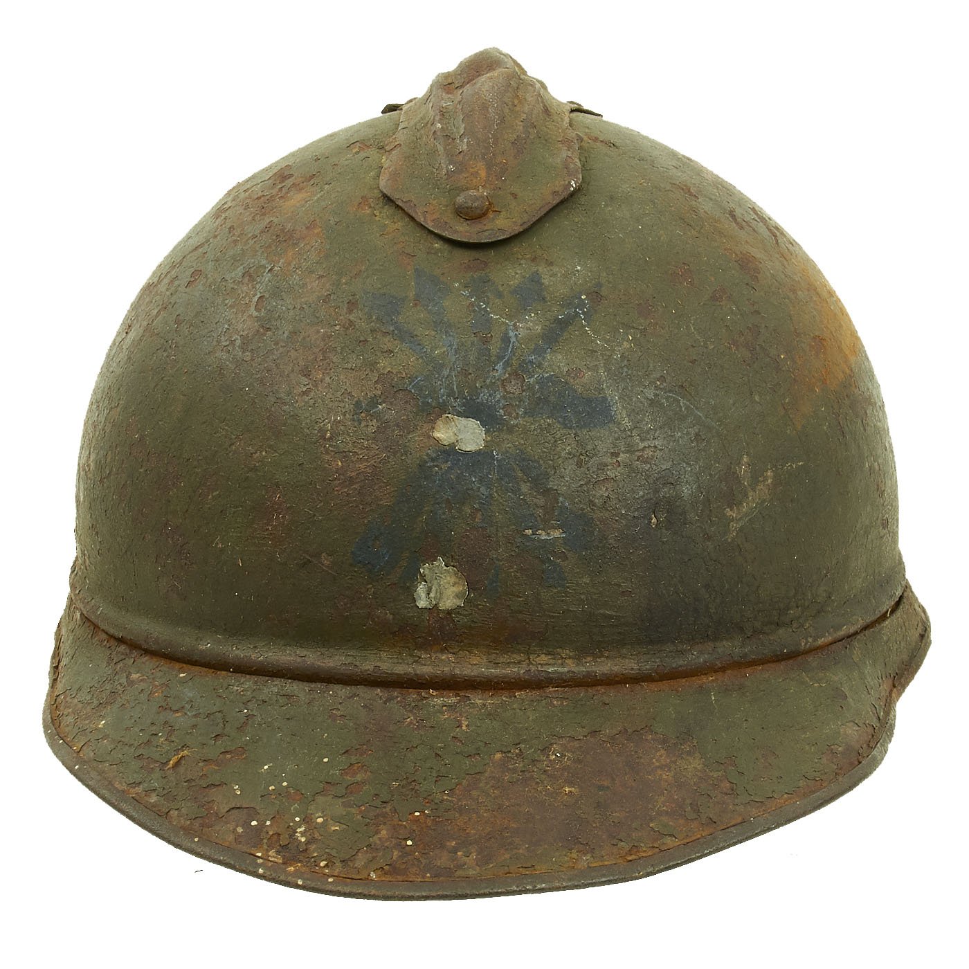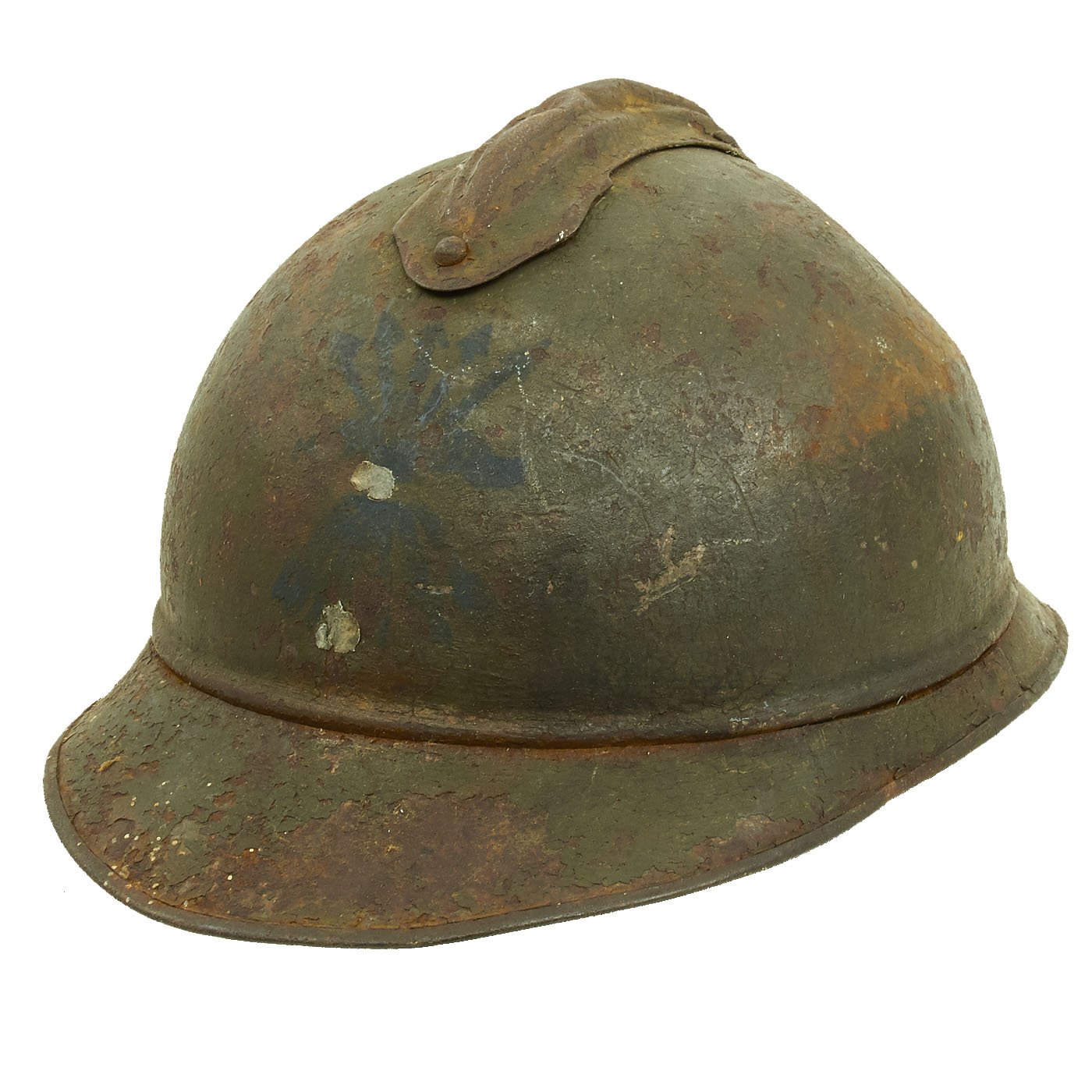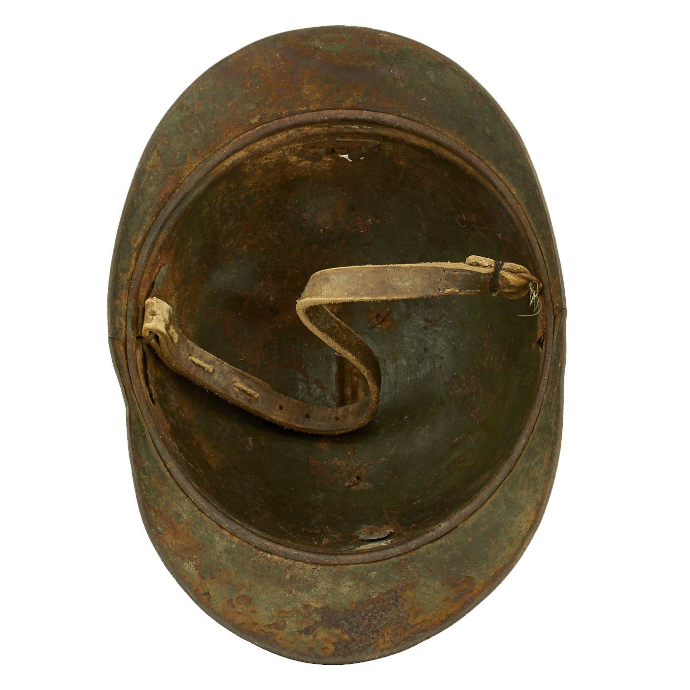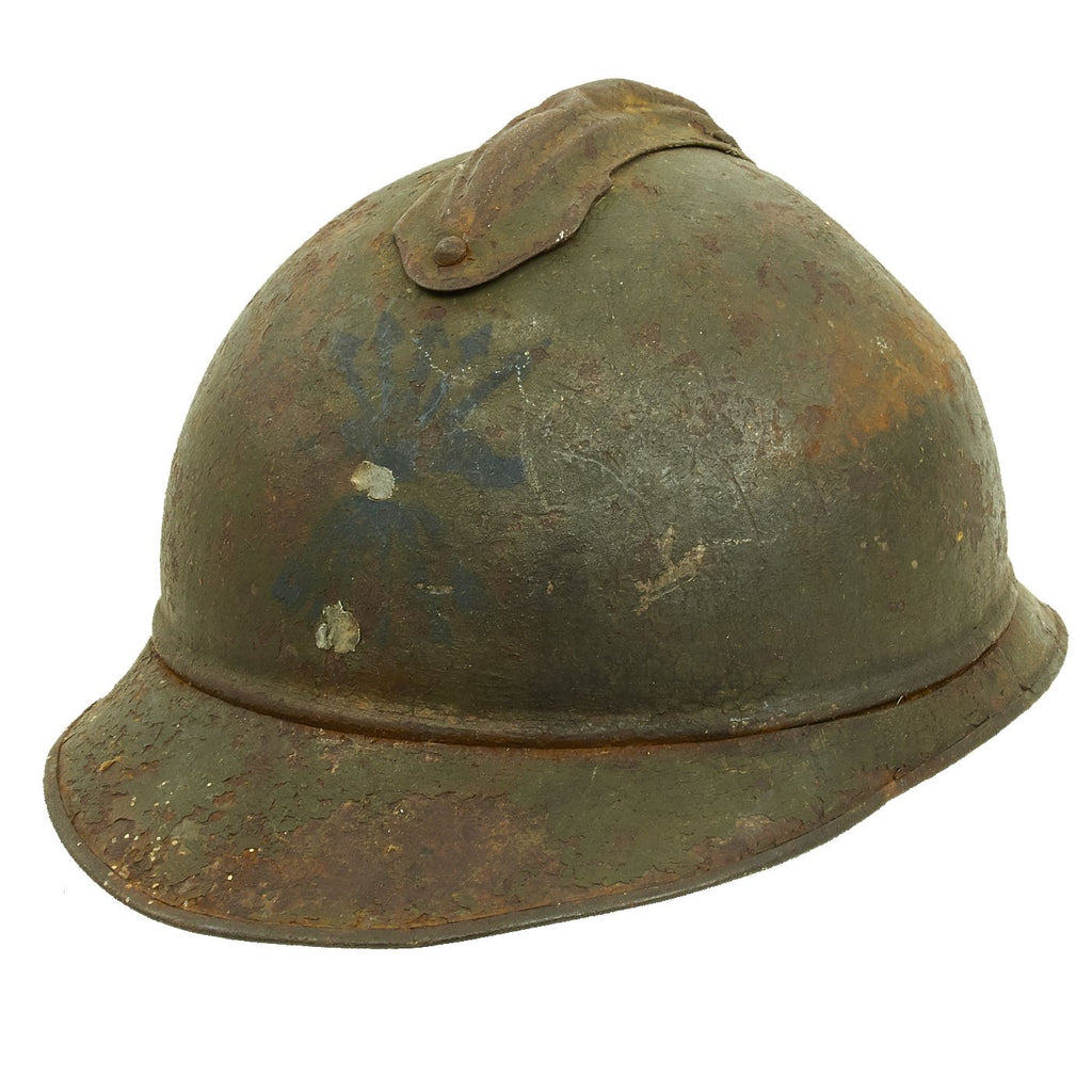 Original Item: Only One Available. The Italian World War One Model 1916 Adrian helmet also referred to as the "Lippmann Model" began to be produced in April 1916. It was a variation of the French M15 Adrian helmet. The Italian M16 is two-piece construction and features a welded on comb as opposed to riveted. The front of this example has an rare original Spanish Civil War yugo y flechas (bow and arrow) insignia of the Spanish Nationalist group the "Black Arrows". Helmet features its original paint and leather chinstrap but he liner and liner band are missing.