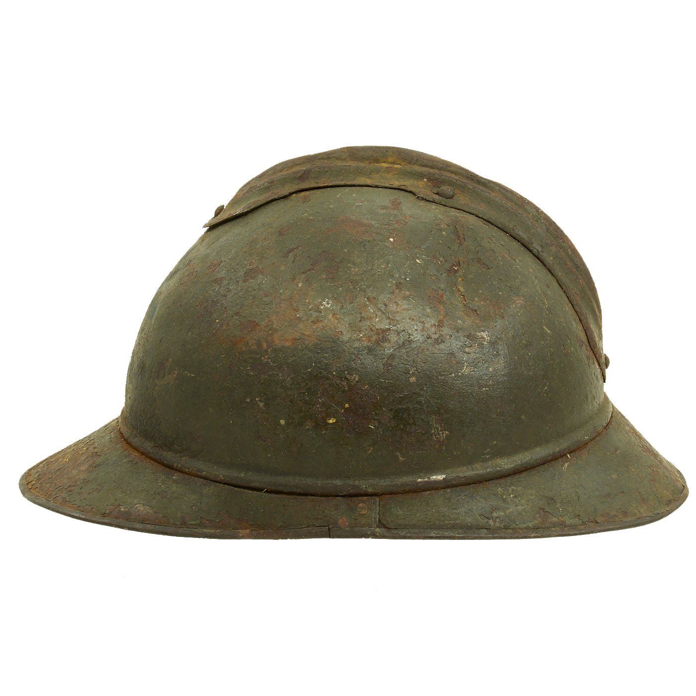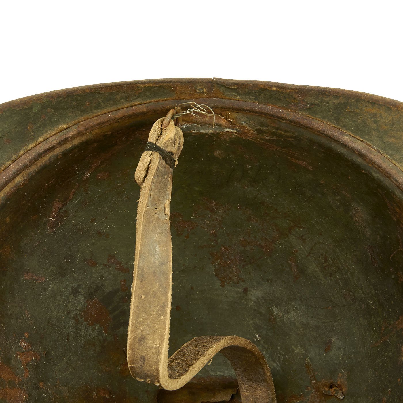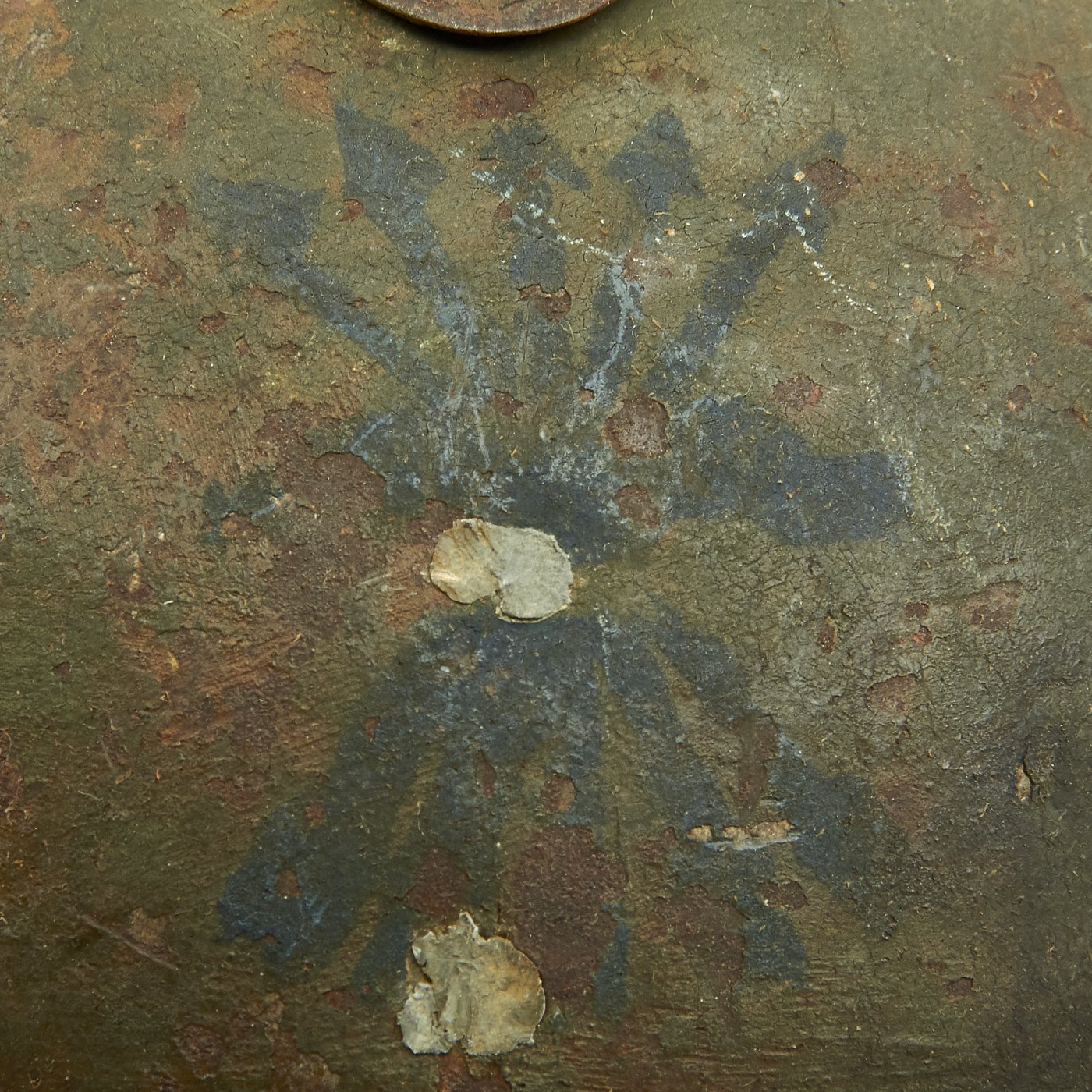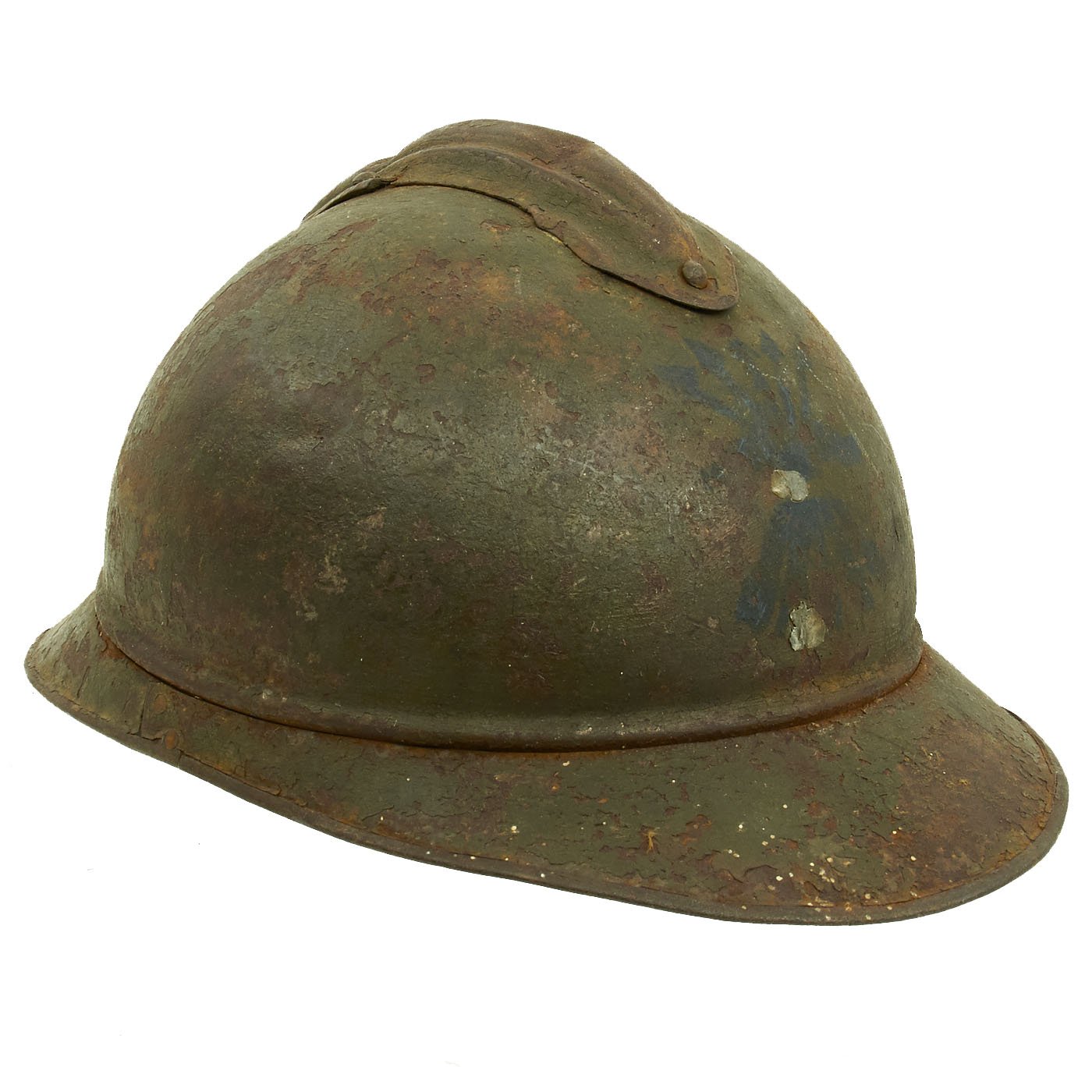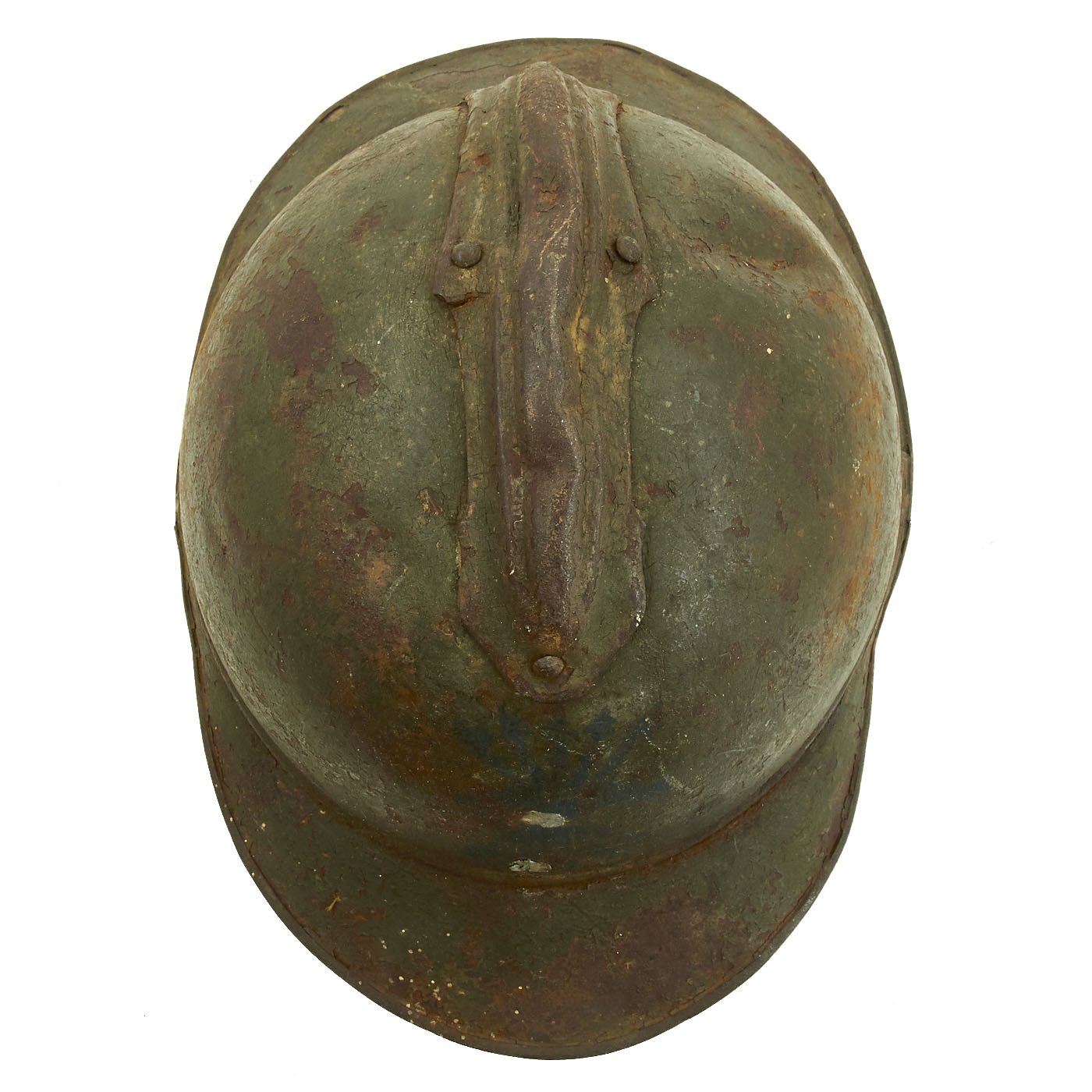 Original Item: Only One Available. The Italian World War One Model 1916 Adrian helmet also referred to as the "Lippmann Model" began to be produced in April 1916. It was a variation of the French M15 Adrian helmet. The Italian M16 is two-piece construction and features a welded on comb as opposed to riveted. The front of this example has an rare original Spanish Civil War yugo y flechas (bow and arrow) insignia of the Spanish Nationalist group the "Black Arrows". Helmet features its original paint and leather chinstrap but he liner and liner band are missing.