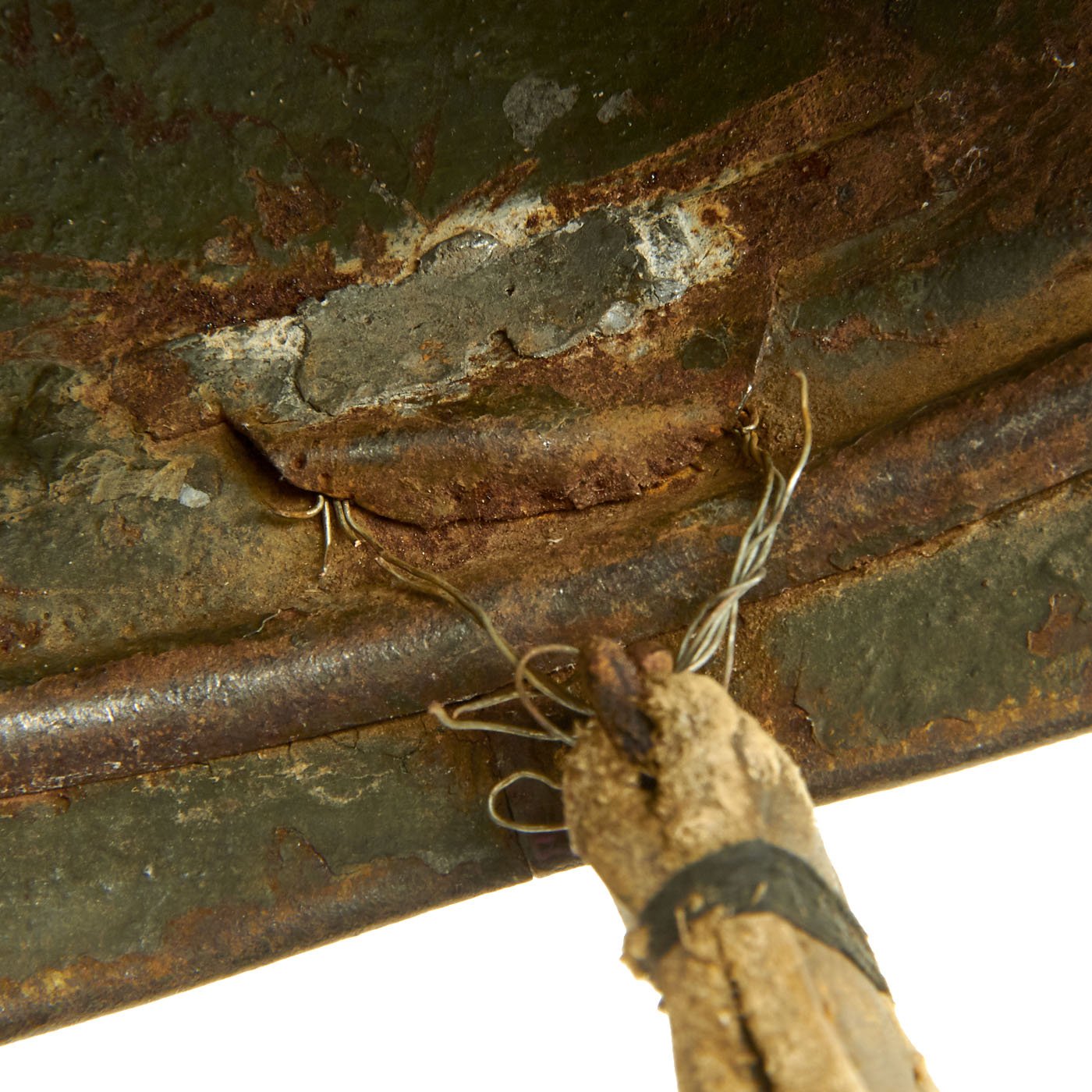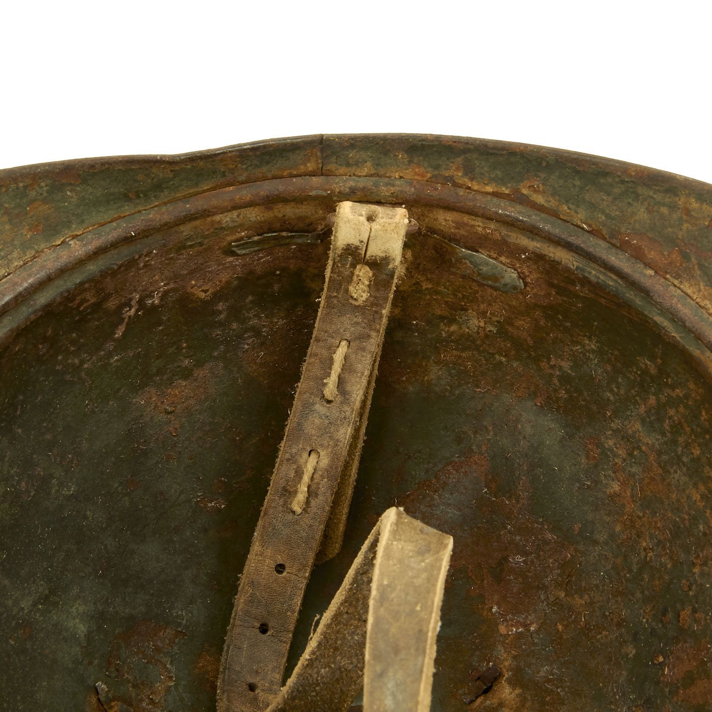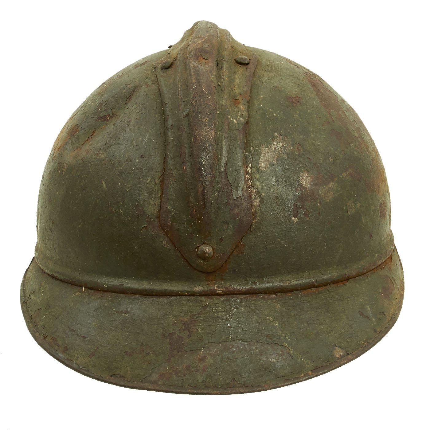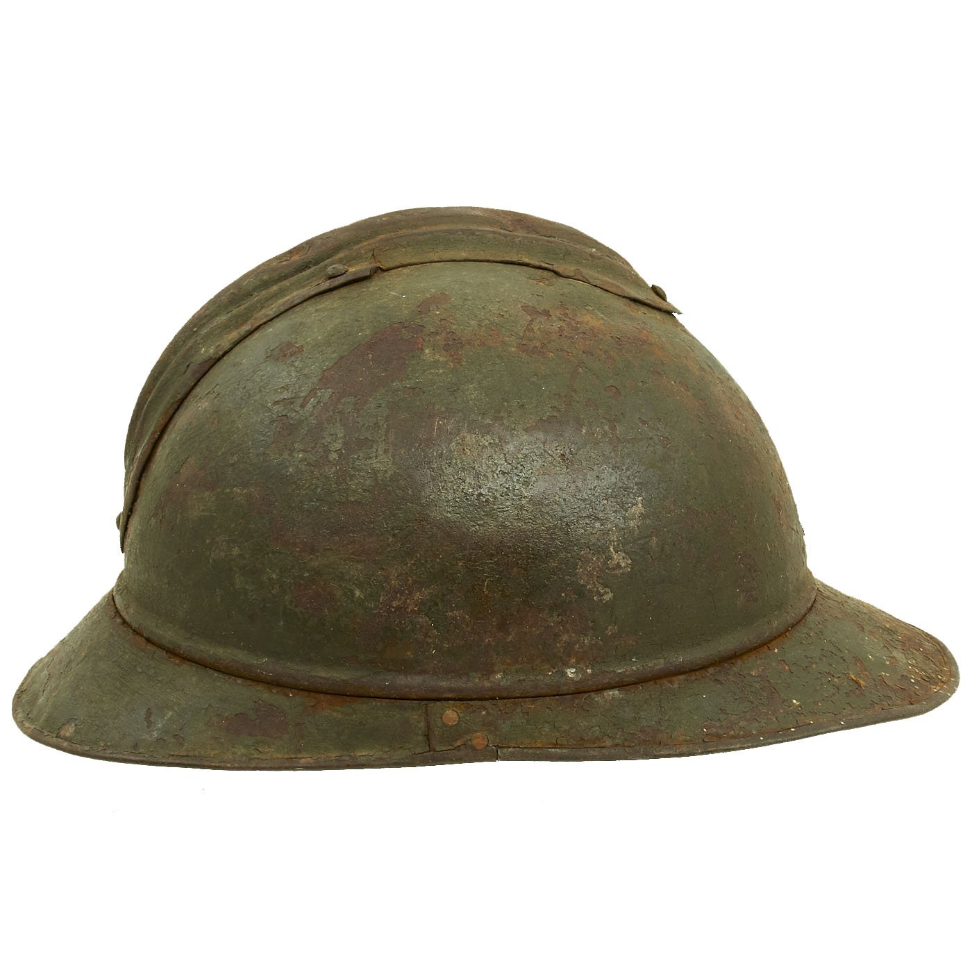 Original Item: Only One Available. The Italian World War One Model 1916 Adrian helmet also referred to as the "Lippmann Model" began to be produced in April 1916. It was a variation of the French M15 Adrian helmet. The Italian M16 is two-piece construction and features a welded on comb as opposed to riveted. The front of this example has an rare original Spanish Civil War yugo y flechas (bow and arrow) insignia of the Spanish Nationalist group the "Black Arrows". Helmet features its original paint and leather chinstrap but he liner and liner band are missing.