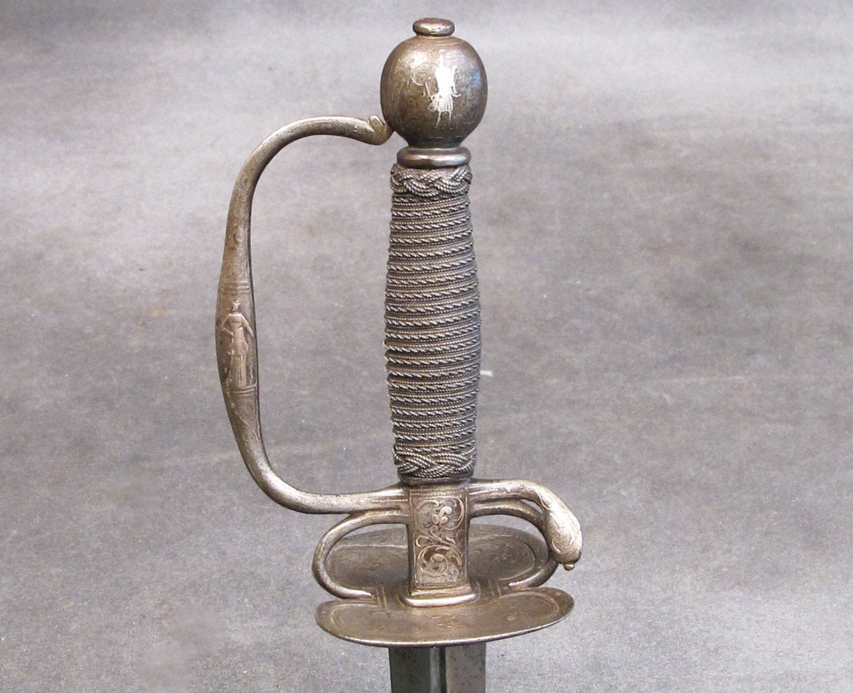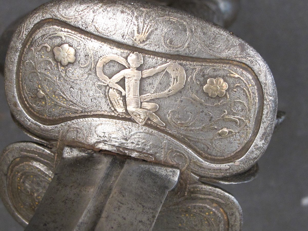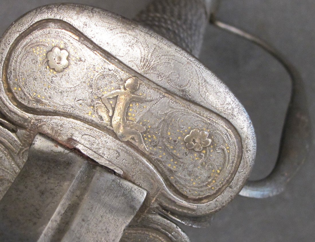 The steel hilt is fully worked with silver inlays of human forms and flowers on every possible surface. The grip appears to be tightly wound silver wire most beautifully executed. The blade, of the highest quality, of course is Spanish dating probably from the mid 17th Century but has been mounted in this small sword style very possibly in France around 1690-1720 and typical of the late Louis XIV period. Just the period of the Three Musketeers!
