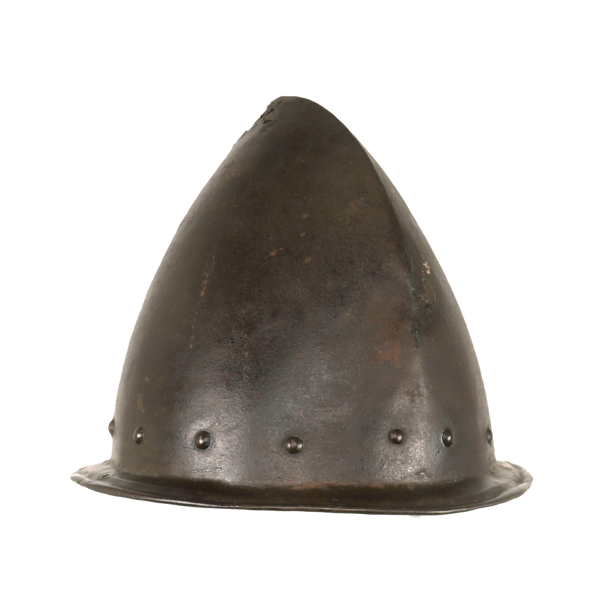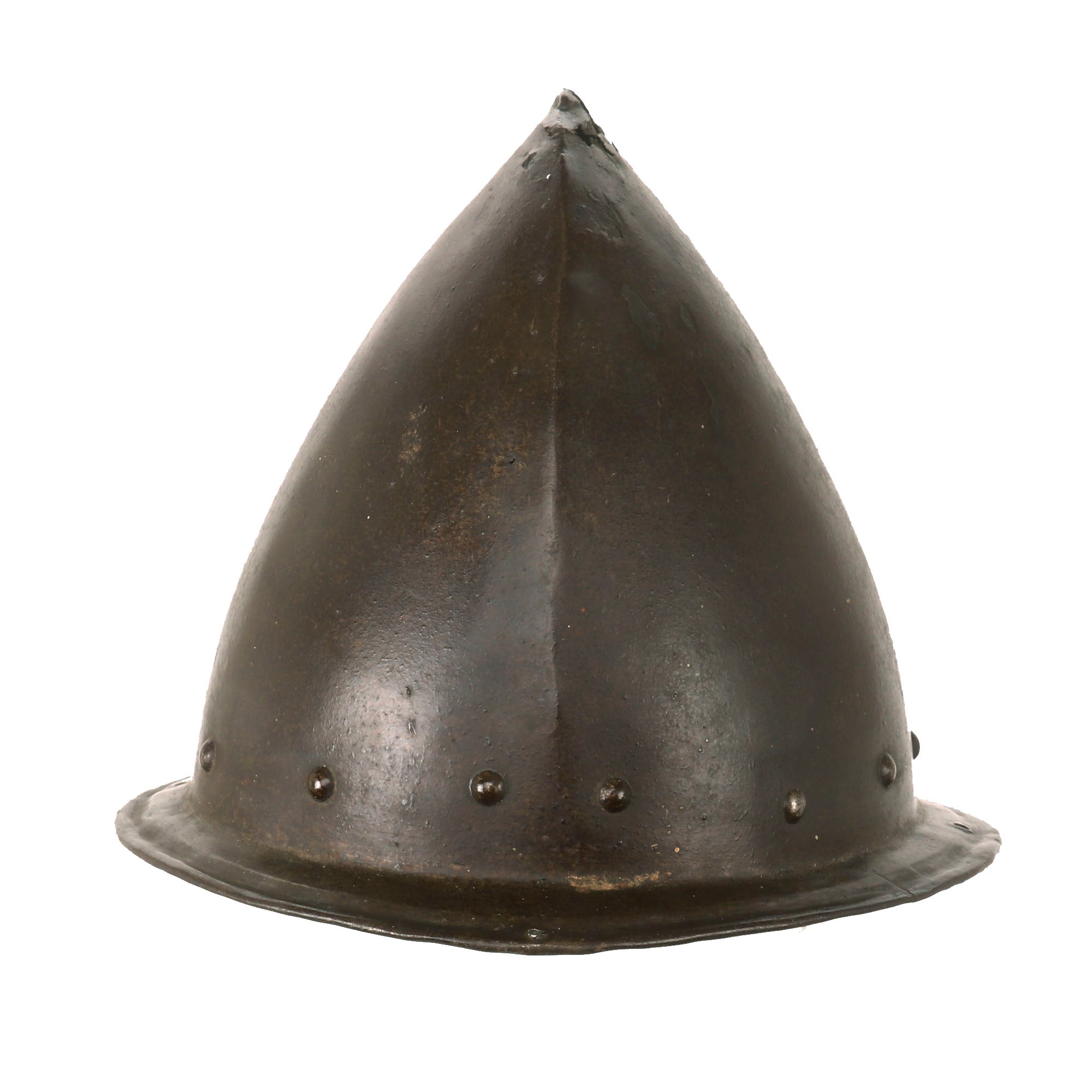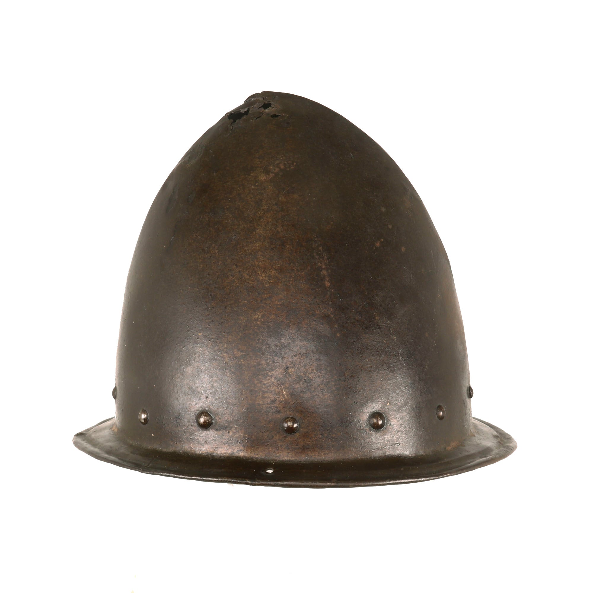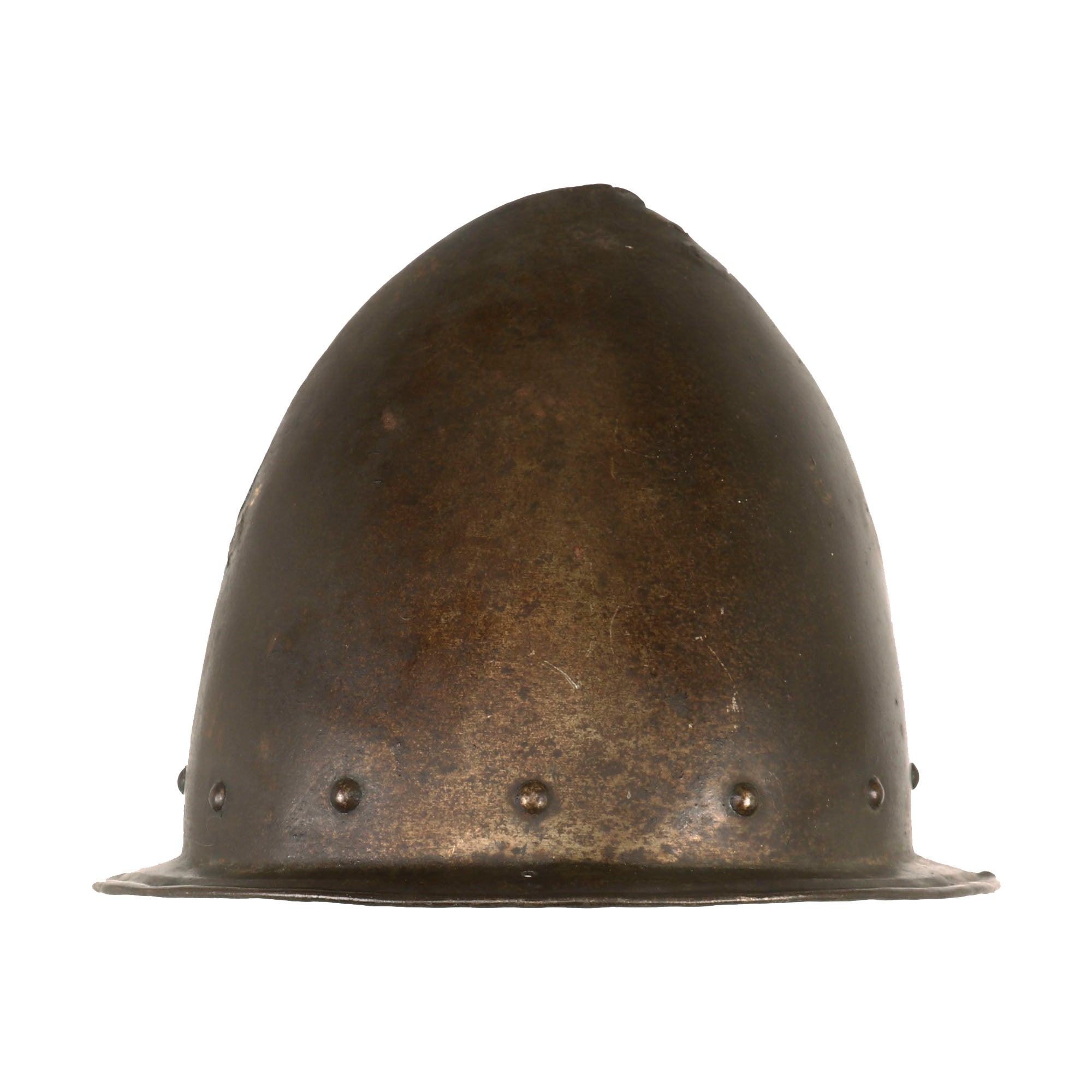 Original Item: Only One Available. This helmet was constructed of two overlapping pieces of iron which were hammered and riveted together. Along the narrow brim is a row of riveted holes that would have included a band of leather secured by said rivets. This leather band would have been stitched to a fabric helmet lining, which is no longer present.Cabasset, from the Spanish word capacete, meaning “little cap” was a light helmet similar to the Burgonet helmet, cabasset helmets were used in the 16th and 17th centuries by light cavalry and infantrymen in Europe.This helmet is in lovely condition for its age! As mentioned, there is no cloth or leather still present in this example, but the rivets are still present on the side. Since arrows weren’t really capable of piercing armor, this helmet could have fallen victim to target practice. There are also some small rusting holes near the top as shown, as is expected from helmets of this age.Comes more than ready for further research and display!