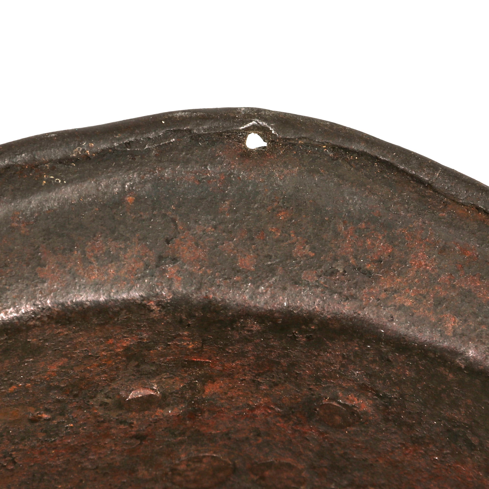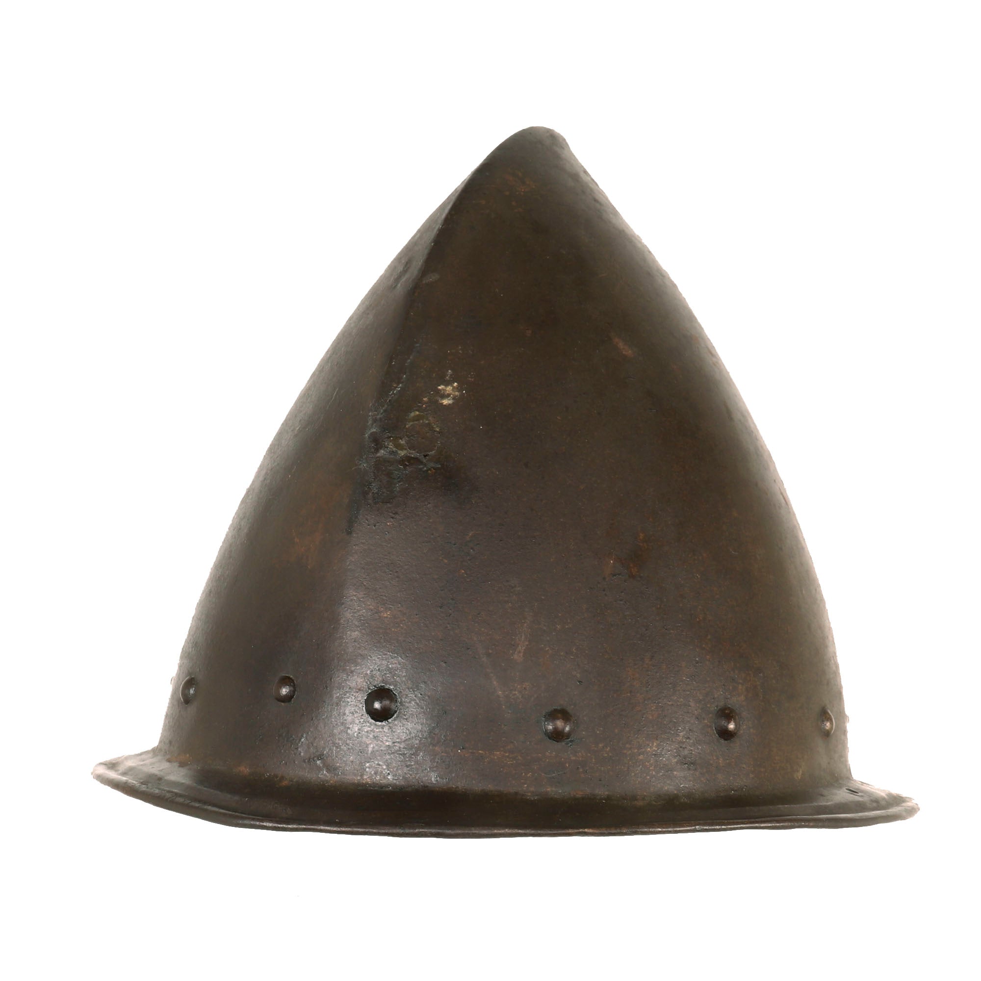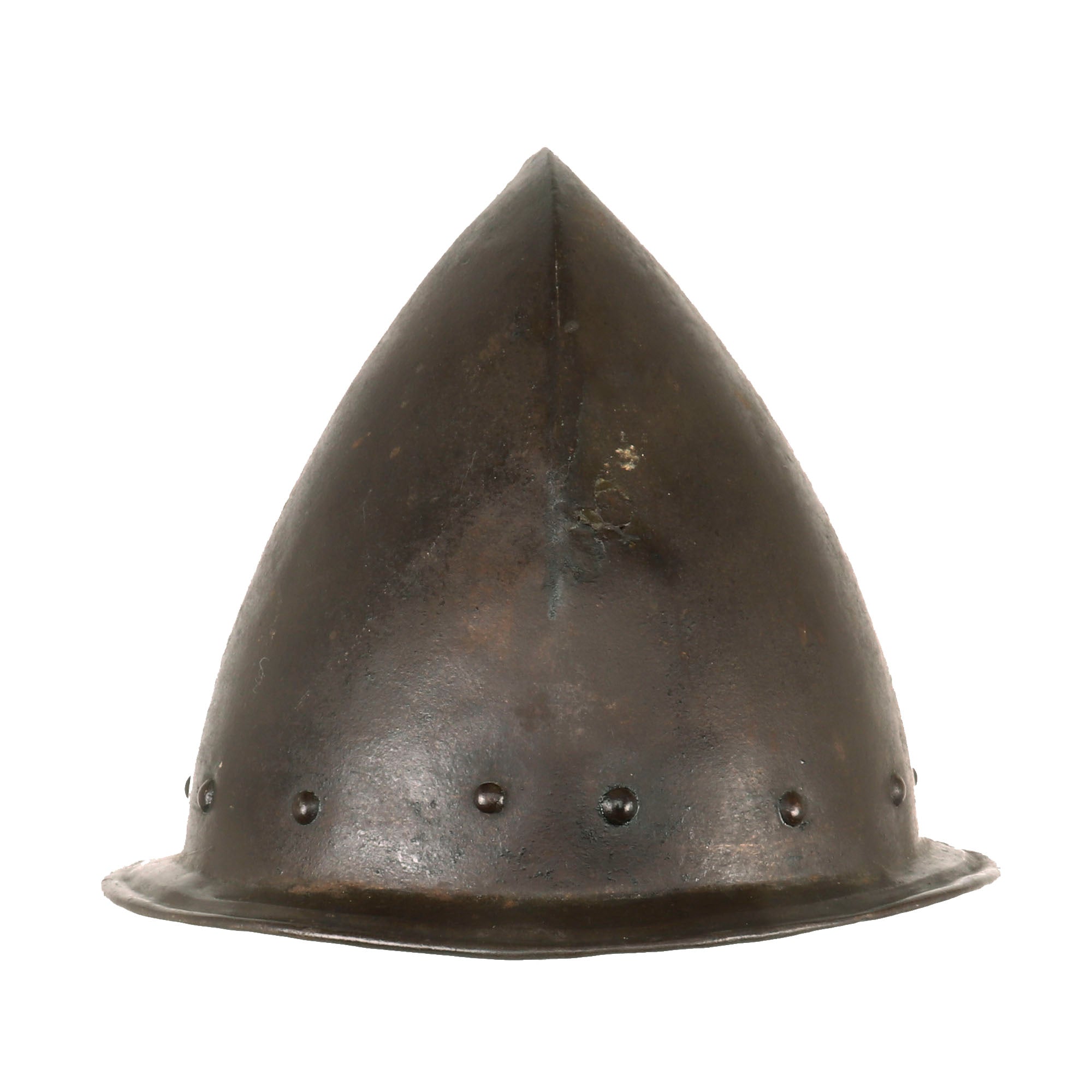Original Item: Only One Available. This helmet was constructed of two overlapping pieces of iron which were hammered and riveted together. Along the narrow brim is a row of riveted holes that would have included a band of leather secured by said rivets. This leather band would have been stitched to a fabric helmet lining, which is no longer present.Cabasset, from the Spanish word capacete, meaning “little cap” was a light helmet similar to the Burgonet helmet, cabasset helmets were used in the 16th and 17th centuries by light cavalry and infantrymen in Europe.This helmet is in lovely condition for its age! As mentioned, there is no cloth or leather still present in this example, but the rivets are still present on the side. Since arrows weren’t really capable of piercing armor, this helmet could have fallen victim to target practice. There are also some small rusting holes near the top as shown, as is expected from helmets of this age.Comes more than ready for further research and display!