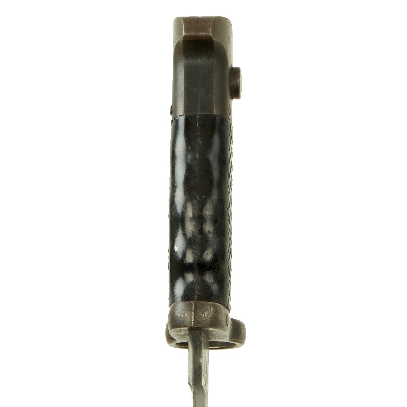 The design features an unfullered "bolo" blade, with a black checkered plastic grip and large muzzle ring to fit around the flash hider. The bayonet mounting slot is in the bottom of the bayonet, and it attaches to a unique rectangular mount on the CETME rifle. The bayonet has the correct markings on the blade ricasso, which are the Coat of Arms of Toledo and the INI Factory Insignia.