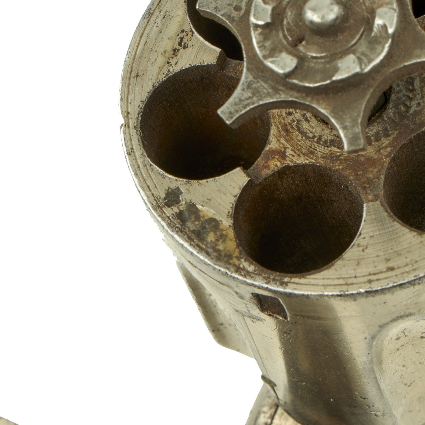The revolver is in good condition, with a lot of wear overall, and definitely looks to have seen long service. The bore shows clear lands and grooves, with some areas of oxidation. The frame brakes open correctly, and the ejector presents, though it does not release inward when fully open. The revolver does cycle, however the internals are worn, as is the cylinder lock, so it does not index correctly at present.