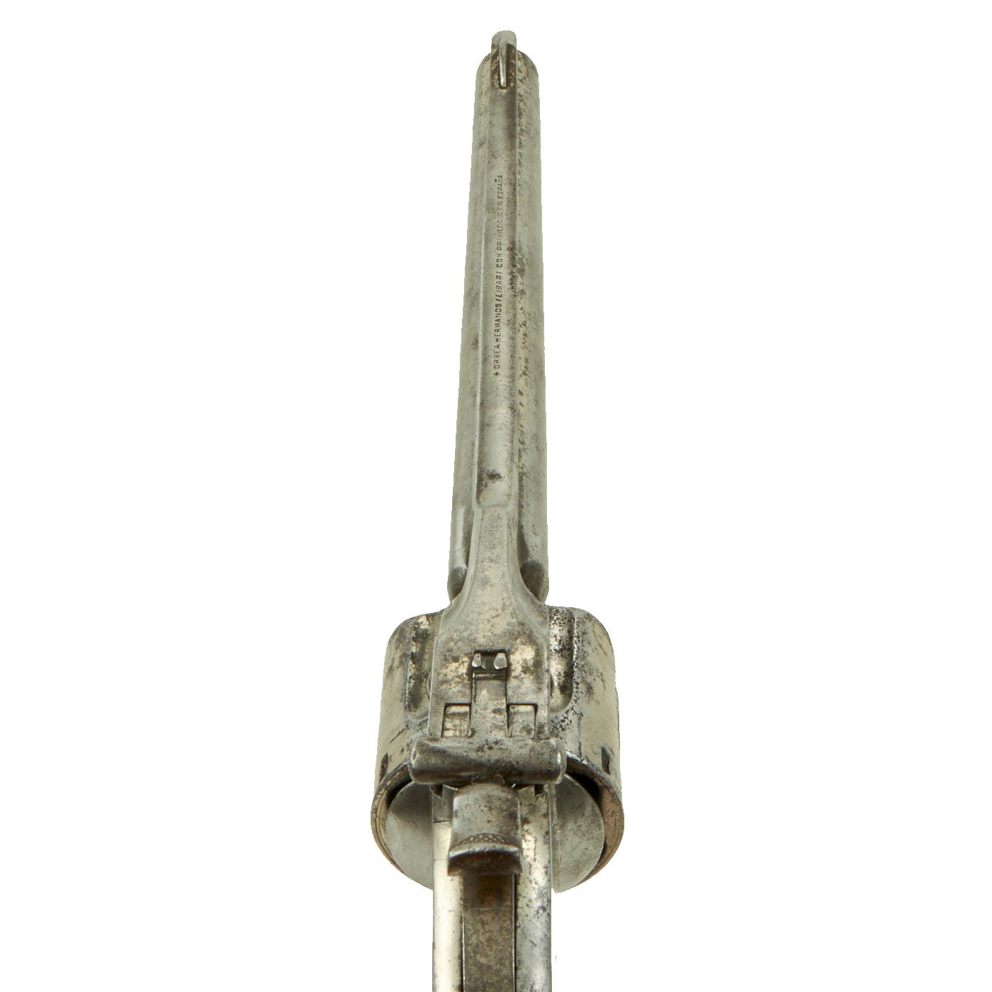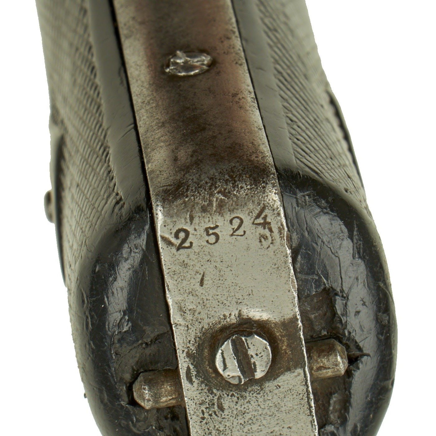 As there are no Russian markings on the revolver, this was definitely a private purchase example, possibly sold in Spain or else where in Europe. Russian contract guns would have Russian acceptance markings, and usually were marked in Cyrillic across the top of the barrel rib. The revolver looks to have been at least partially nickel plated at some point, which is still present on the cylinder and on the left side of the revolver. The serial number 2524 is still visible on the bottom grip frame, and the grip scales look to be bakelite or gutta percha. They were originally checkered, but that has now worn on both sides, and also they look to have shrunk over the years, so they do not quite fit correctly anymore. Both are marked with the O.H. (Orbea Hermanos) logo at the top.