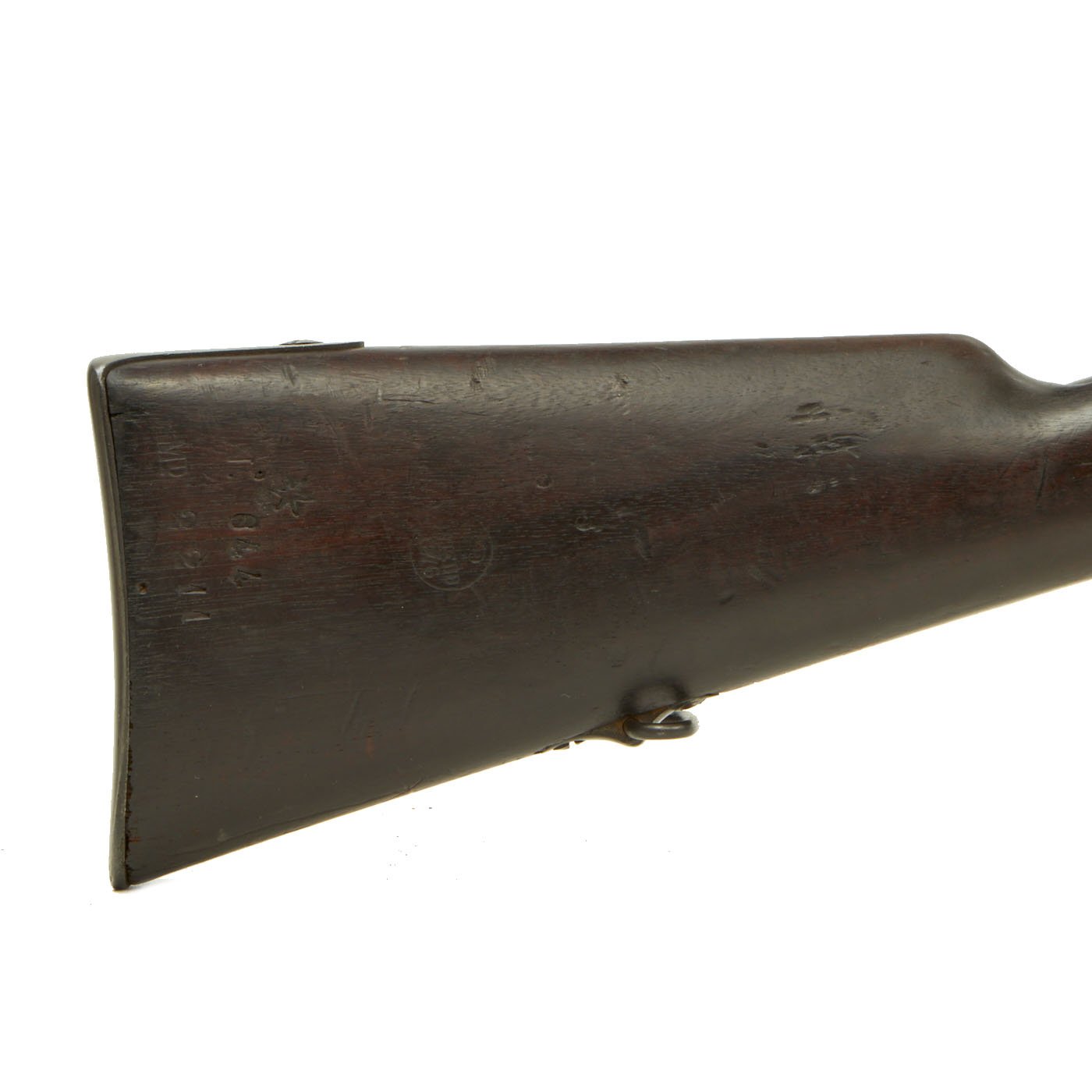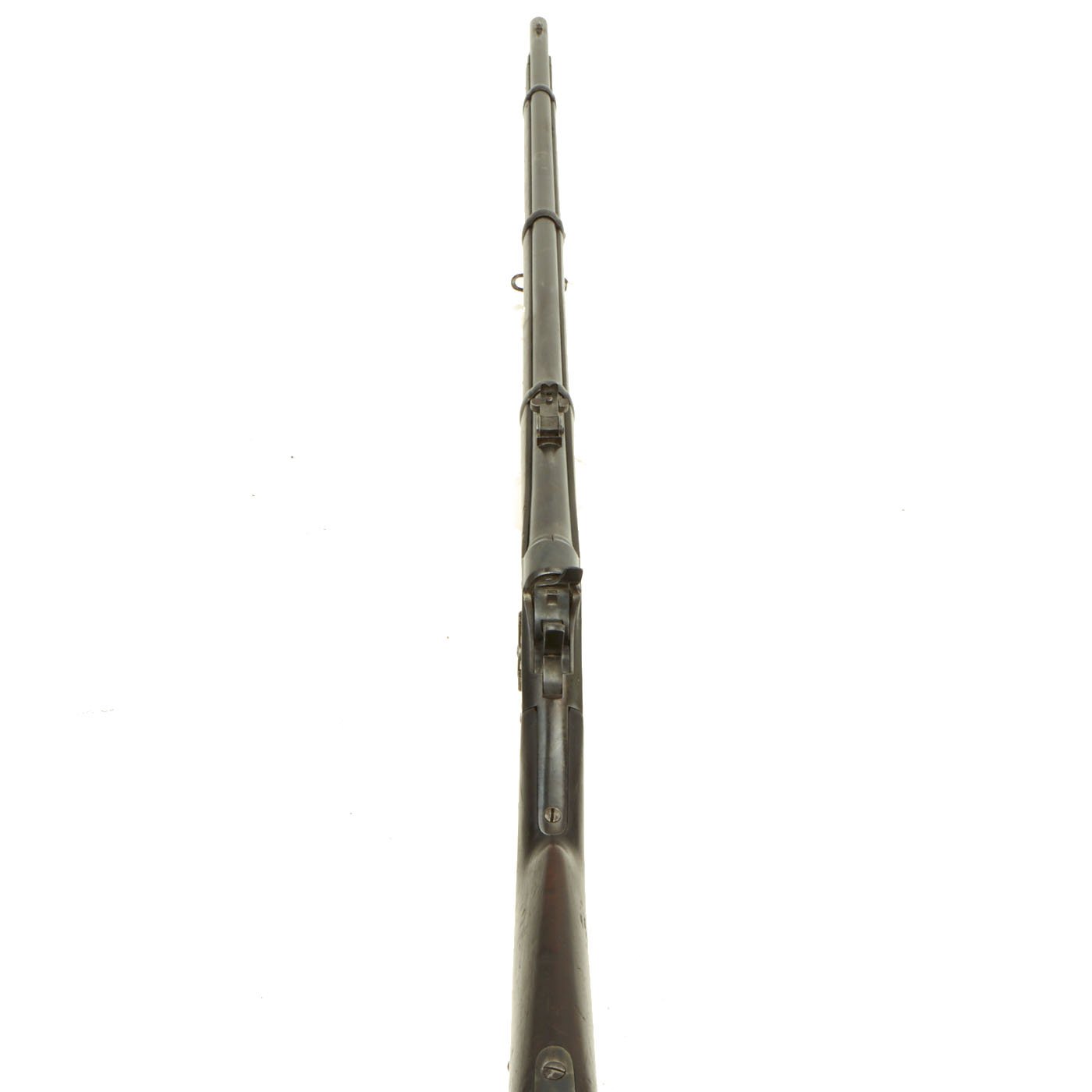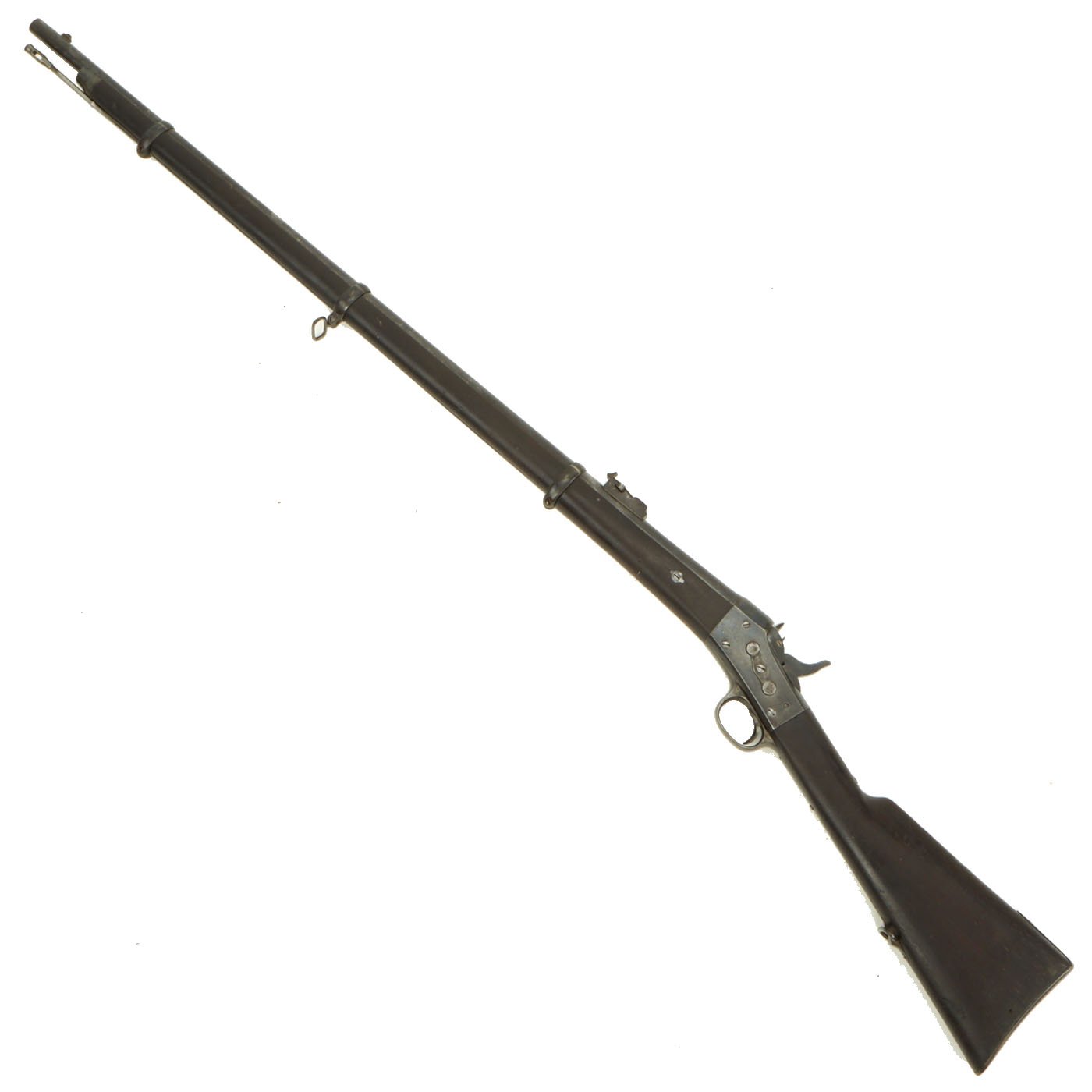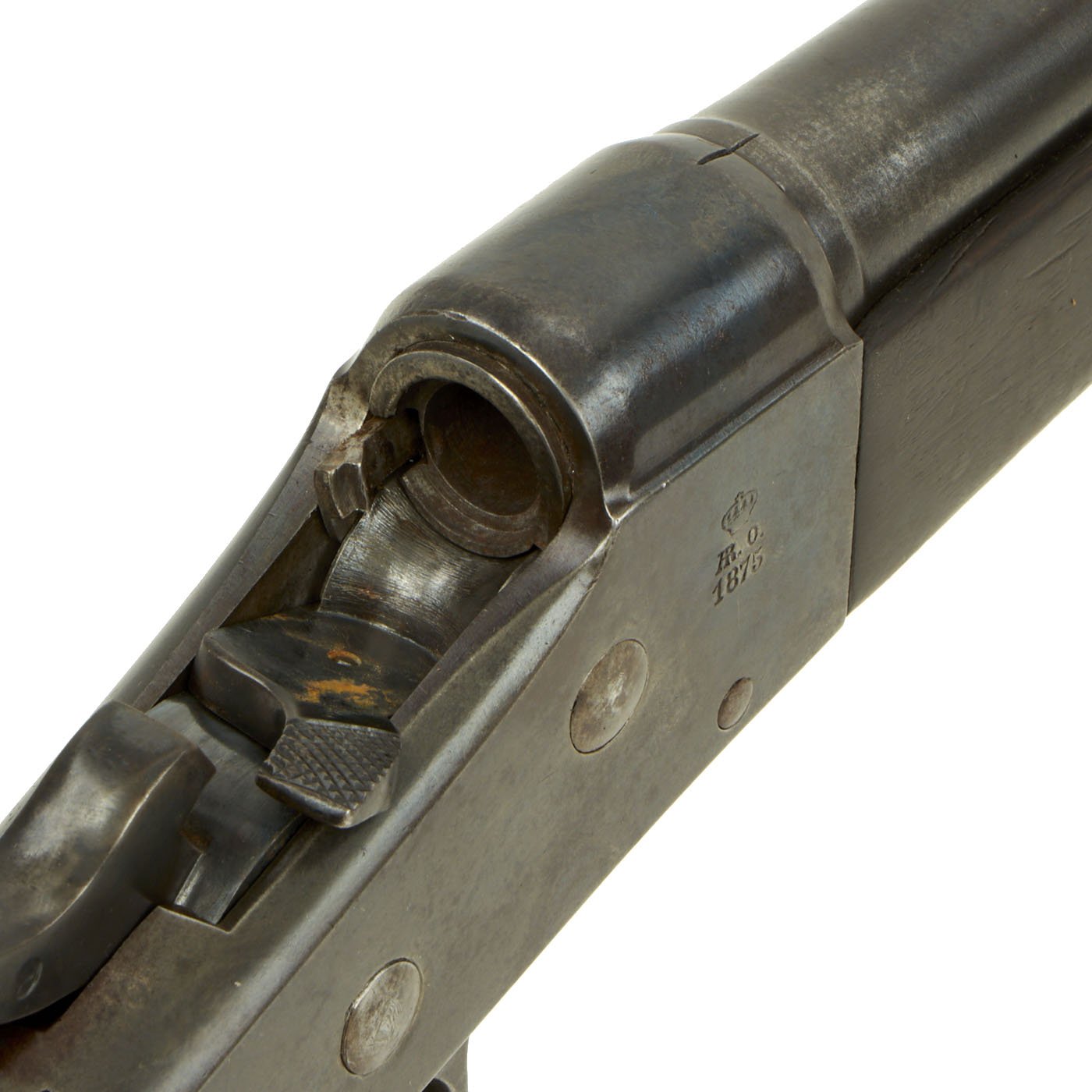 The three band Full Length rifle we offer here is a classic Spanish Oviedo Arsenal produced example, clearly stamped with CROWN / AR. O. / 1875 on right side of action. This is the Royal Cypher of Alfonso XII of Spain, who reigned from 1874 to 1885. It has the characteristic fore-stock bolt, as well as the firing pin retractor, not seen in the Remington-produced guns. It also has serial number No. 640 stamped into the wood butt, over MD 2211. It even still has a stamped cartouche reading Crown / OVIEDO / 1876, for the Oviedo armory near Madrid where it was produced. Overall length is 52 inches, with a 37 inch barrel. The side of the barrel at the woodline is marked “R” for Reformado.